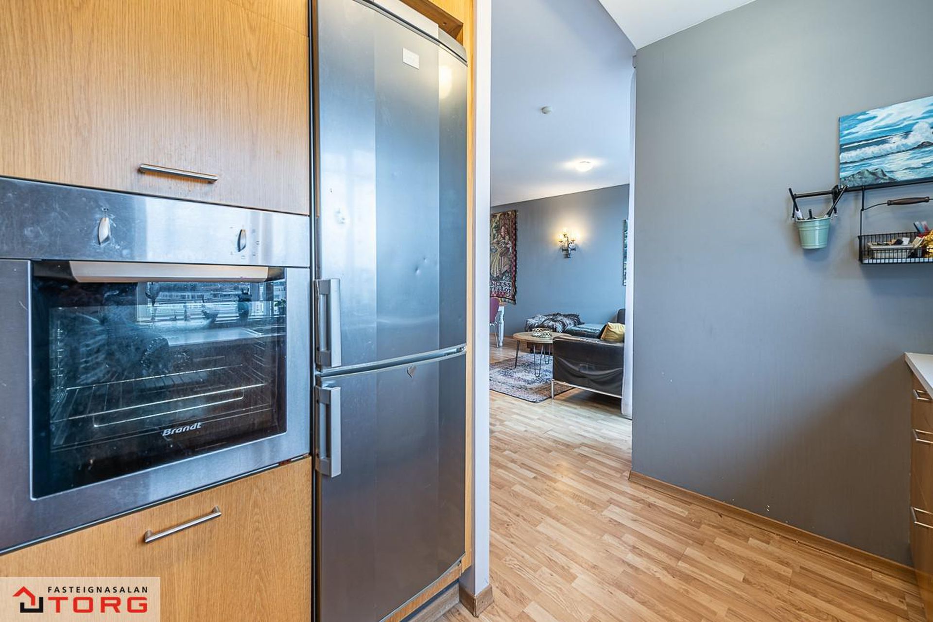 Eldhús: Eikarinnrétting, gott skápapláss, nýlegt parket á gólfi.