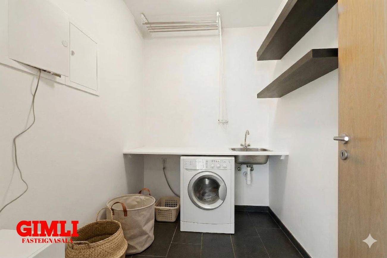 Þvottahús: innan íbúðar. Flísar á gólfi, borðplata með skolvaski.