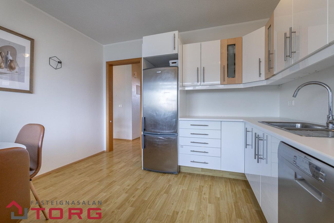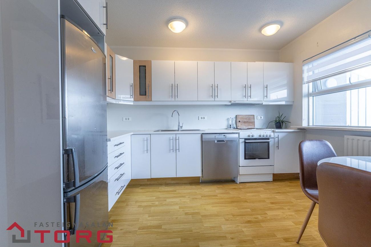 Þegar gengið er upp stigan er eldhús á vinstri hönd, parket á gólfi