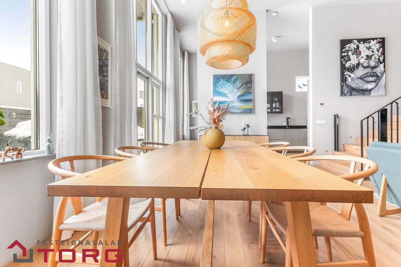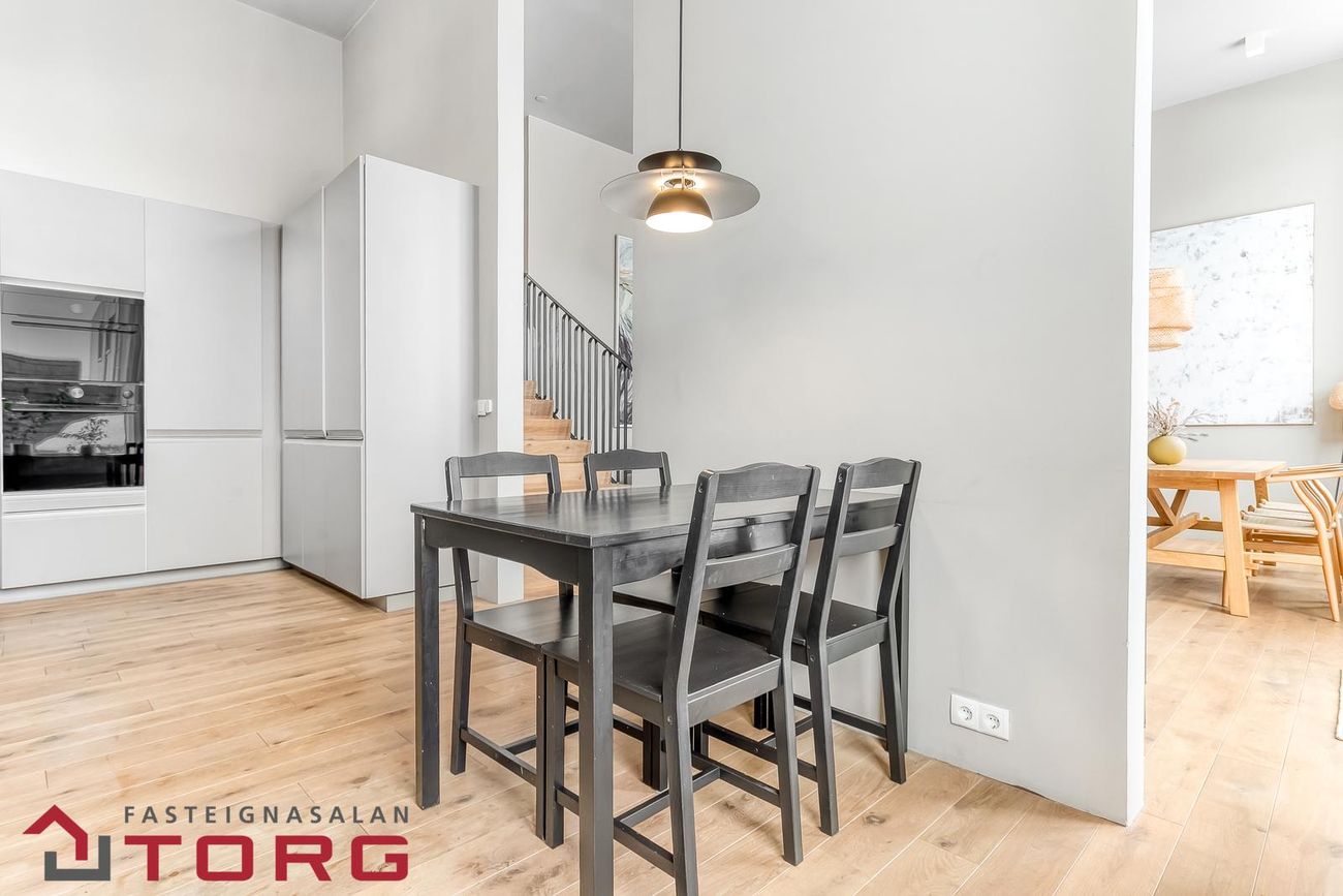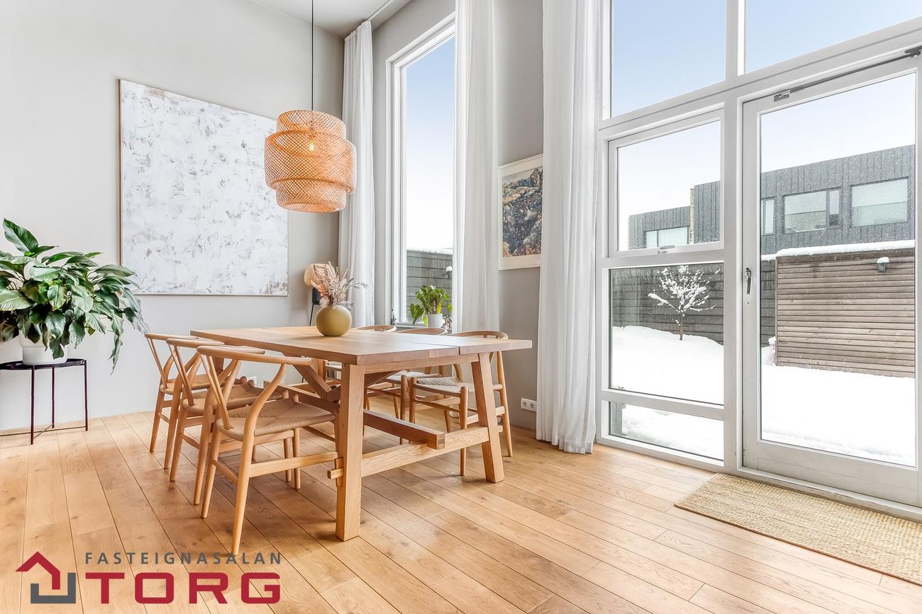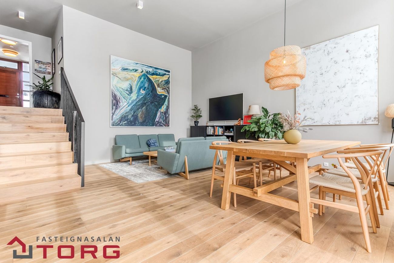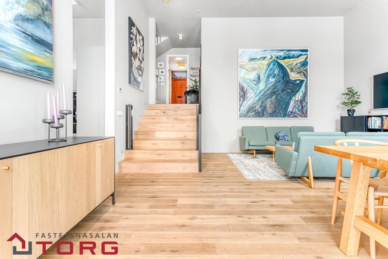 Neðri hæð: Mikil lofthæð, björt og falleg með gegnheilu viðarparketi. Gólfsíðar gardínur fylgja ásamt tveimur vínkælum, ísskáp og uppþvottavél. Eldhús: Nýleg falleg U-laga dökk dröppuð innrétting með akrílstein frá Svansverk. Innbyggður ísskápur, uppþvottavél og vínkælir. Tveir bakaraofnar í vinnuhæð. Mjög gott skápapláss með búrskáp. Gegnheilt viðarparket á gólfi og mikil lofthæð. Eldhús og stofa/borðstofa eru samtengd.