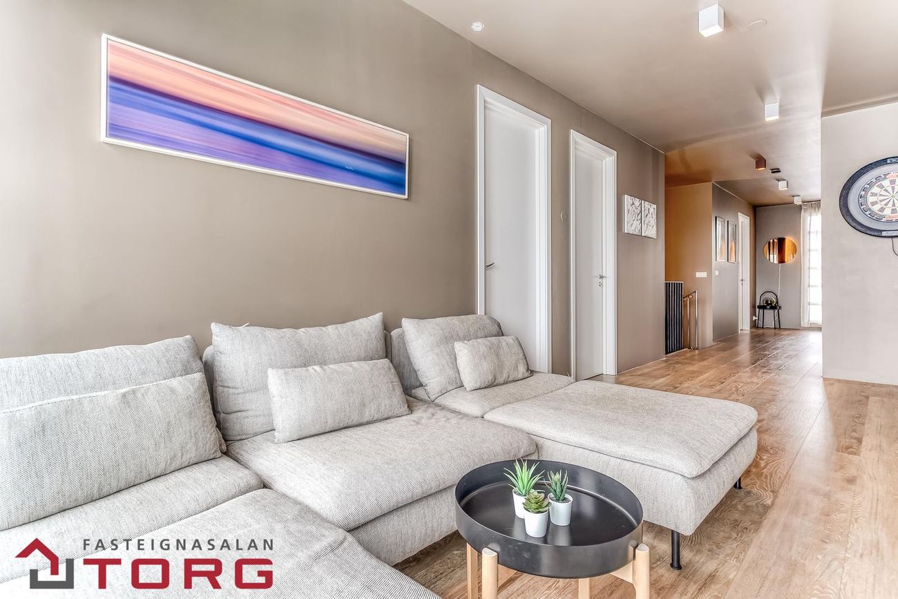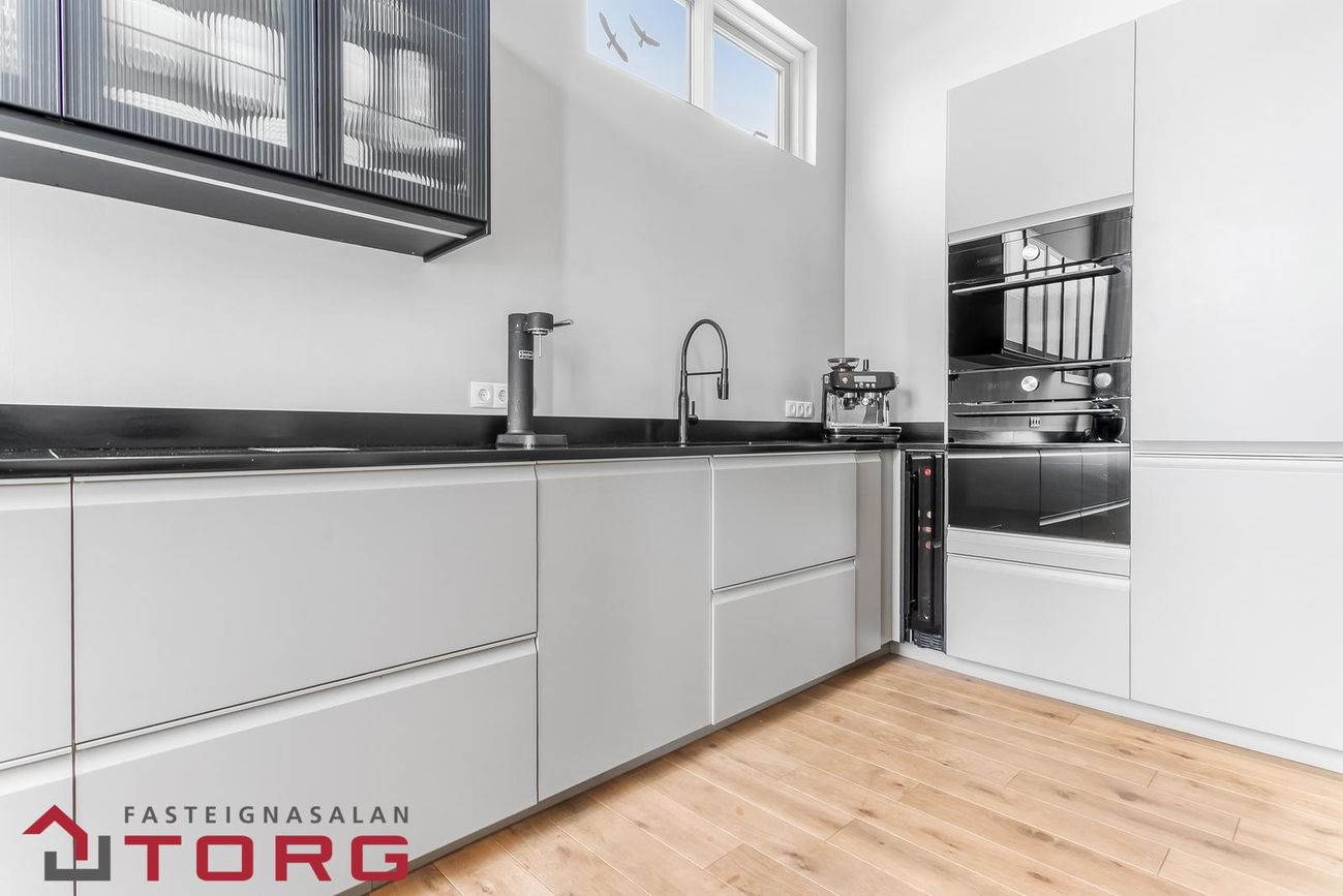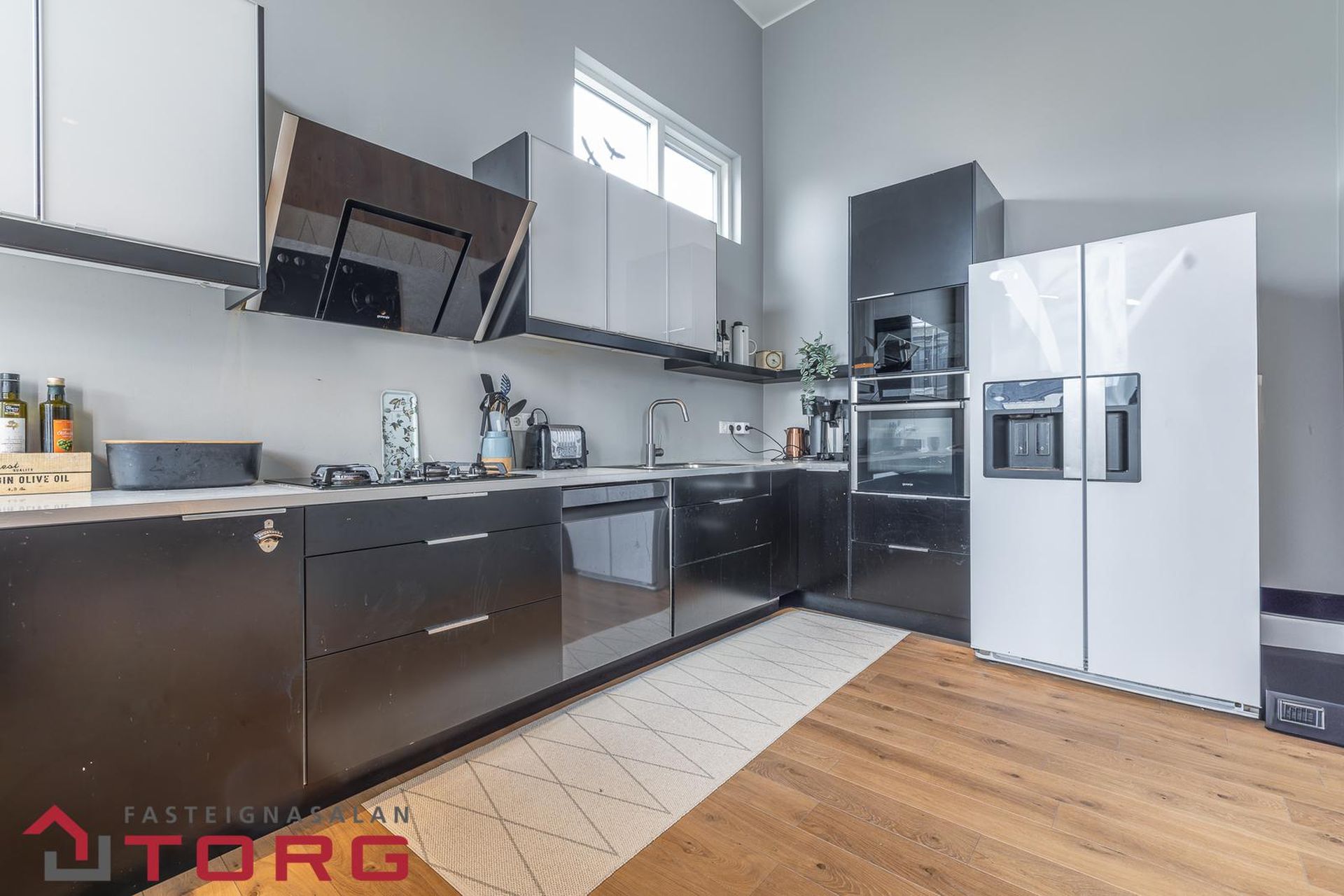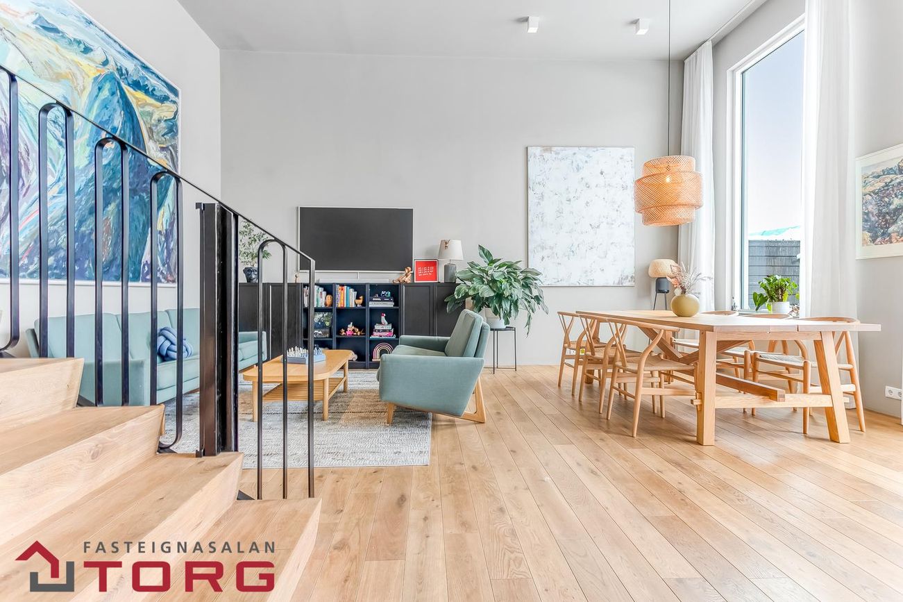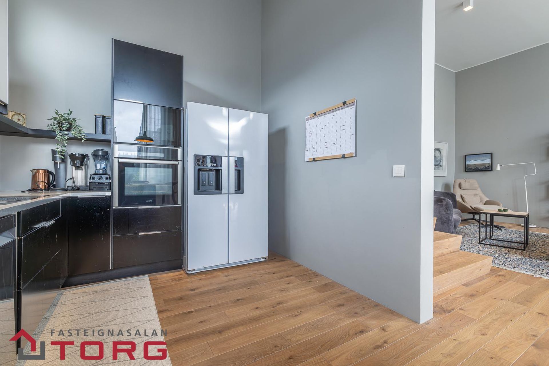 Neðri hæð: Mikil lofthæð, björt og falleg með gegnheilu viðarparketi. Gólfsíðar gardínur fylgja ásamt tveimur vínkælum, ísskáp og uppþvottavél. Eldhús: Nýleg falleg U-laga dökk dröppuð innrétting með akrílstein frá Svansverk. Innbyggður ísskápur, uppþvottavél og vínkælir. Tveir bakaraofnar í vinnuhæð. Mjög gott skápapláss með búrskáp. Gegnheilt viðarparket á gólfi og mikil lofthæð. Eldhús og stofa/borðstofa eru samtengd.
