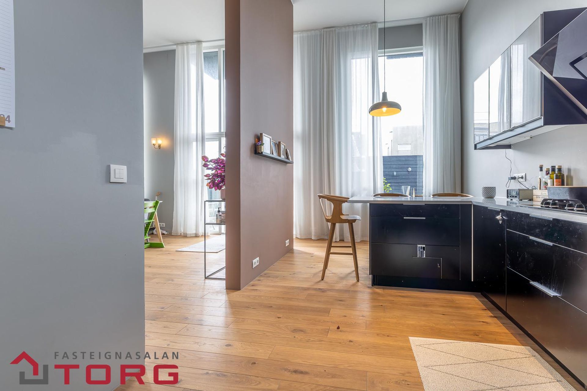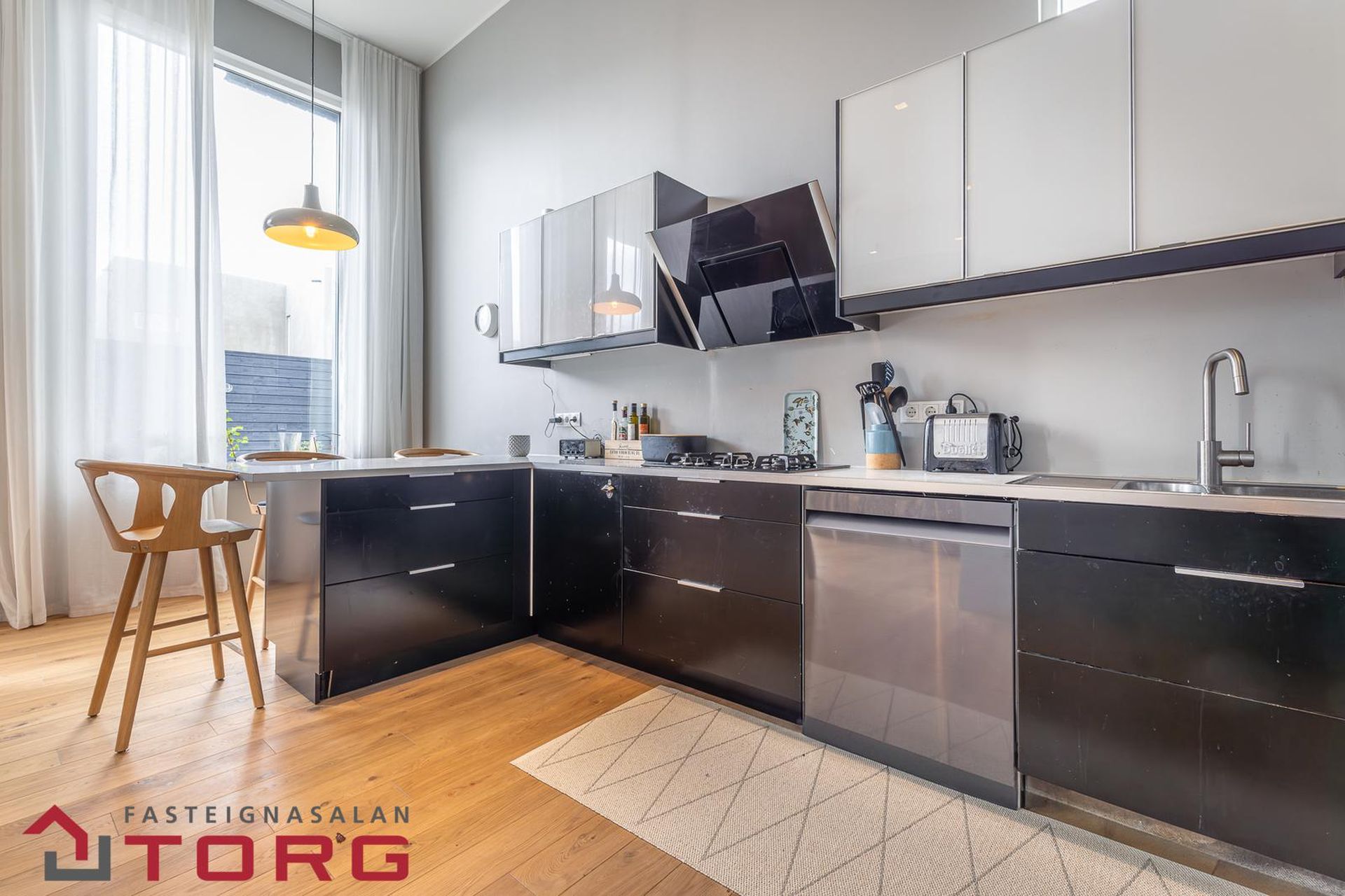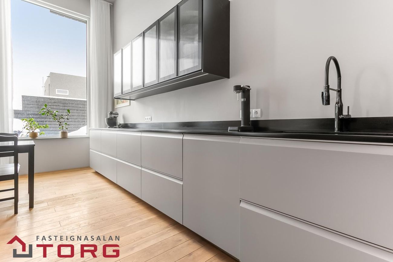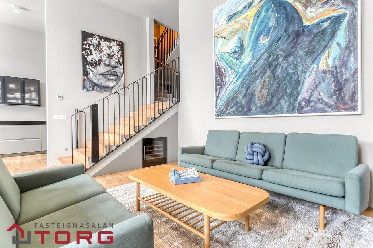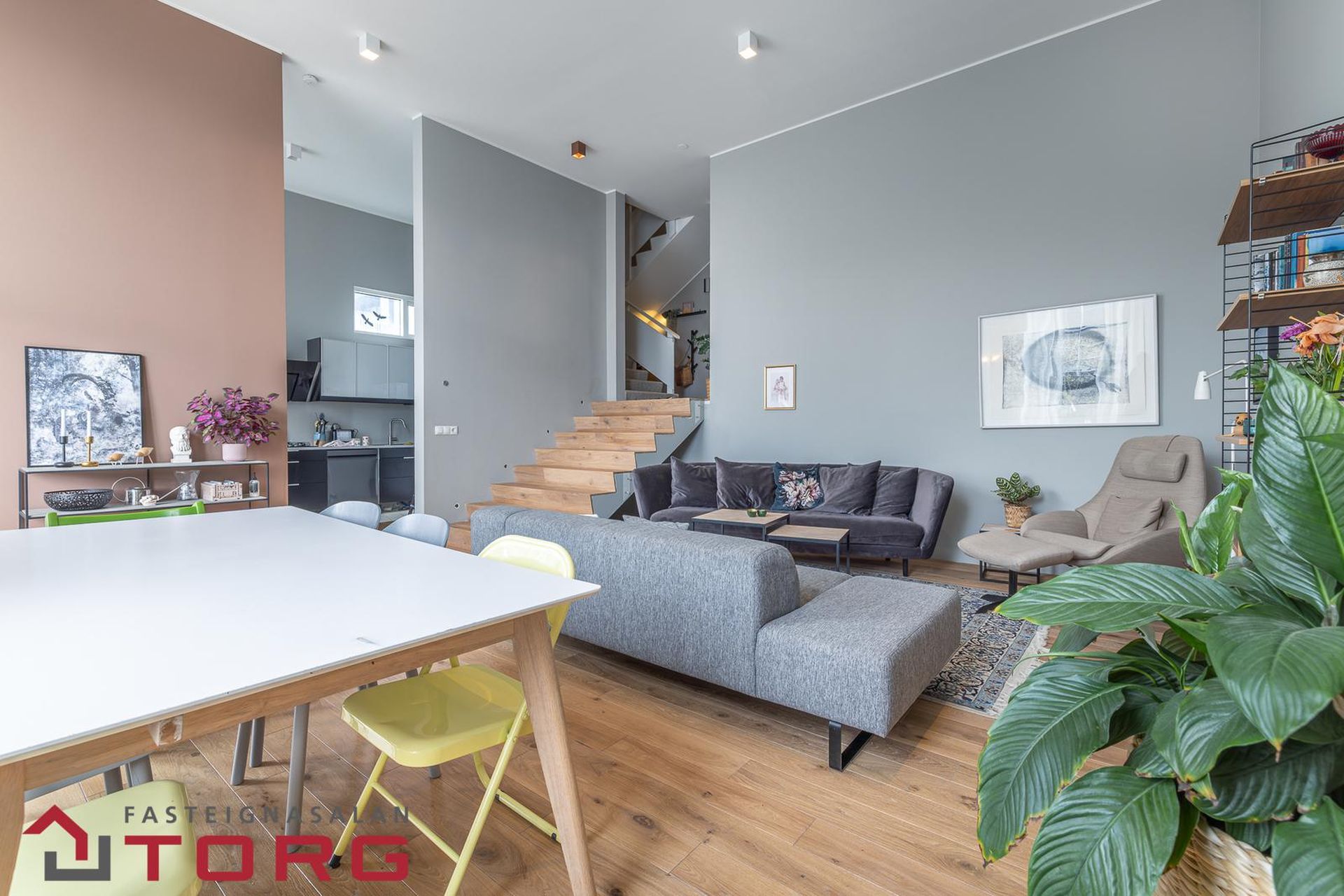 Neðri hæð: Mikil lofthæð, björt og falleg með gegnheilu viðarparketi. Gólfsíðar gardínur fylgja ásamt tveimur vínkælum, ísskáp og uppþvottavél. Eldhús: Nýleg falleg U-laga dökk dröppuð innrétting með akrílstein frá Svansverk. Innbyggður ísskápur, uppþvottavél og vínkælir. Tveir bakaraofnar í vinnuhæð. Mjög gott skápapláss með búrskáp. Gegnheilt viðarparket á gólfi og mikil lofthæð. Eldhús og stofa/borðstofa eru samtengd.