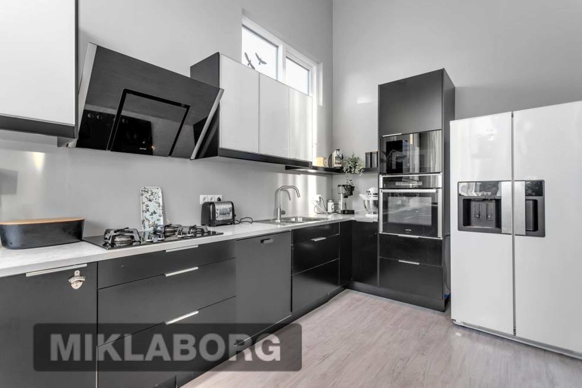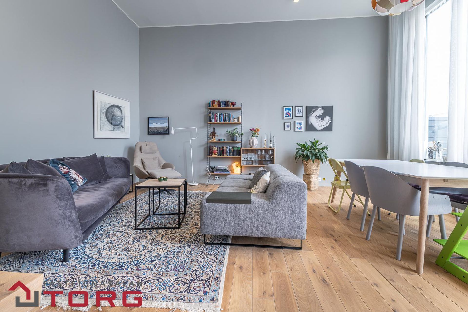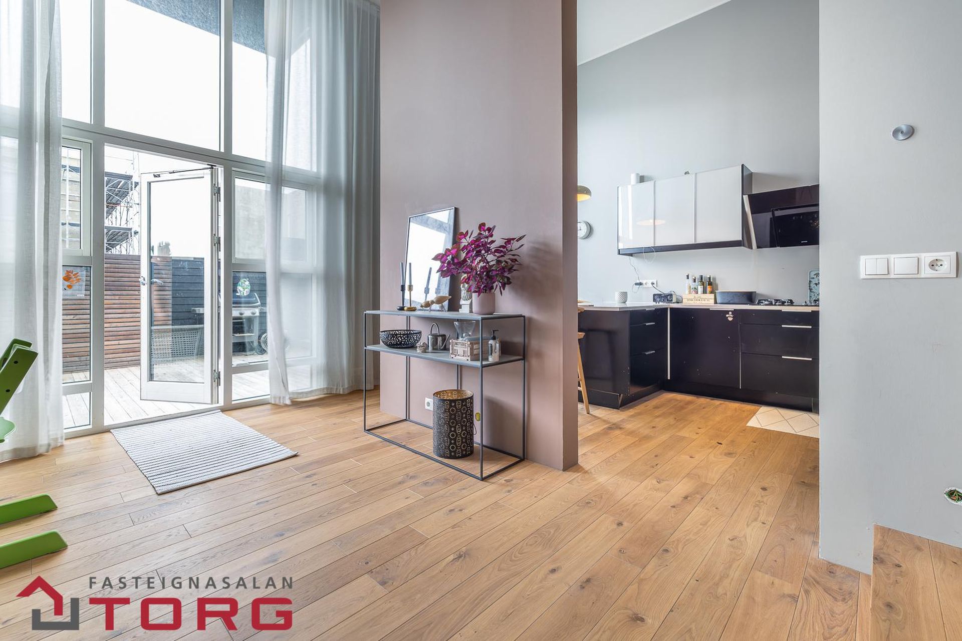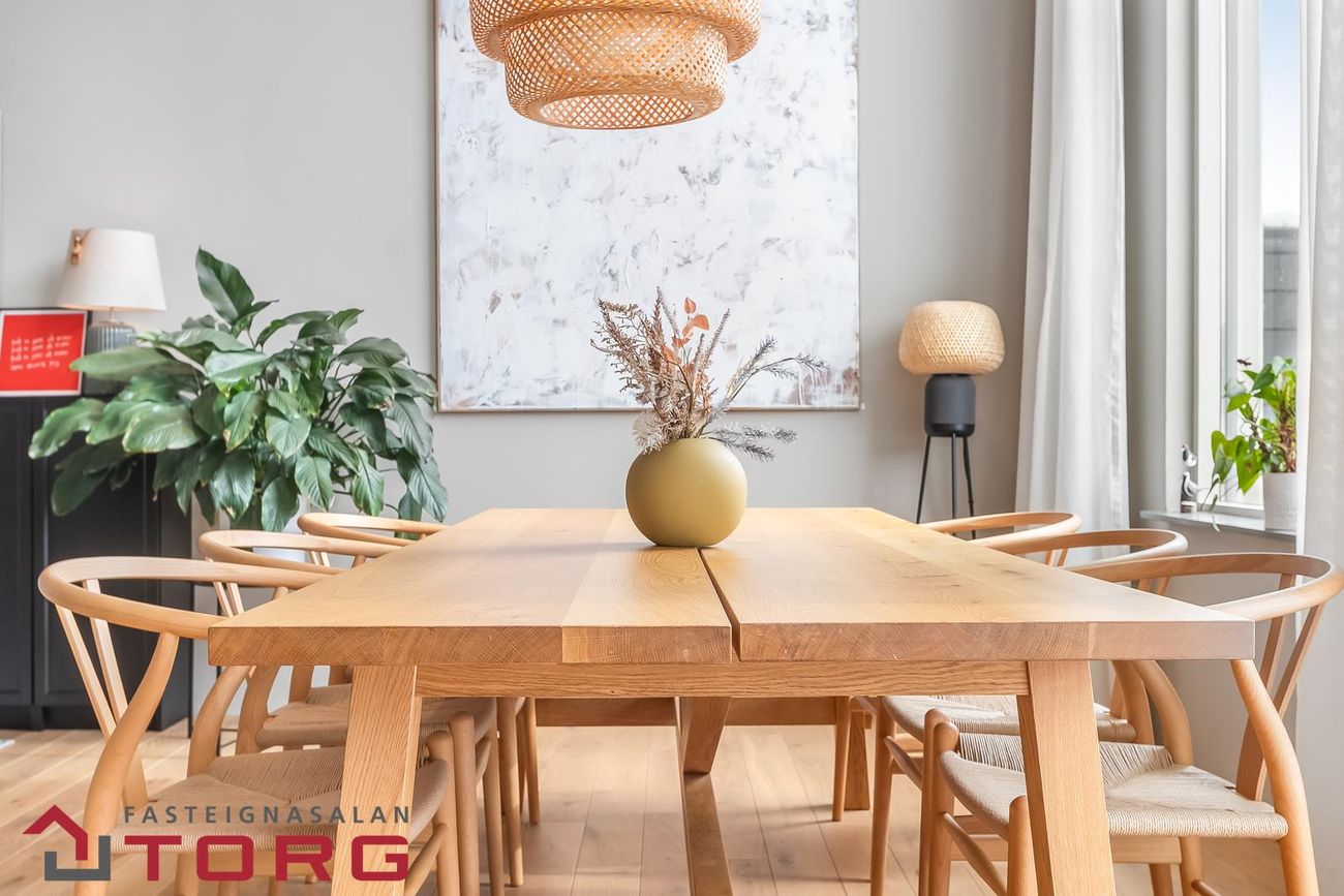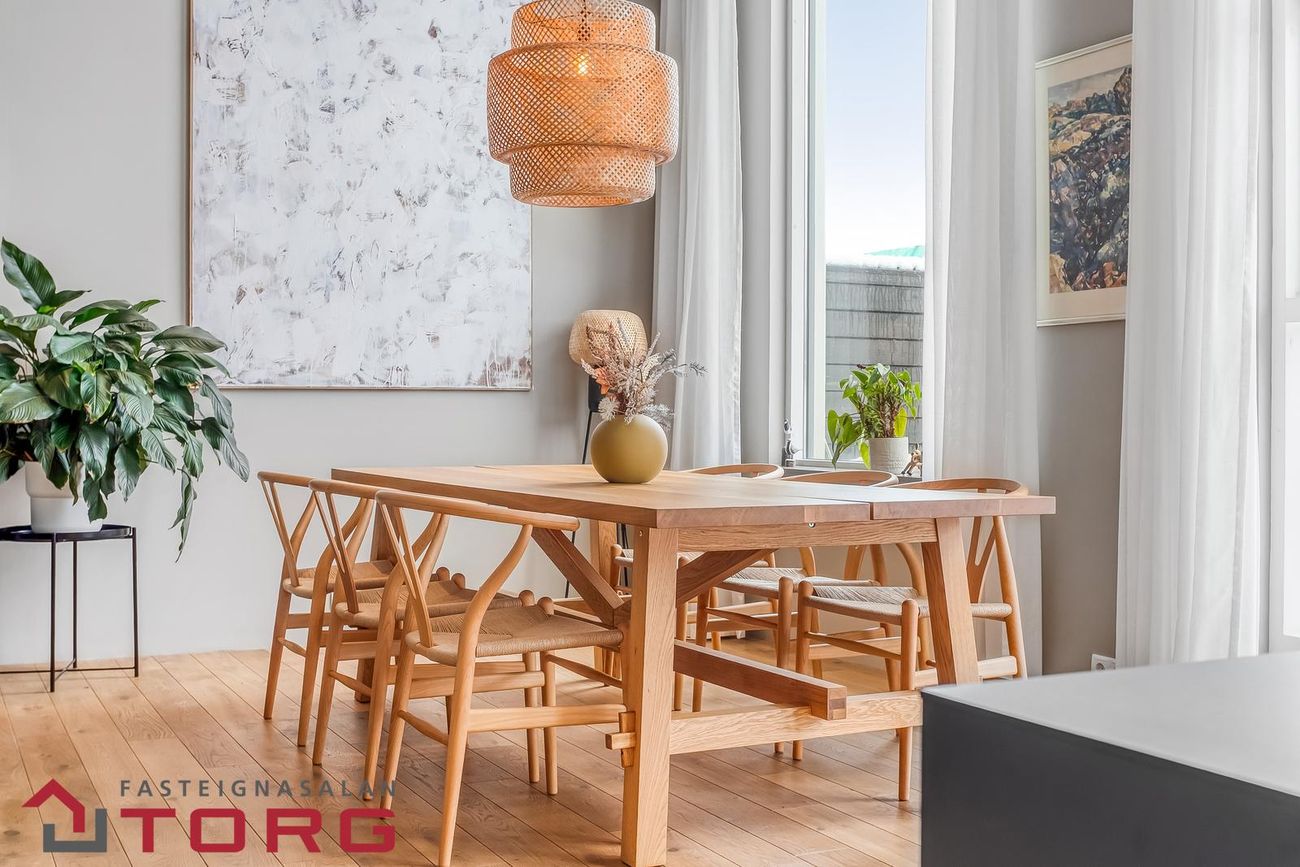 Neðri hæð: Mikil lofthæð, björt og falleg með gegnheilu viðarparketi. Gólfsíðar gardínur fylgja ásamt tveimur vínkælum, ísskáp og uppþvottavél. Eldhús: Nýleg falleg U-laga dökk dröppuð innrétting með akrílstein frá Svansverk. Innbyggður ísskápur, uppþvottavél og vínkælir. Tveir bakaraofnar í vinnuhæð. Mjög gott skápapláss með búrskáp. Gegnheilt viðarparket á gólfi og mikil lofthæð. Eldhús og stofa/borðstofa eru samtengd.