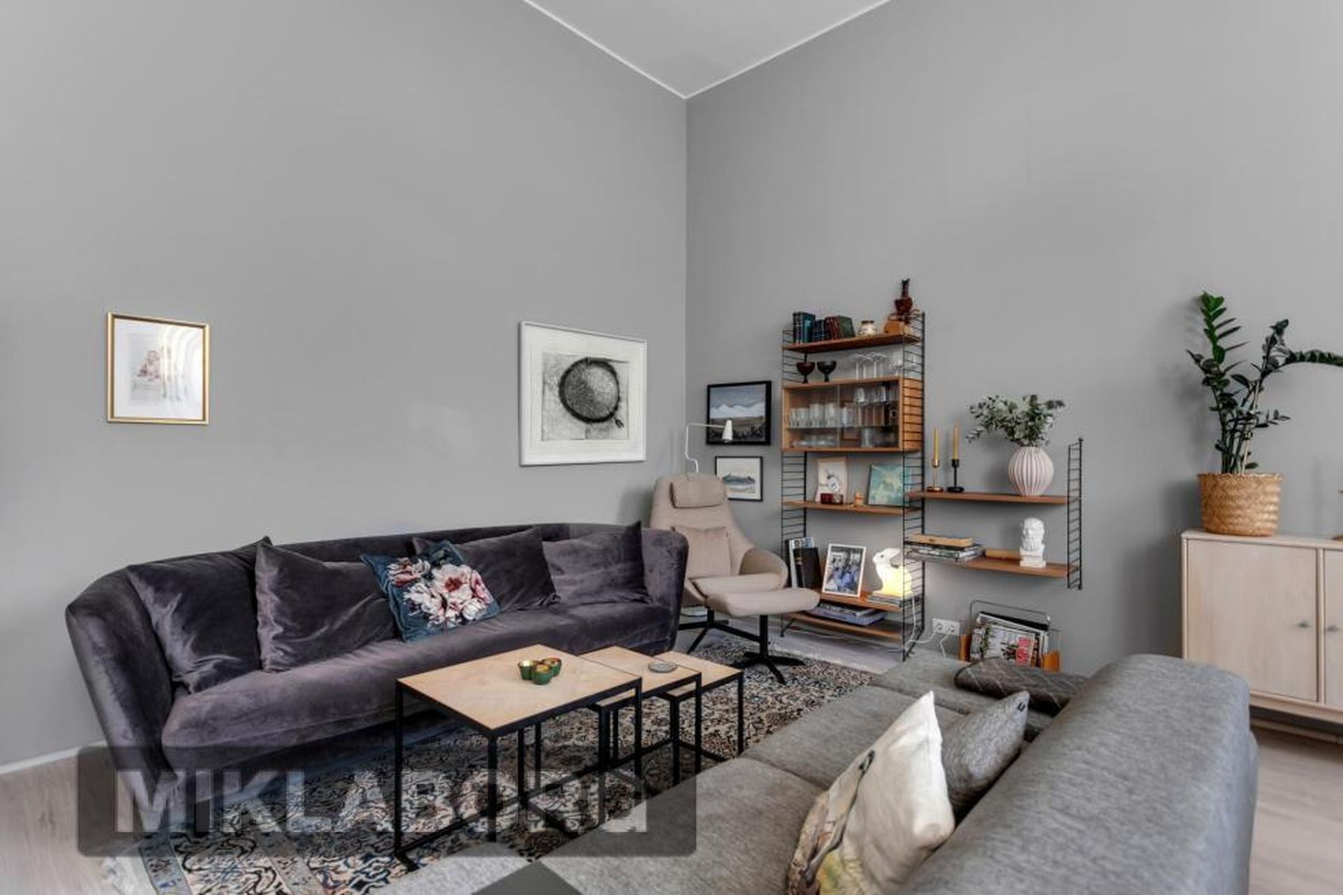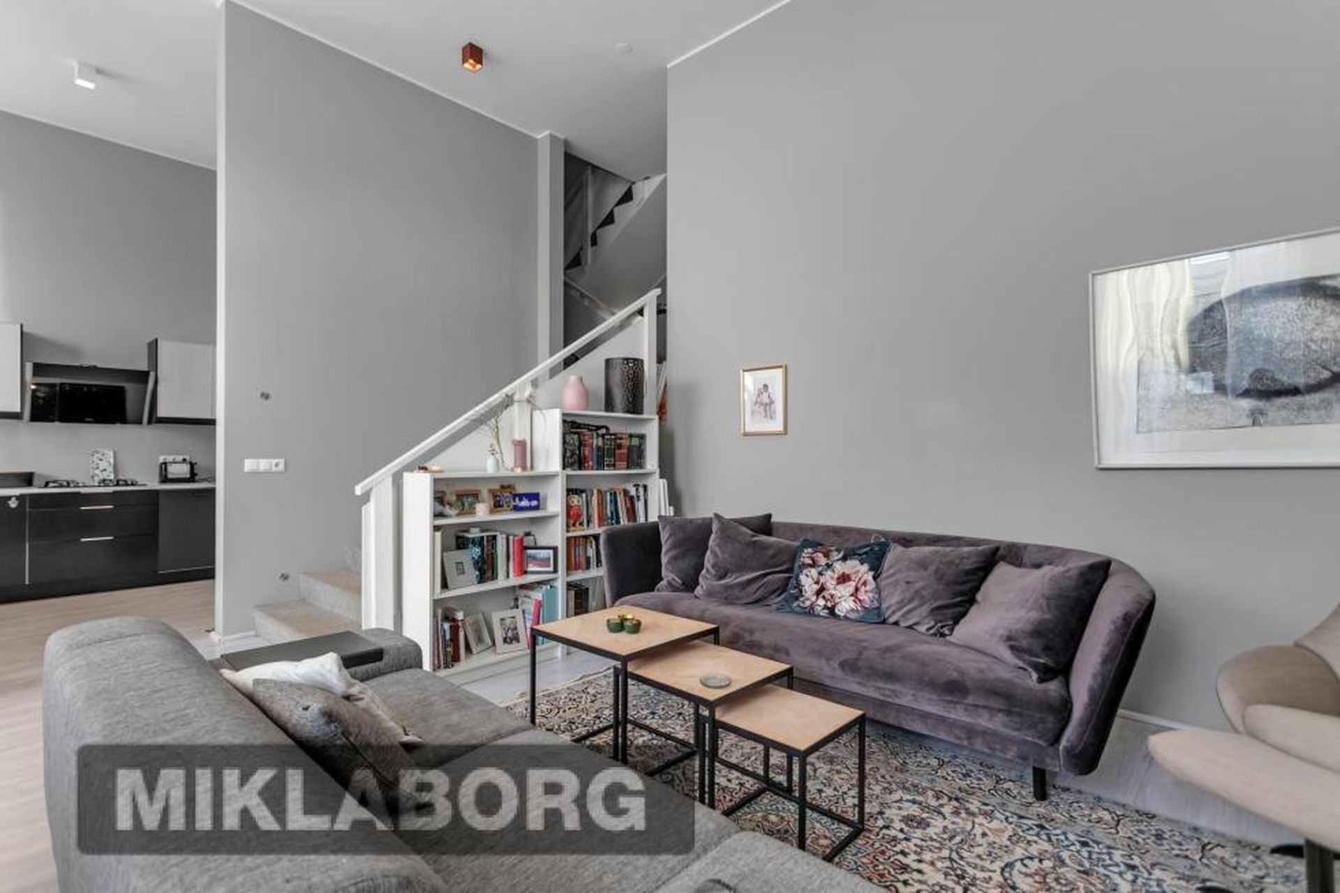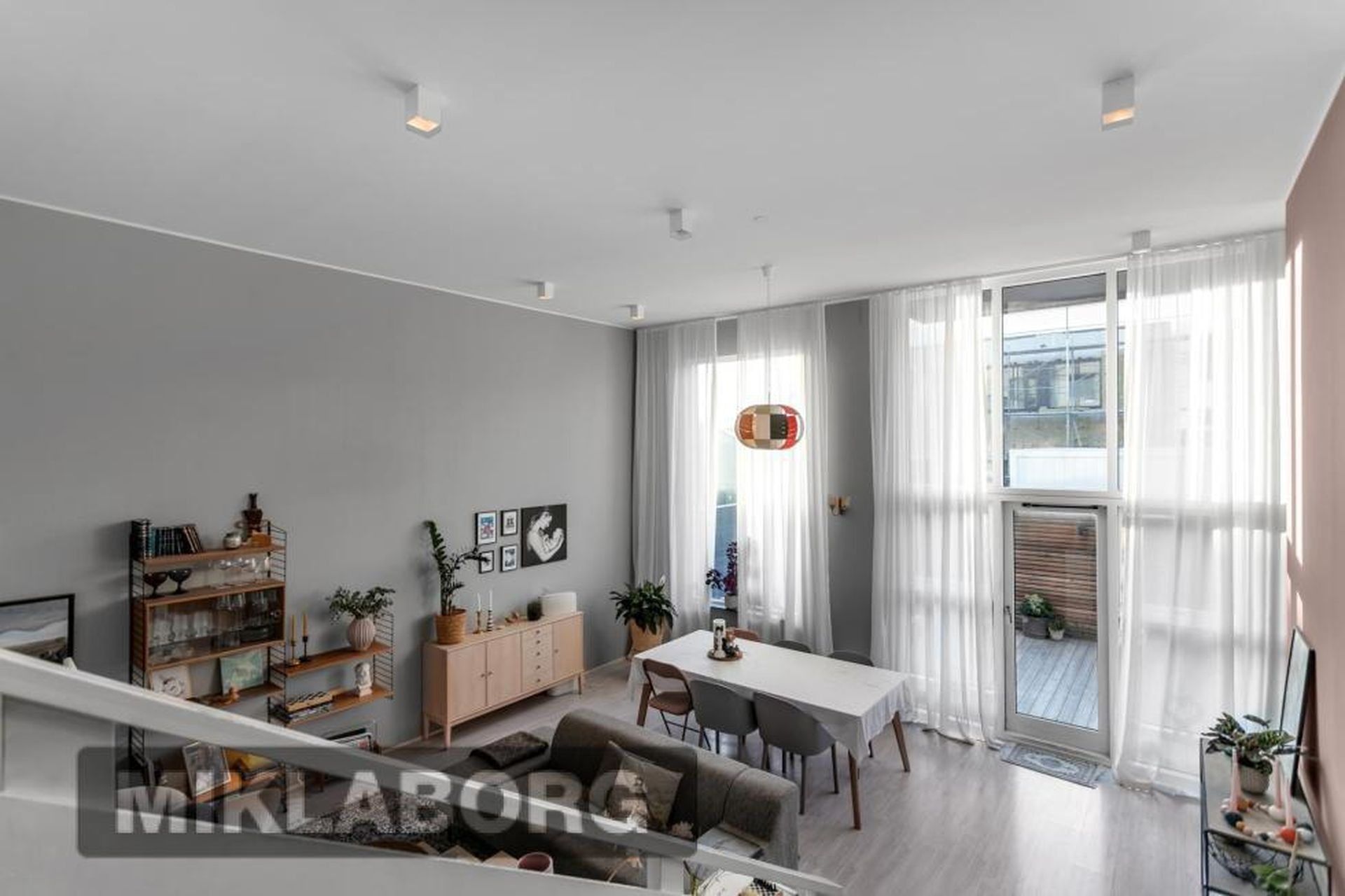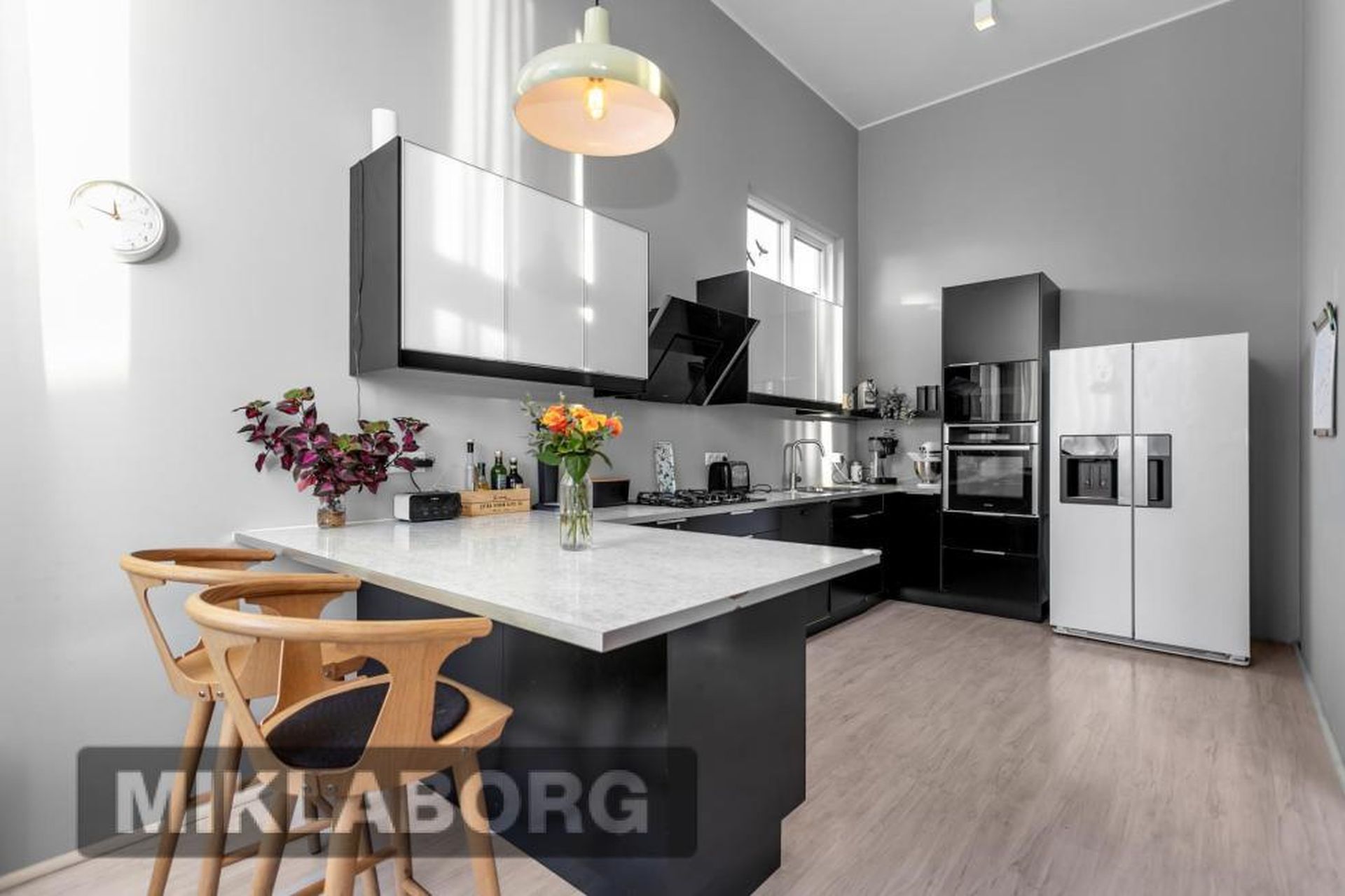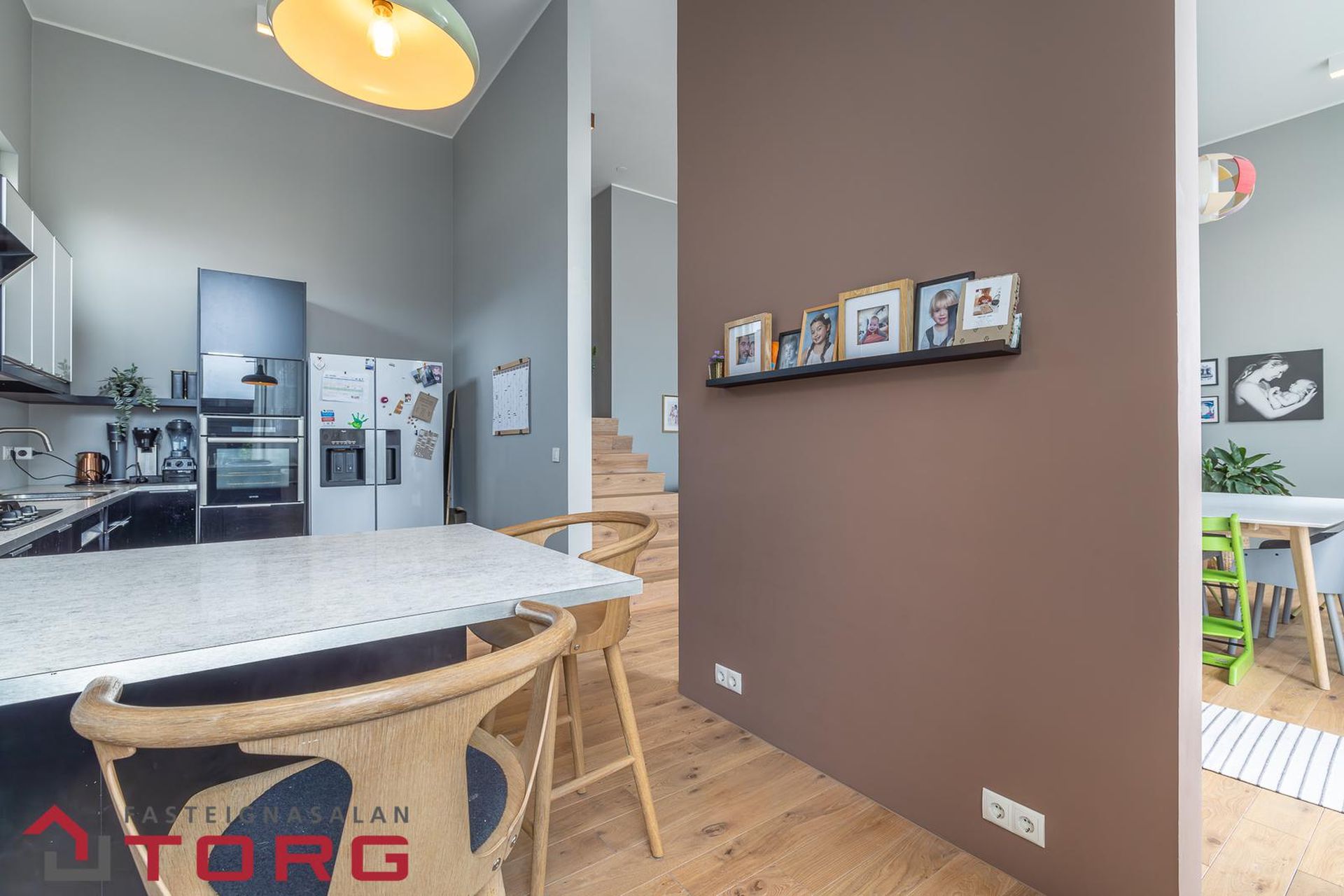 Neðri hæð: Mikil lofthæð, björt og falleg með gegnheilu viðarparketi. Gólfsíðar gardínur fylgja ásamt tveimur vínkælum, ísskáp og uppþvottavél. Eldhús: Nýleg falleg U-laga dökk dröppuð innrétting með akrílstein frá Svansverk. Innbyggður ísskápur, uppþvottavél og vínkælir. Tveir bakaraofnar í vinnuhæð. Mjög gott skápapláss með búrskáp. Gegnheilt viðarparket á gólfi og mikil lofthæð. Eldhús og stofa/borðstofa eru samtengd.