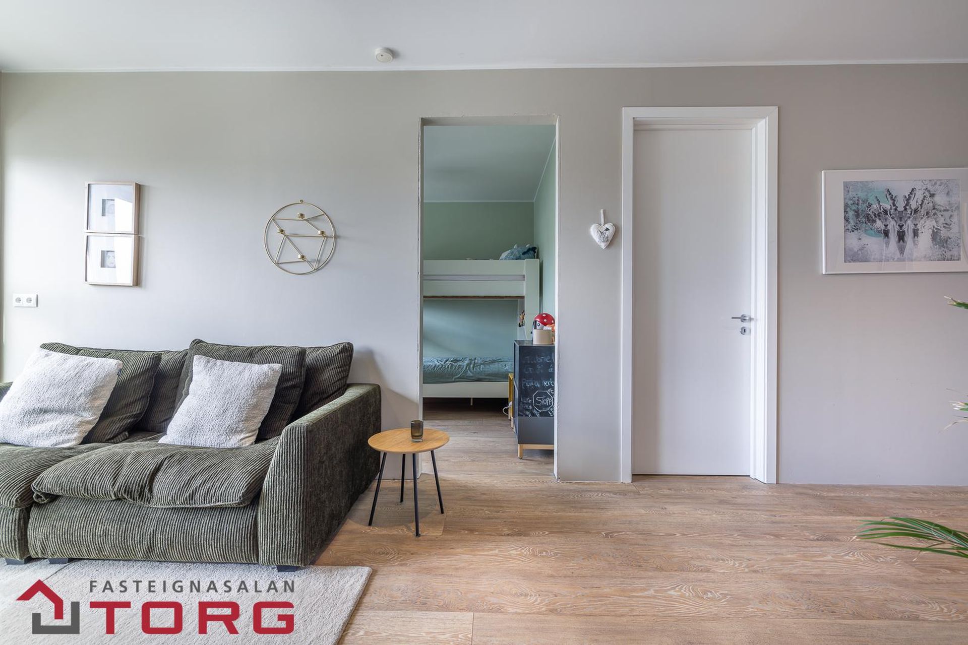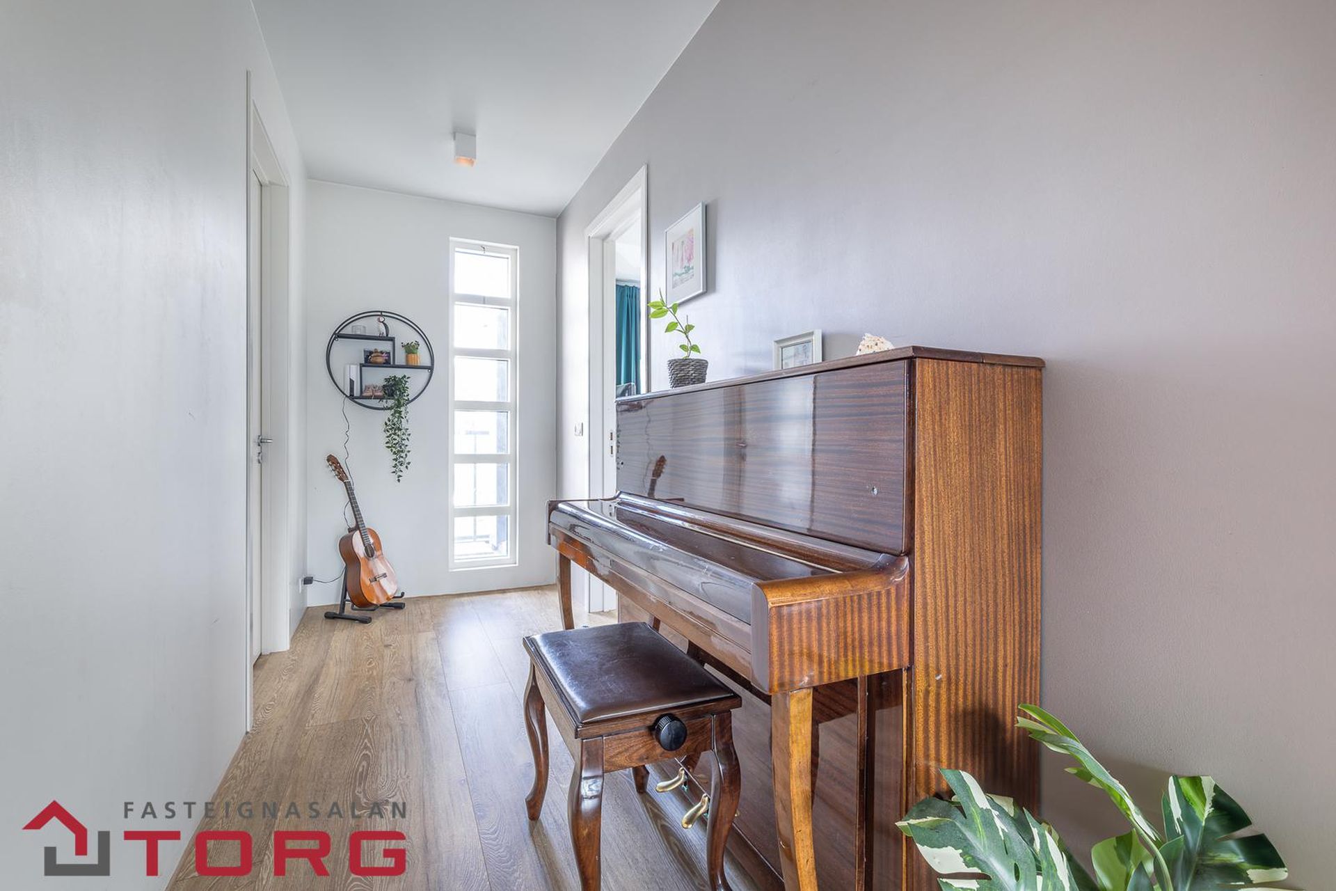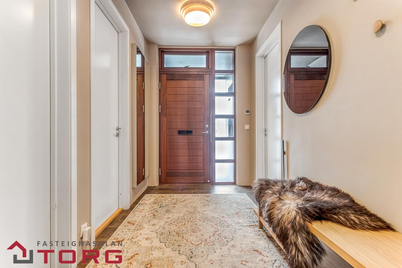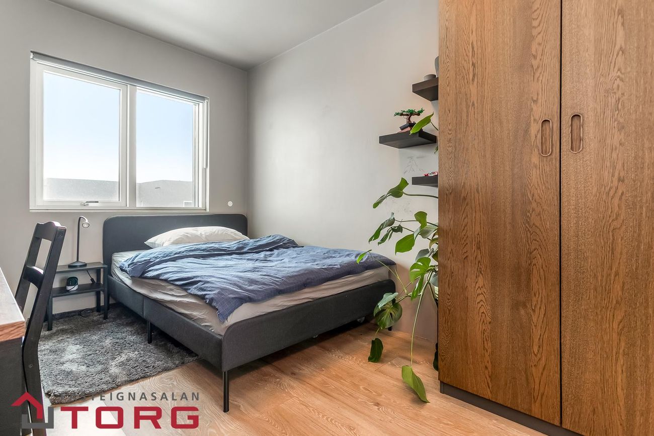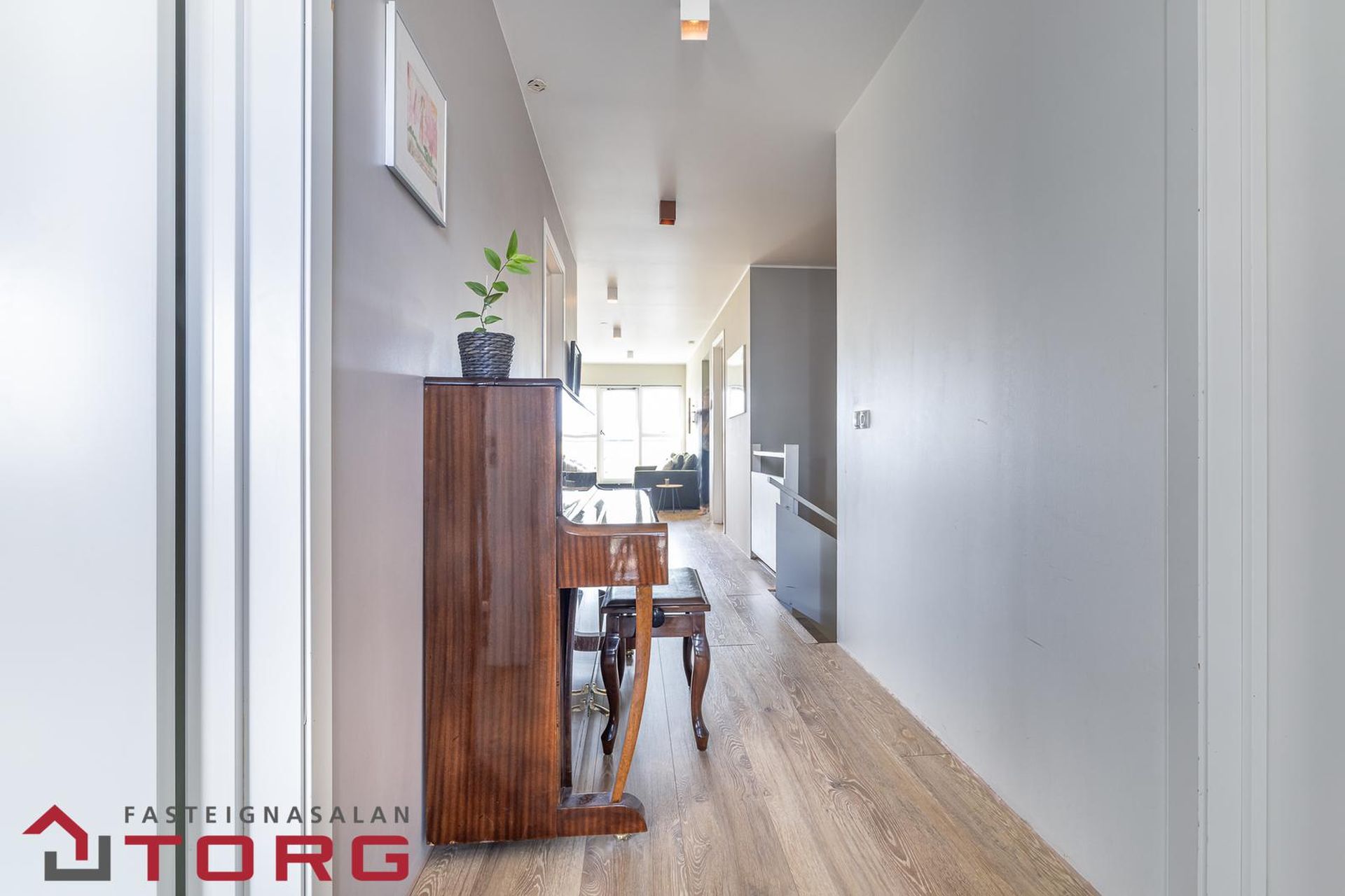 Efri hæð: Aukin lofthæð og sérsmíðaðar hvítar innihurðar. Viðarlitað harðparket á á gólfi í öllum rýmum nema baðherbergi og þvottahúsi.Svefnherbergi með fataherbergi II: Fallegt og rúmgott hjónaherbergi með fataherbergi. Viðarlitað harðparket á gólfi og útgengt á svalir til norð-austurs.