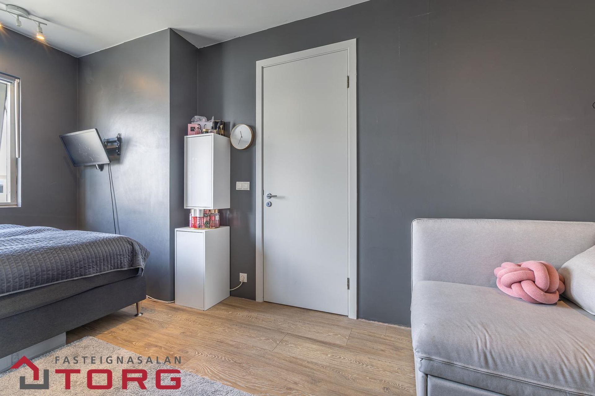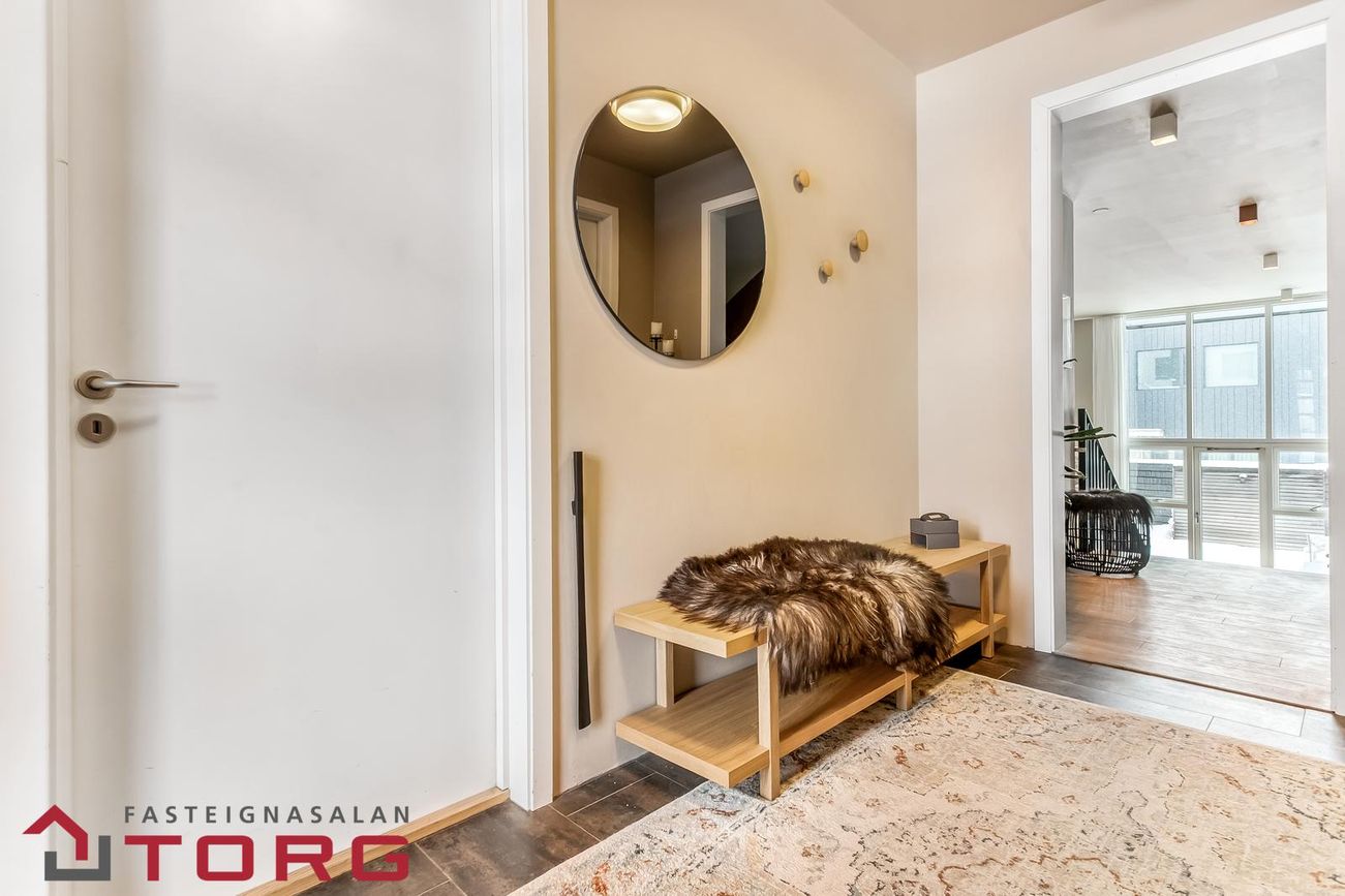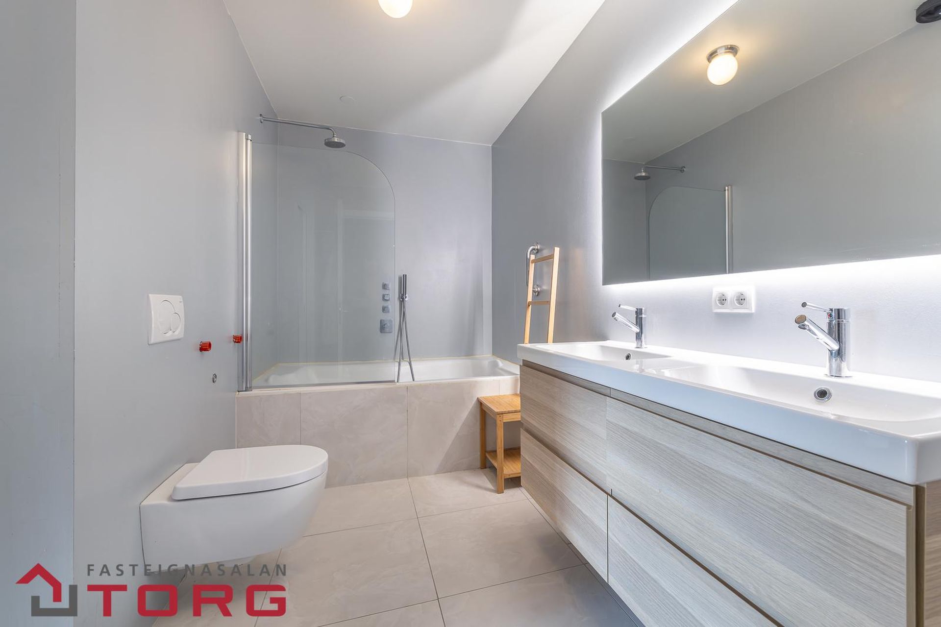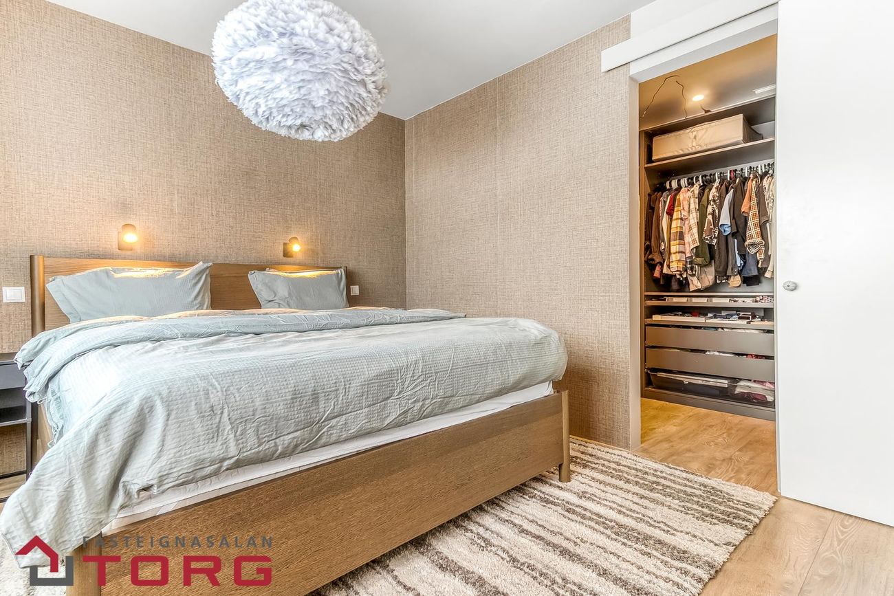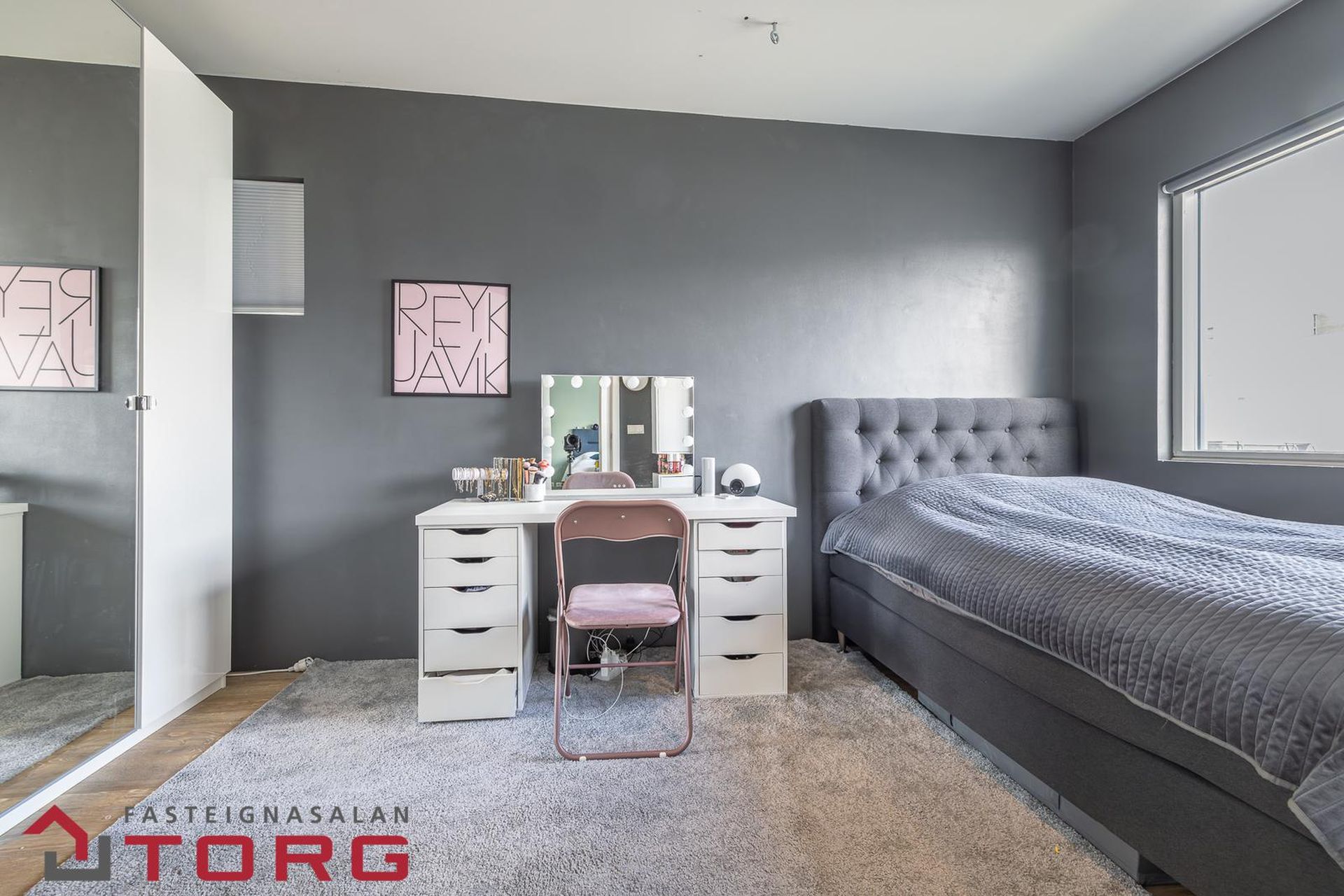 Efri hæð: Aukin lofthæð og sérsmíðaðar hvítar innihurðar. Viðarlitað harðparket á á gólfi í öllum rýmum nema baðherbergi og þvottahúsi.Svefnherbergi með fataherbergi II: Fallegt og rúmgott hjónaherbergi með fataherbergi. Viðarlitað harðparket á gólfi og útgengt á svalir til norð-austurs.