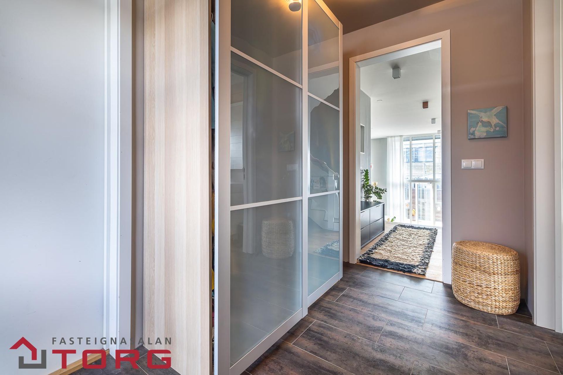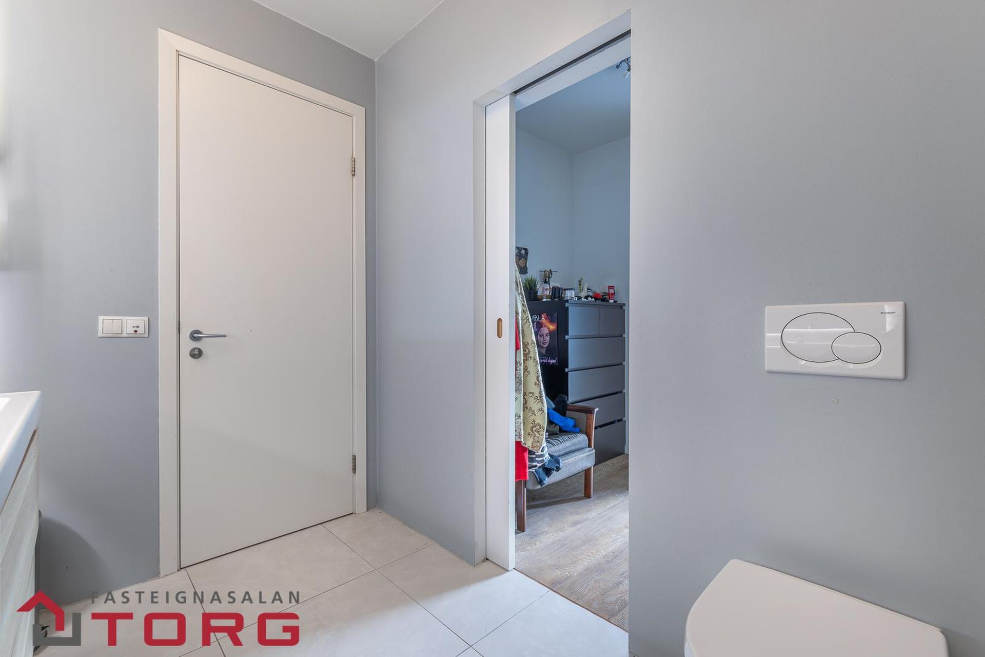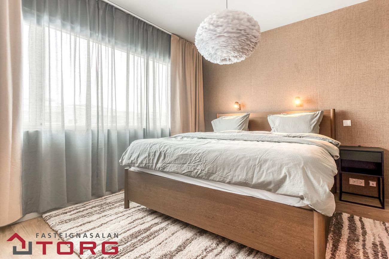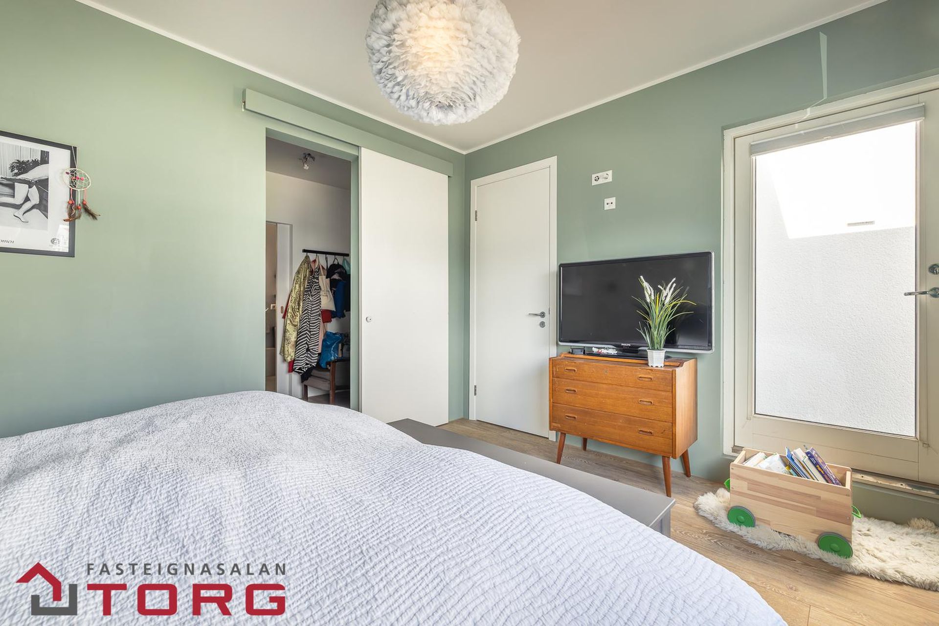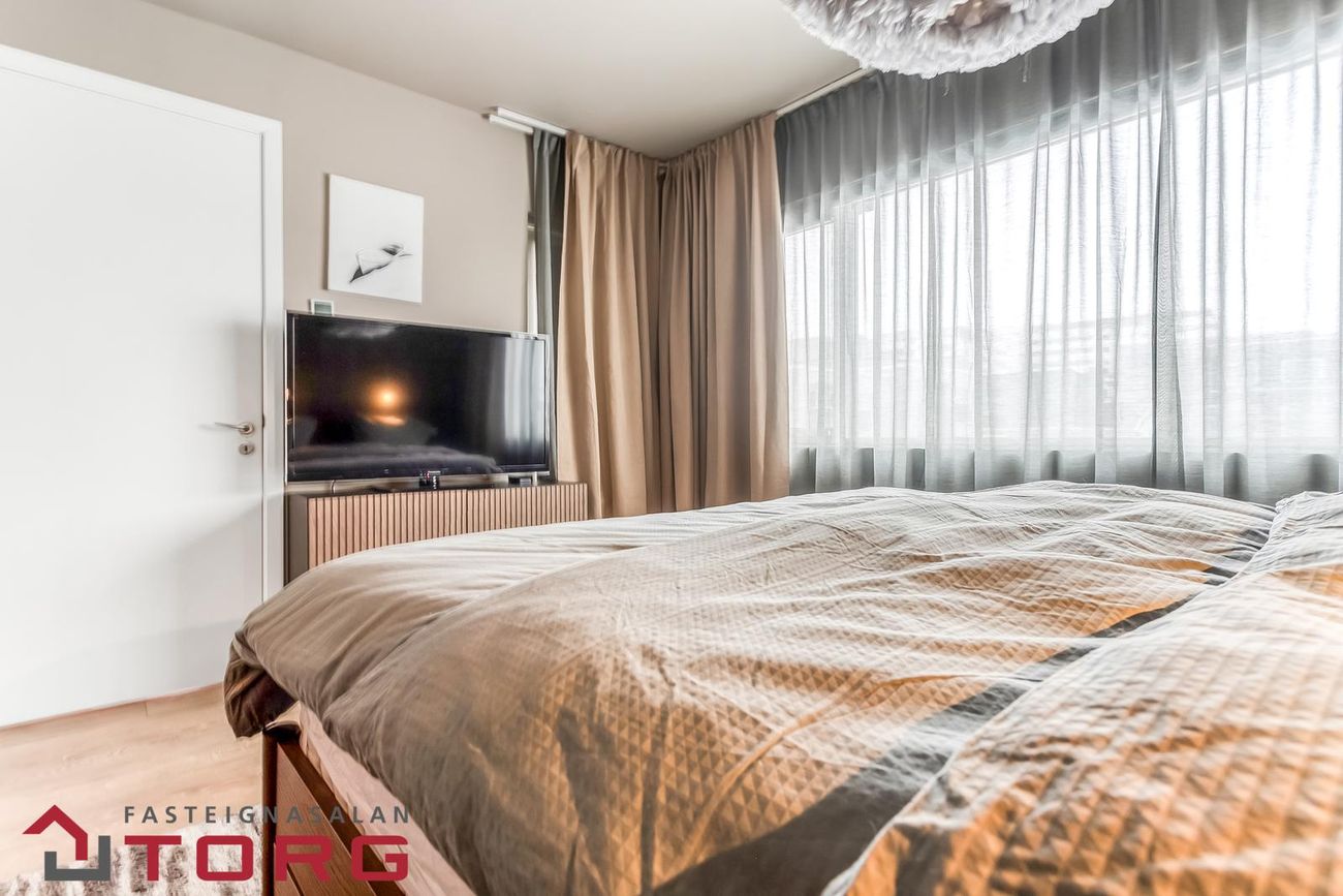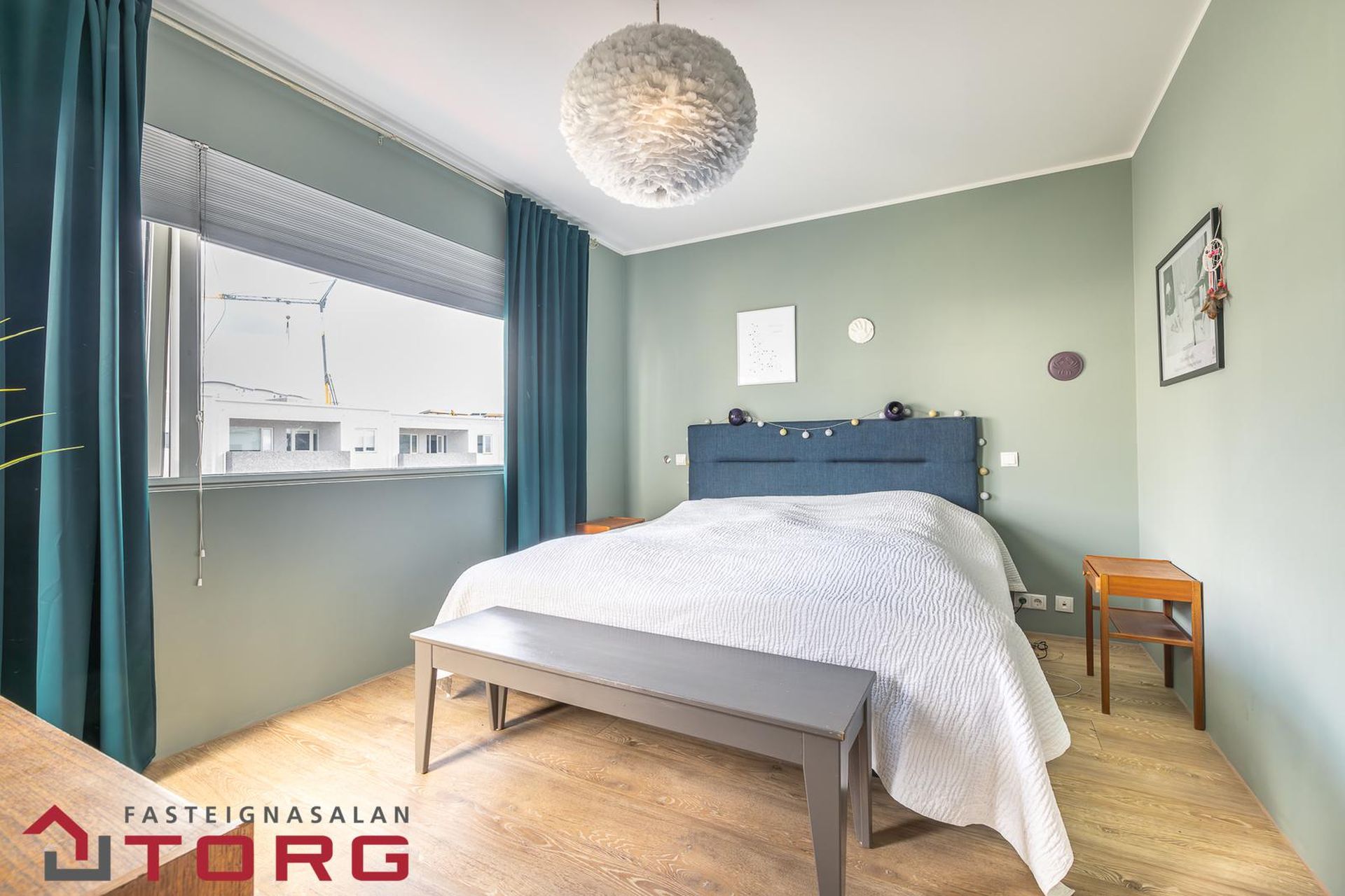 Efri hæð: Aukin lofthæð og sérsmíðaðar hvítar innihurðar. Viðarlitað harðparket á á gólfi í öllum rýmum nema baðherbergi og þvottahúsi.Svefnherbergi með fataherbergi II: Fallegt og rúmgott hjónaherbergi með fataherbergi. Viðarlitað harðparket á gólfi og útgengt á svalir til norð-austurs.