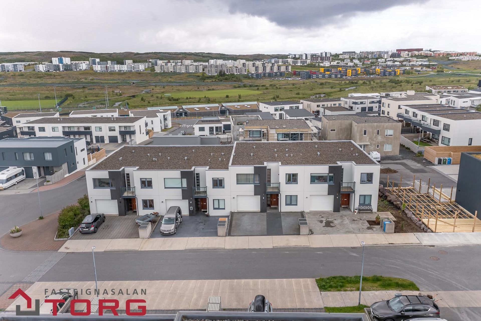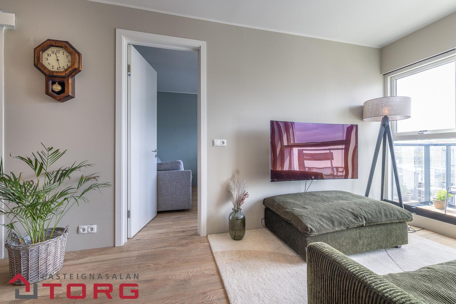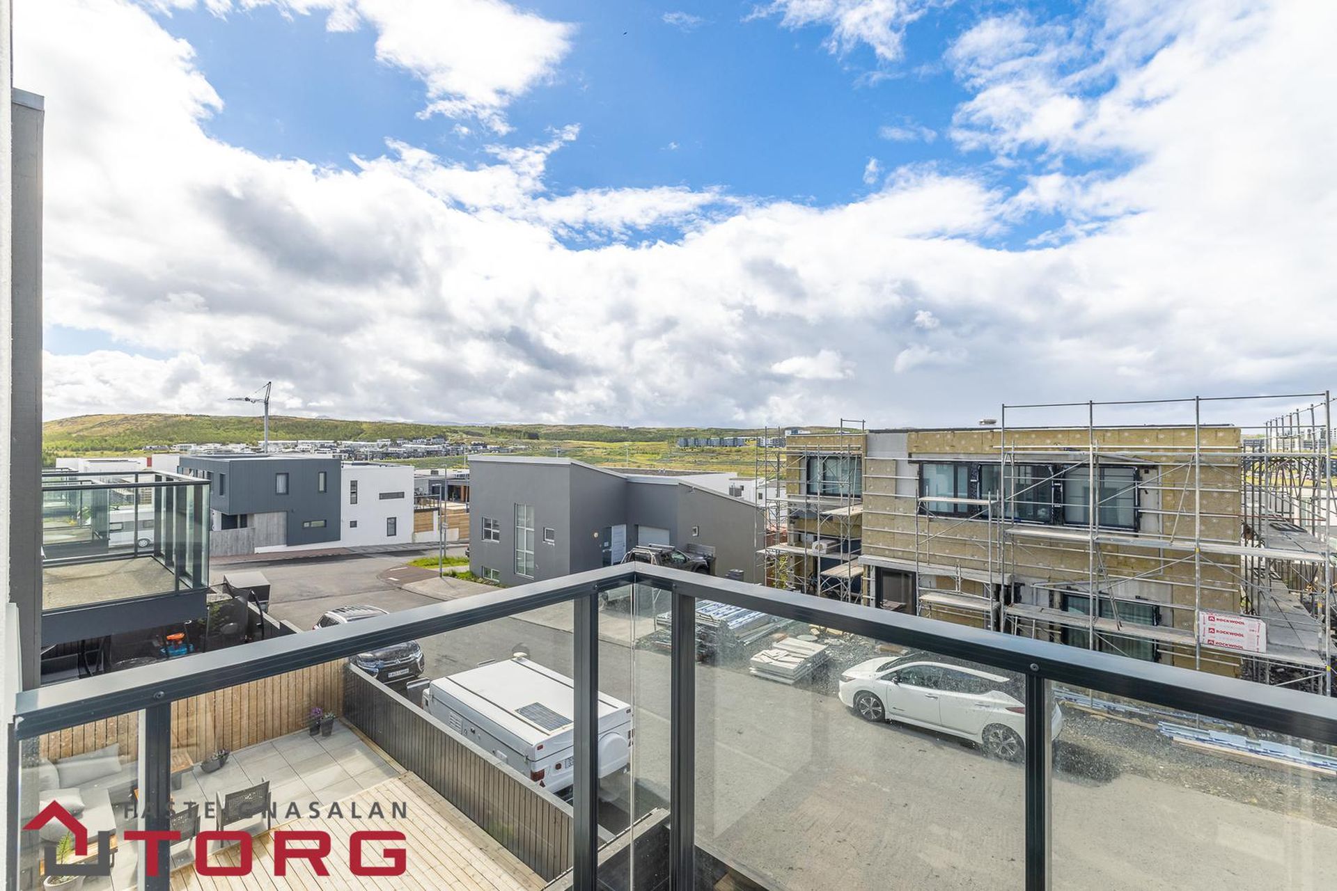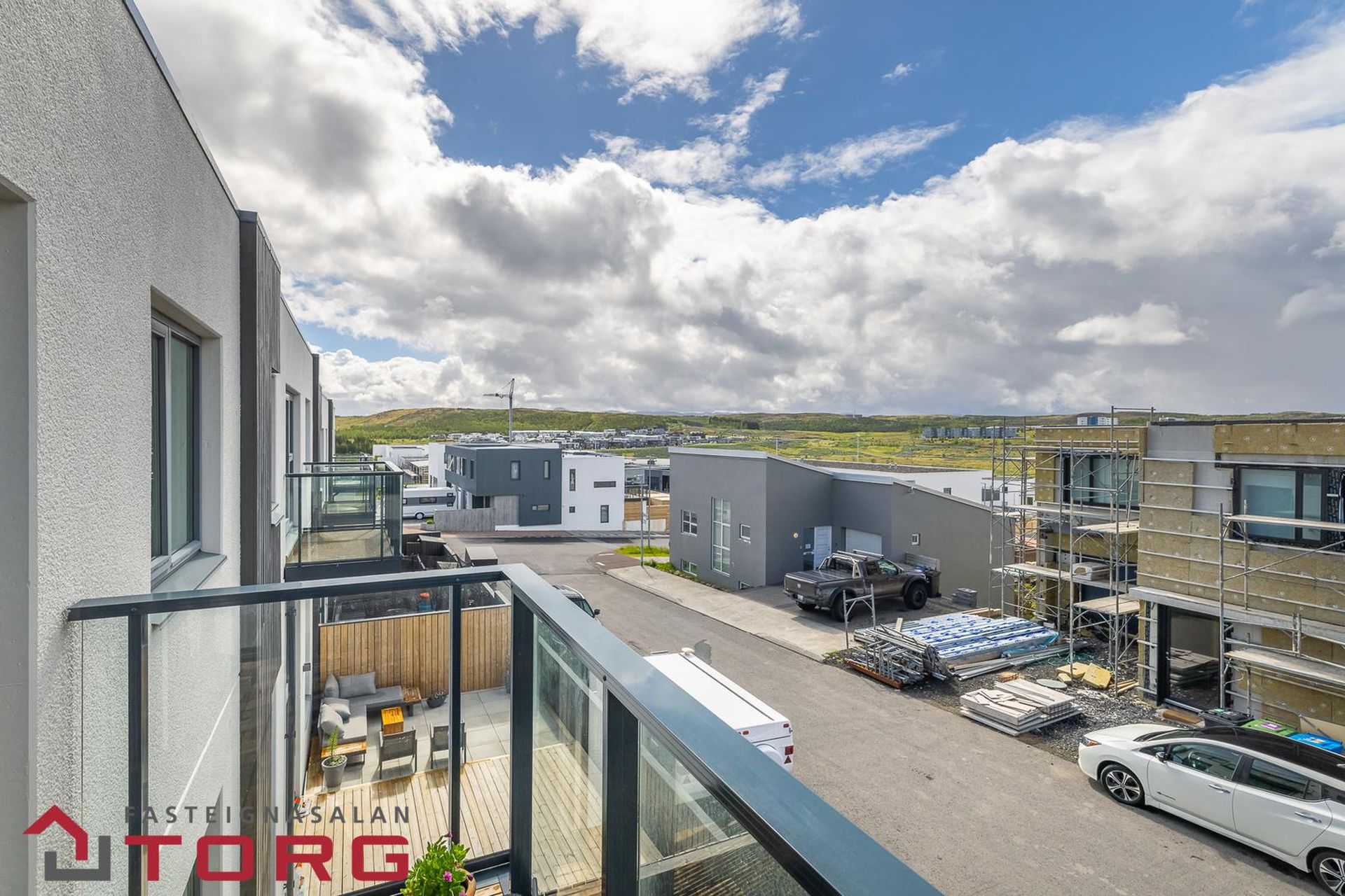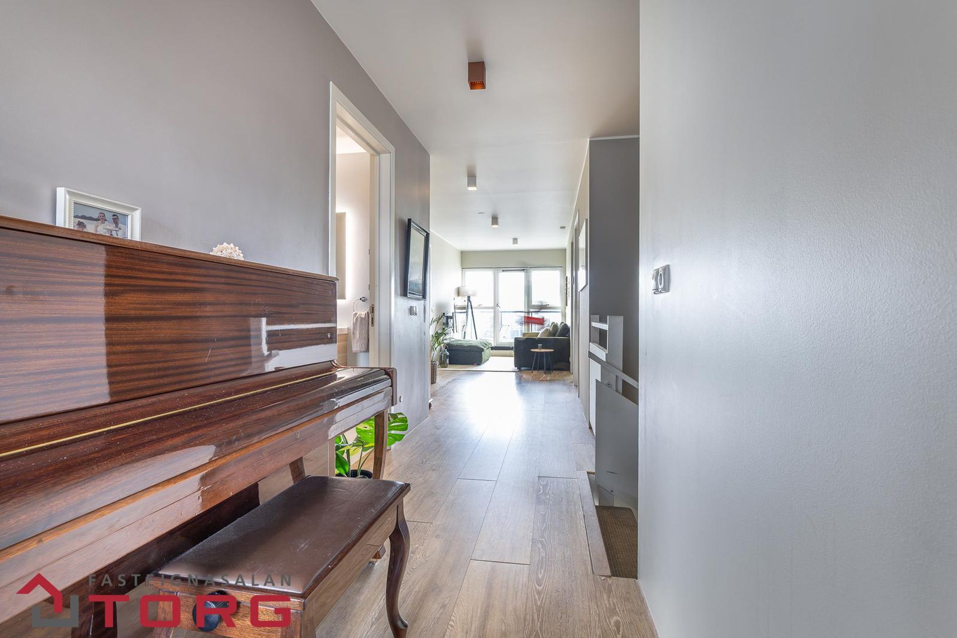 Efri hæð: Aukin lofthæð og sérsmíðaðar hvítar innihurðar. Viðarlitað harðparket á á gólfi í öllum rýmum nema baðherbergi og þvottahúsi.Svefnherbergi með fataherbergi II: Fallegt og rúmgott hjónaherbergi með fataherbergi. Viðarlitað harðparket á gólfi og útgengt á svalir til norð-austurs.