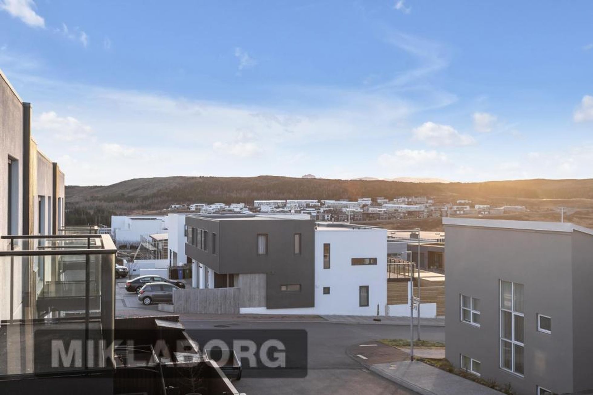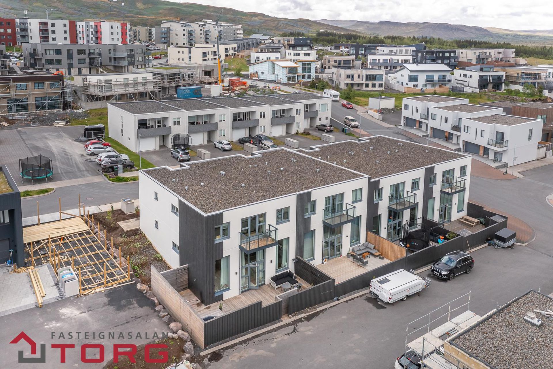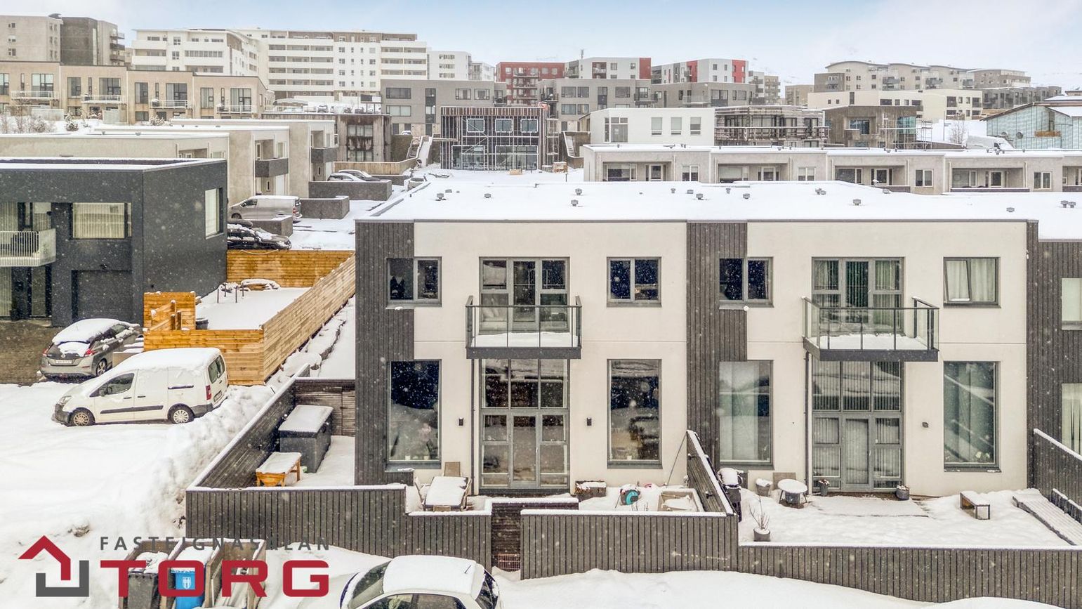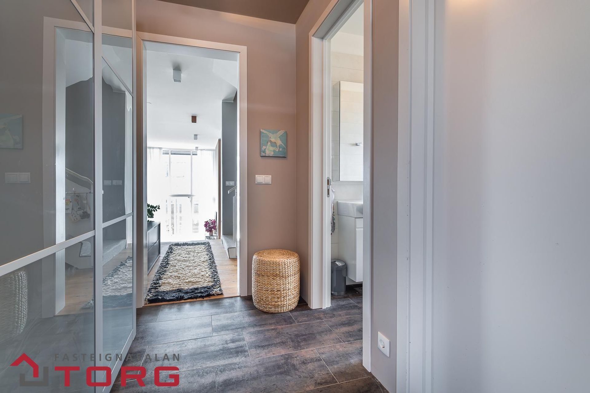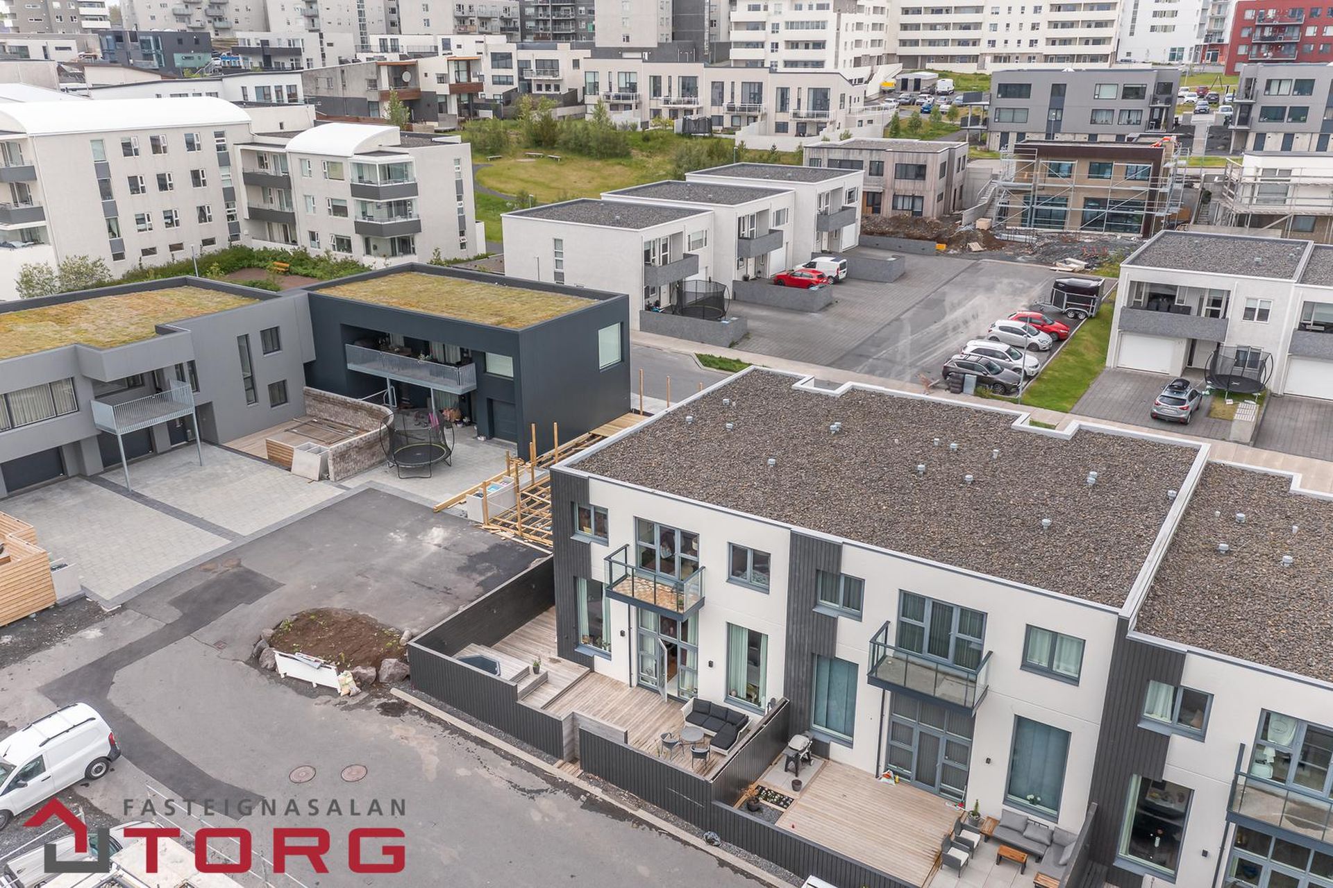 Efri hæð: Aukin lofthæð og sérsmíðaðar hvítar innihurðar. Viðarlitað harðparket á á gólfi í öllum rýmum nema baðherbergi og þvottahúsi.Svefnherbergi með fataherbergi II: Fallegt og rúmgott hjónaherbergi með fataherbergi. Viðarlitað harðparket á gólfi og útgengt á svalir til norð-austurs.
