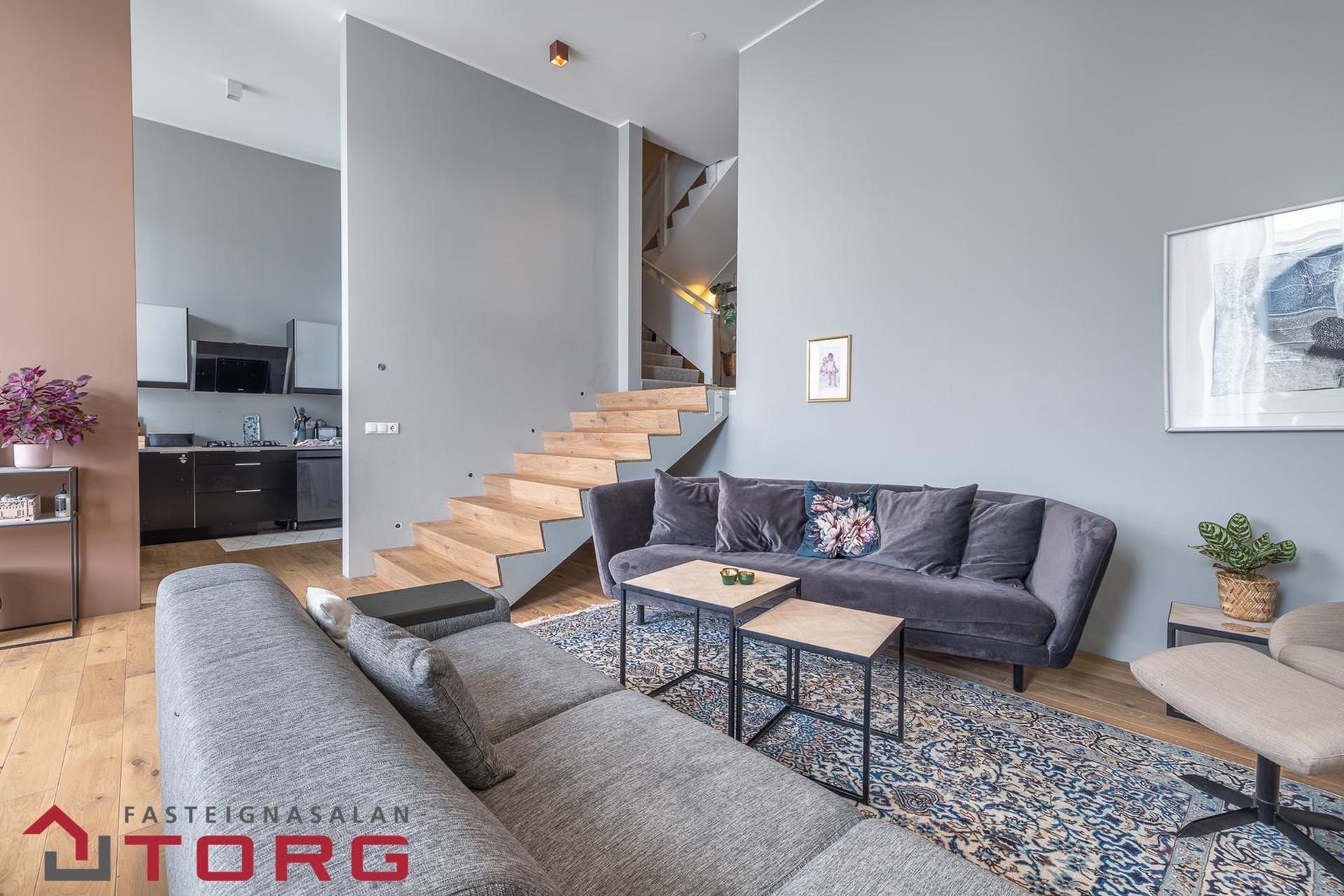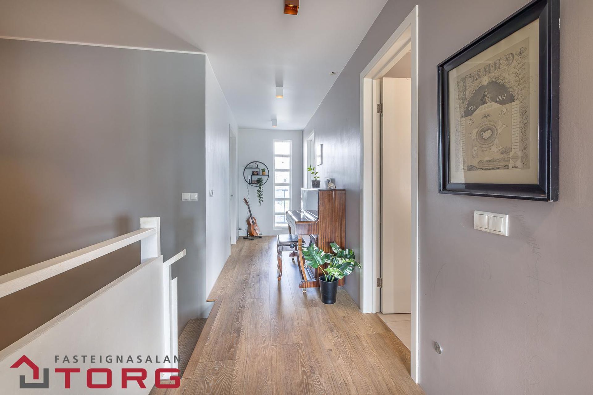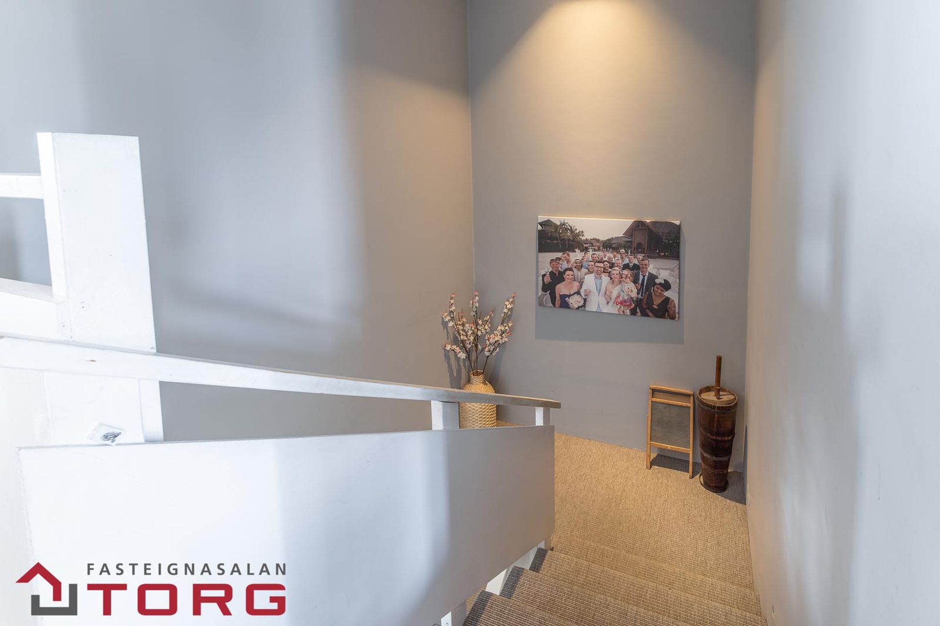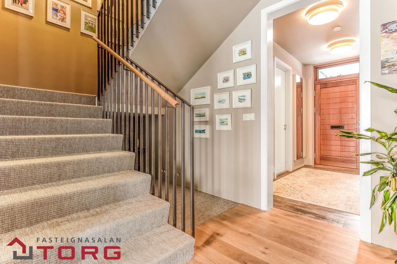 Stigi/stigagangur: Stigi niður á neðri hæð er með fallegu svörtu stálhandriði og gegnheilu viðarparketi. Stigi upp á efri hæð er teppalagður og með nýlegu stálhandriði frá JSÓ.