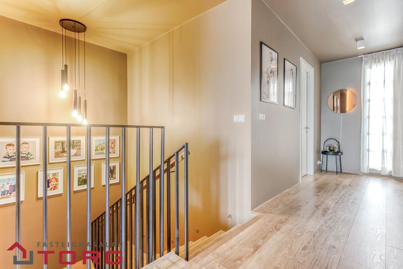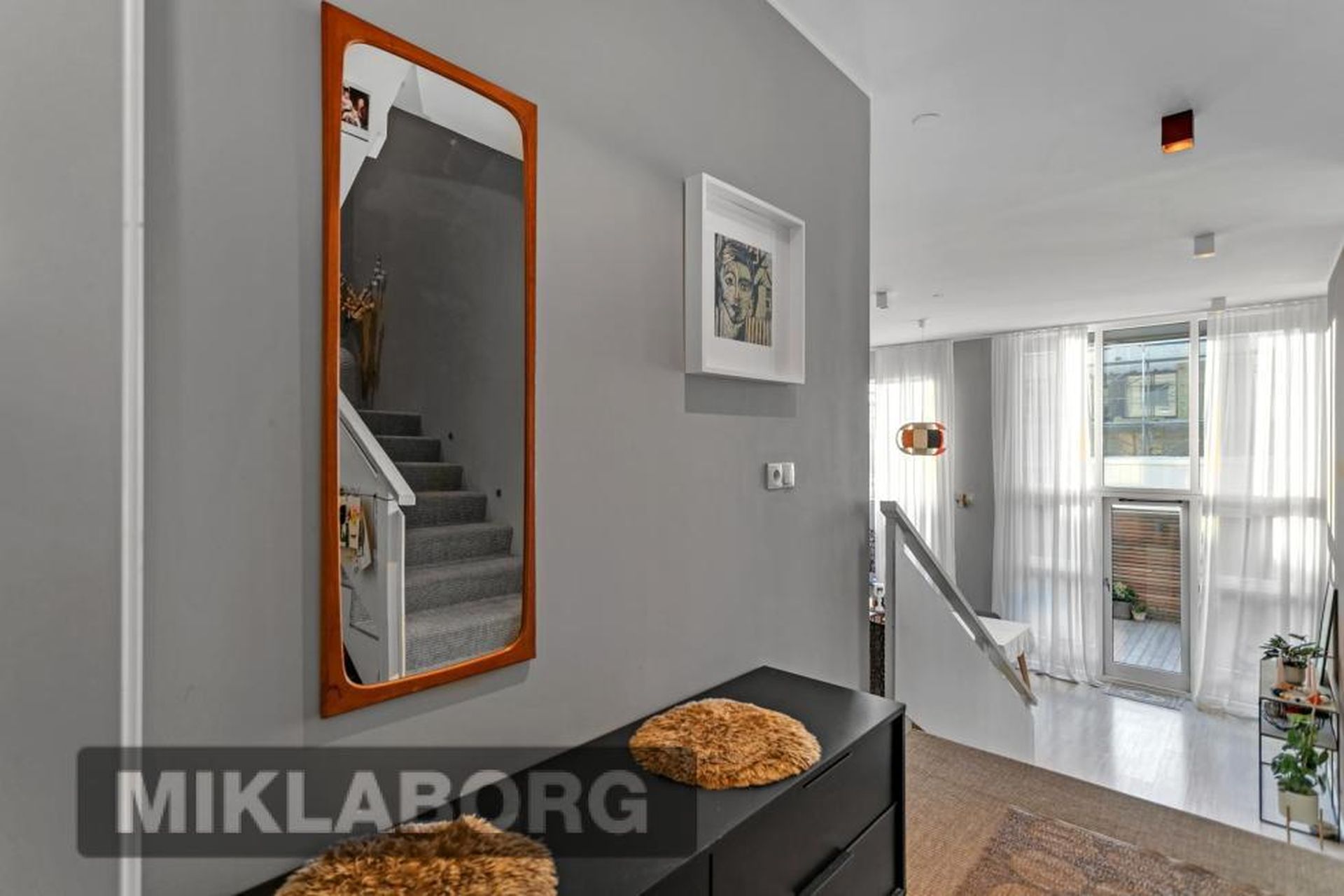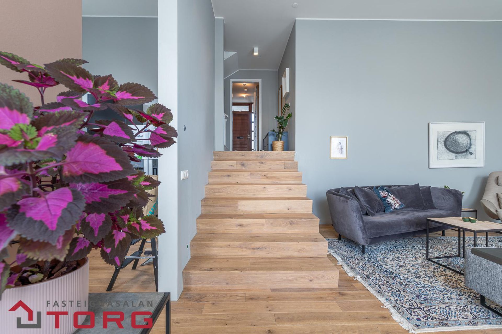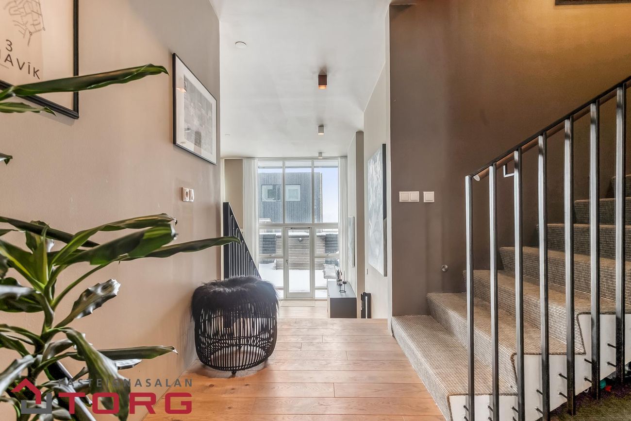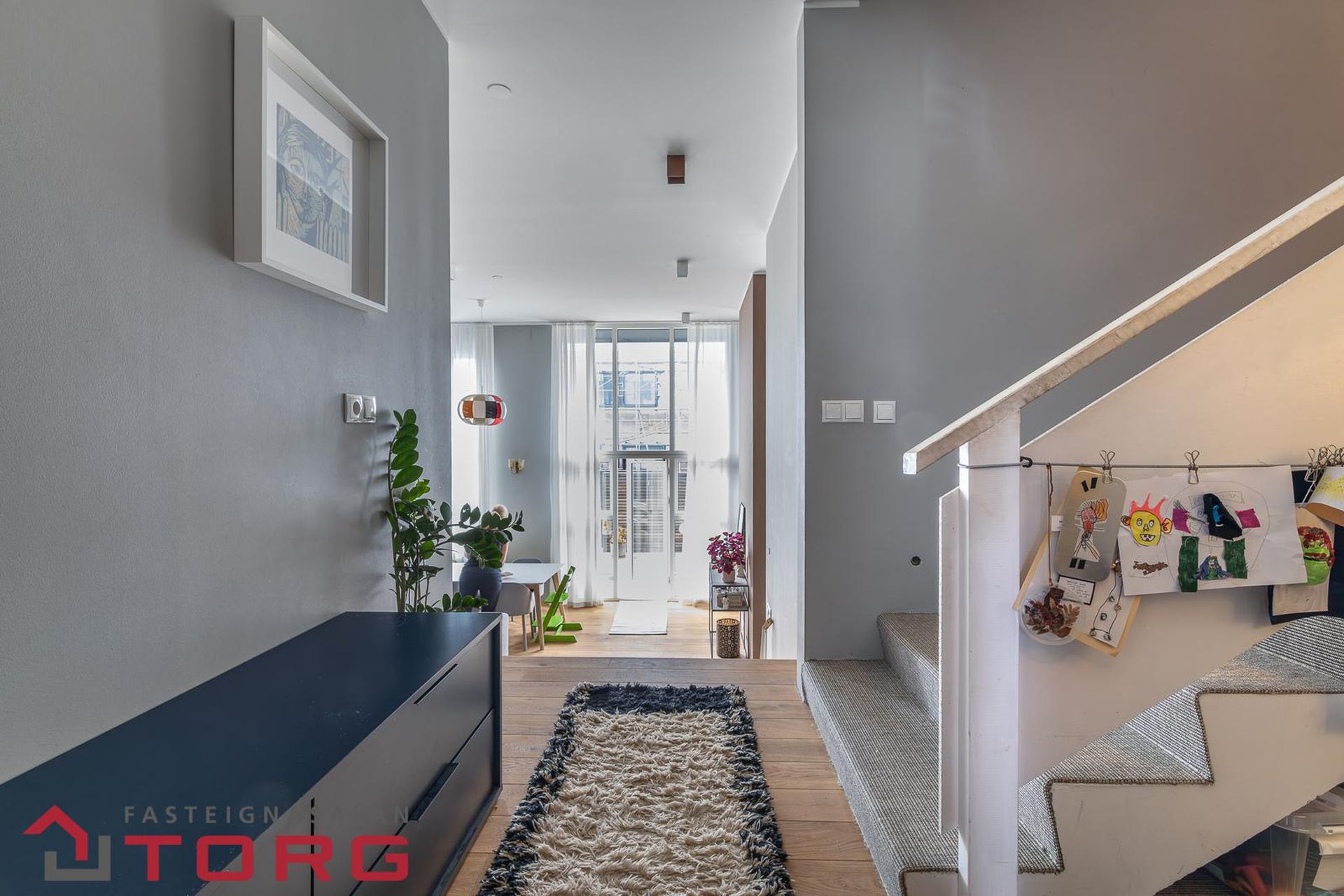 Stigi/stigagangur: Stigi niður á neðri hæð er með fallegu svörtu stálhandriði og gegnheilu viðarparketi. Stigi upp á efri hæð er teppalagður og með nýlegu stálhandriði frá JSÓ.