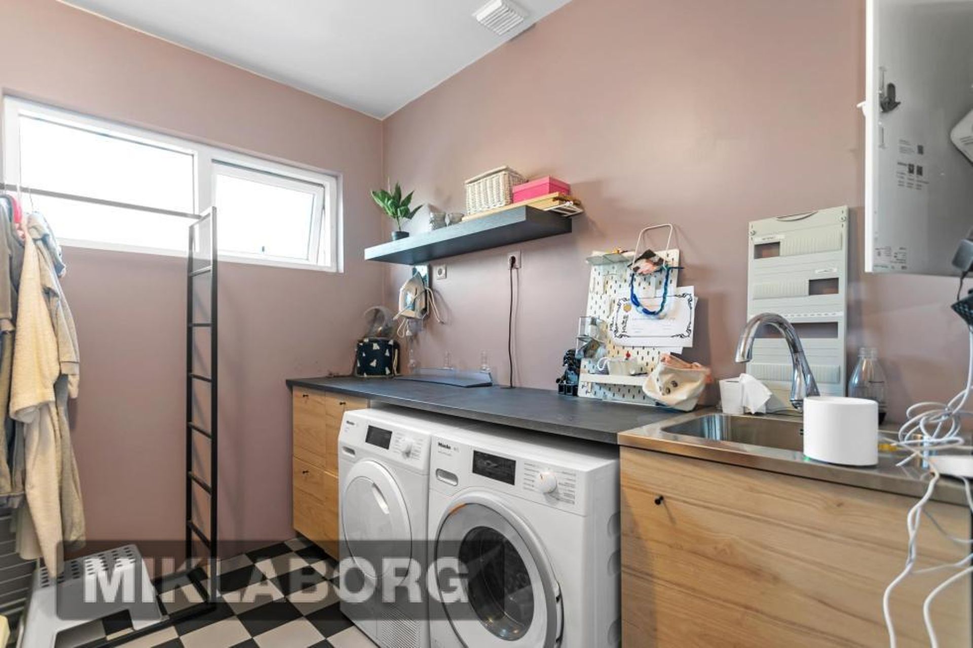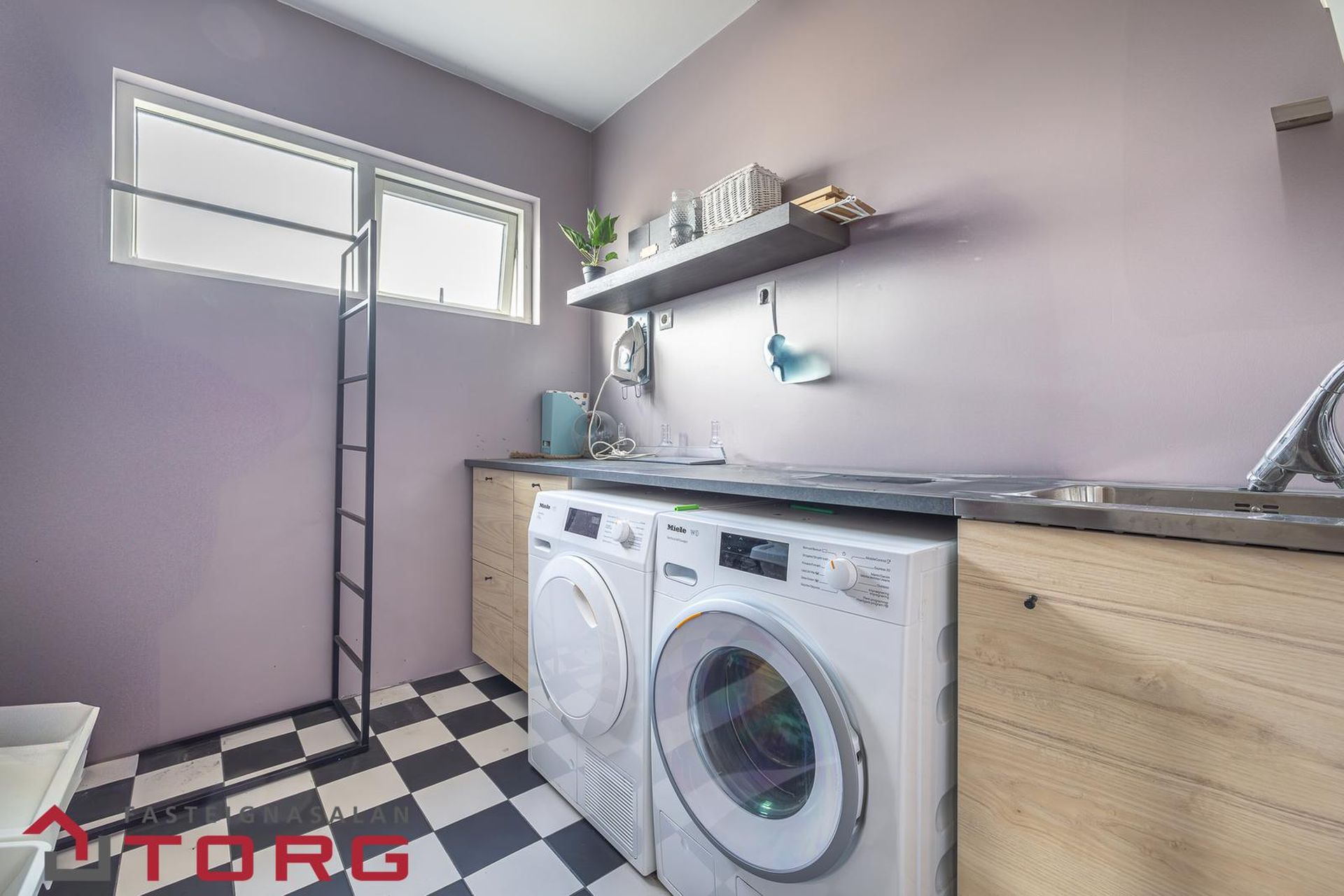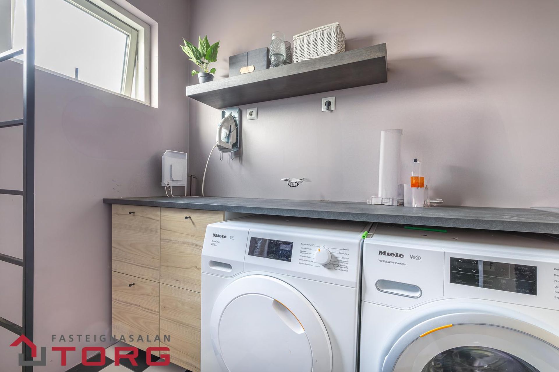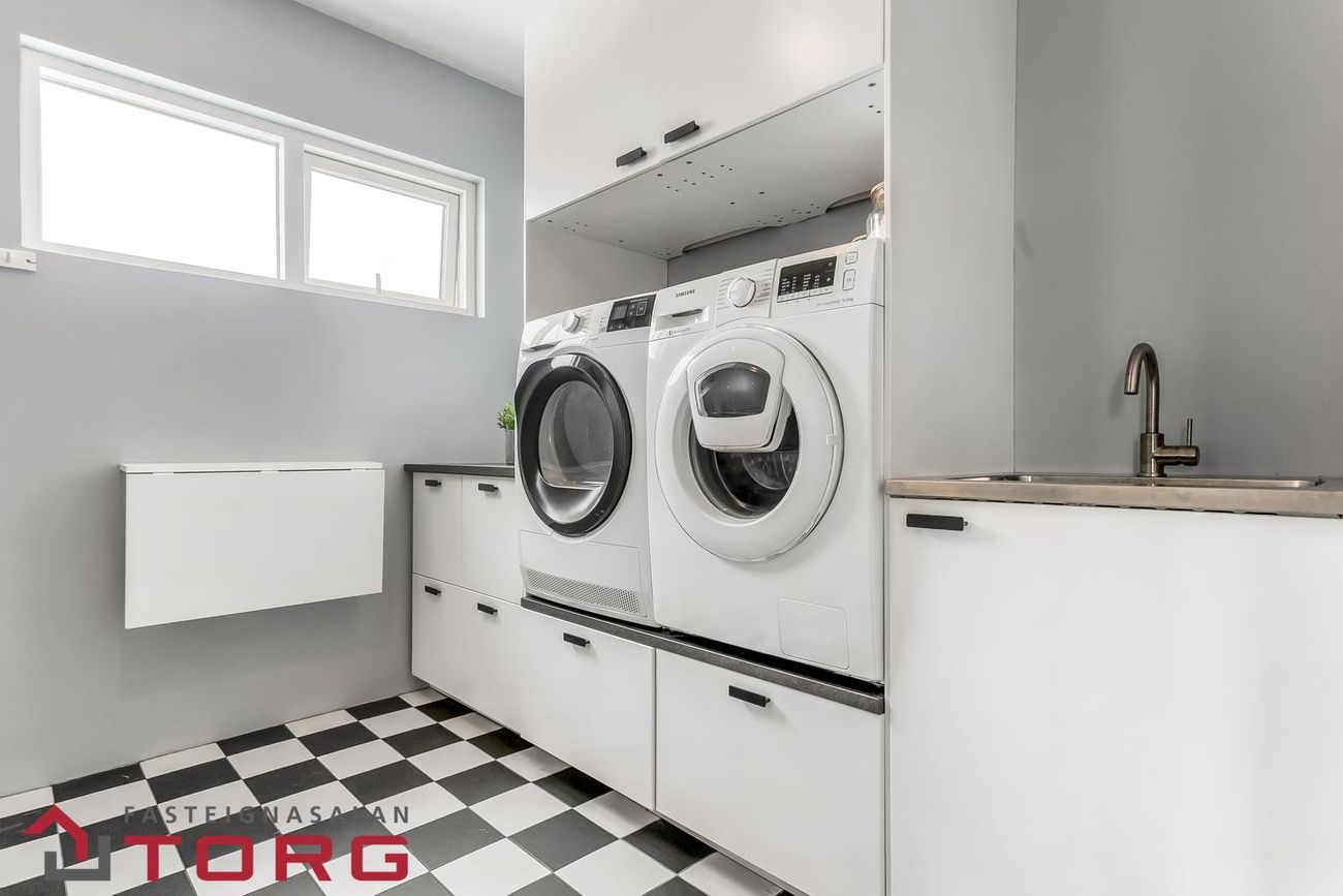 Þvottahús: Nýleg hvít innrétting, tengi fyrir þvottavél og þurrkara í vinnuhæð. Vaskur, flísar á gólfi og gluggi með opnanlegu fagi.