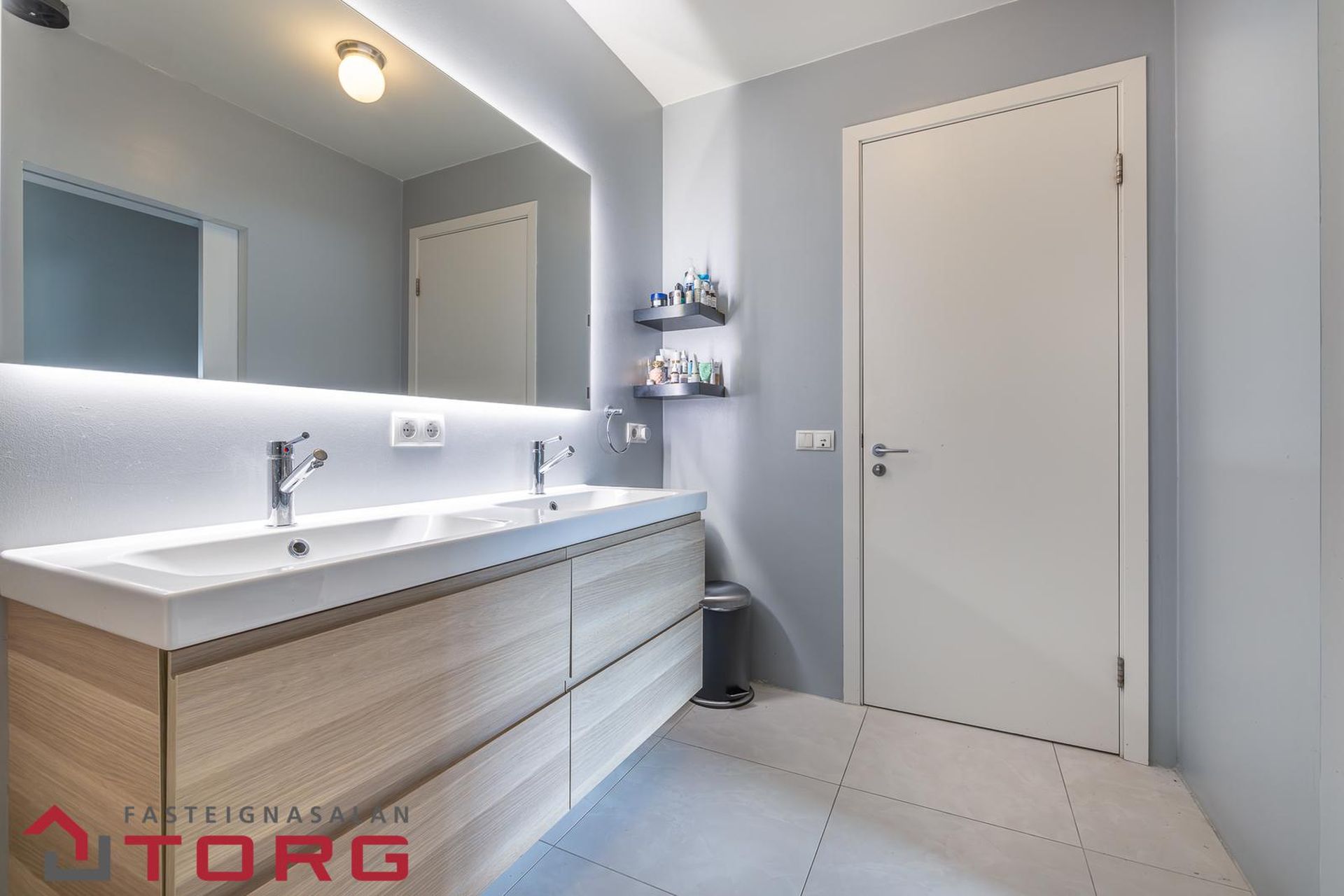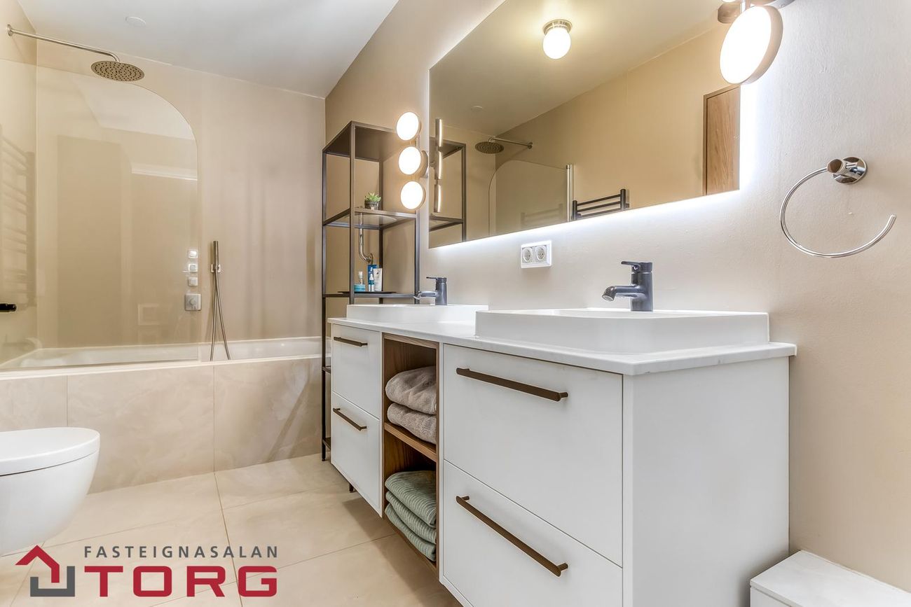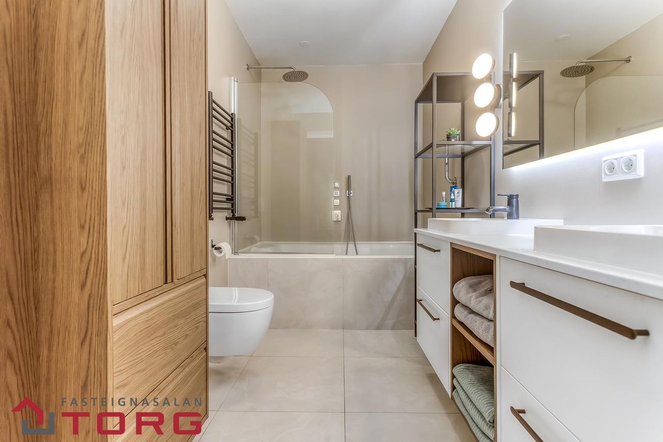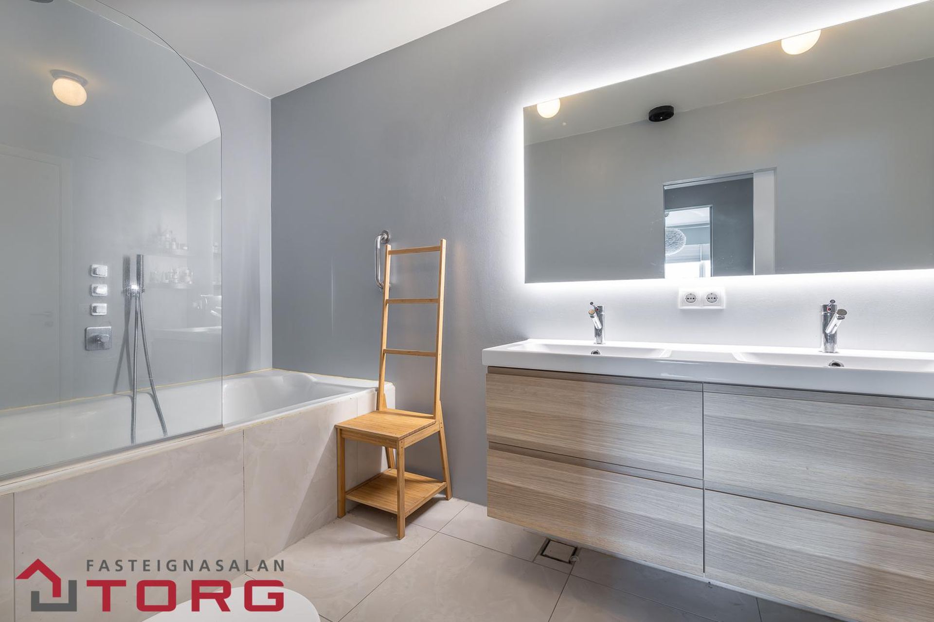 Baðherbergi: II: Stórt baðkar, fallegar nýlegar hvítar og viðarlitðarar innréttingar, tvær handlaugar, handklæðaofn, upphengt wc og flísar á gólfi.