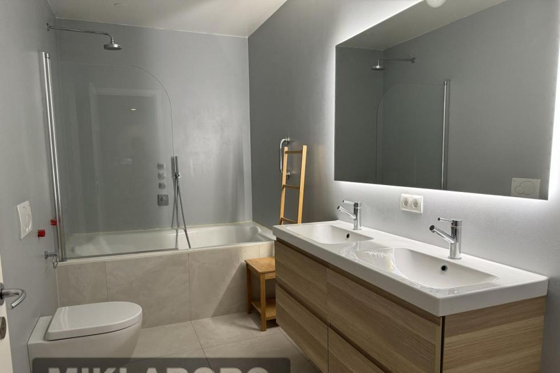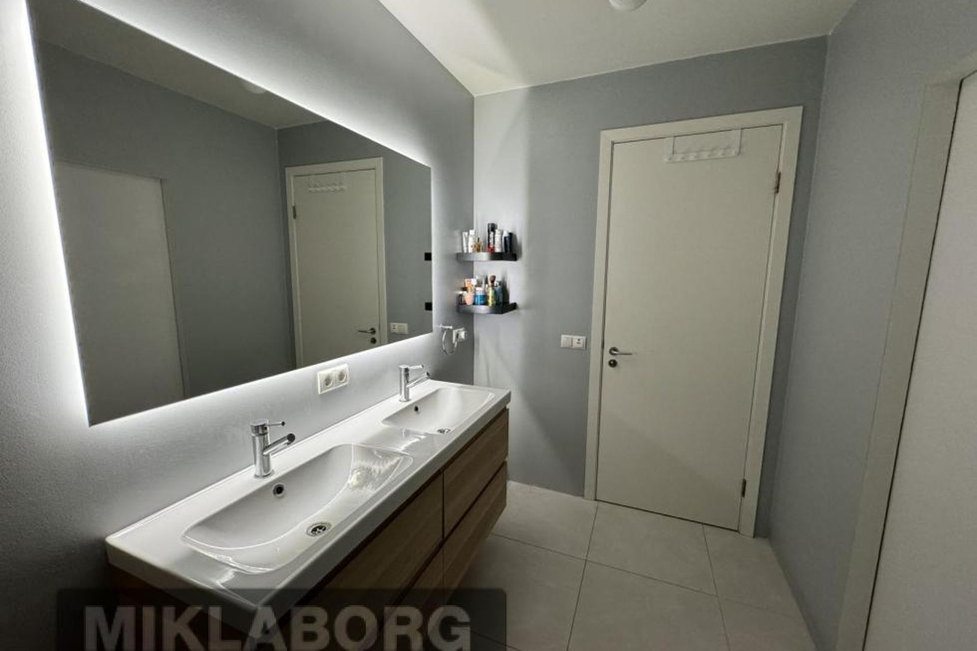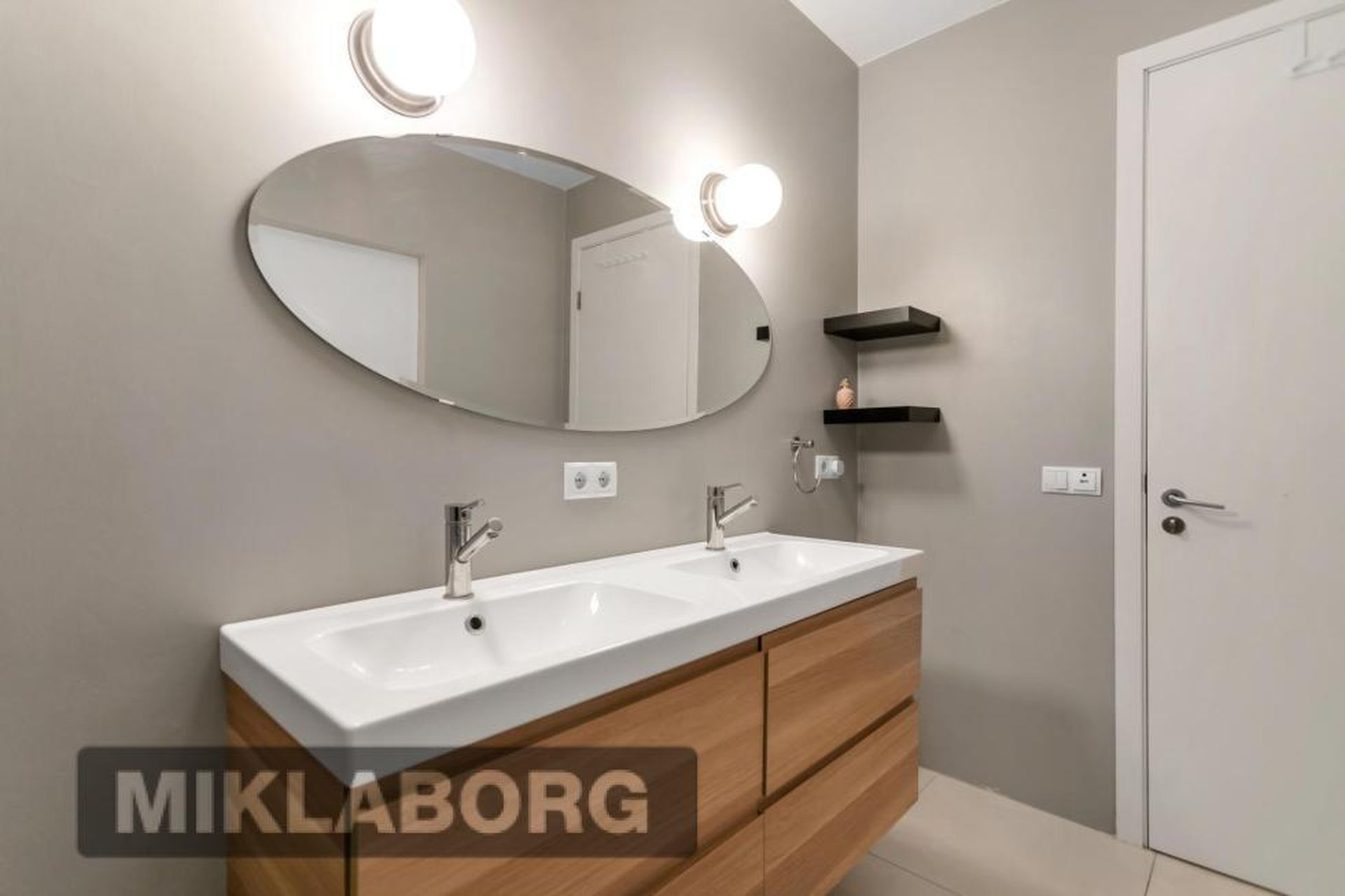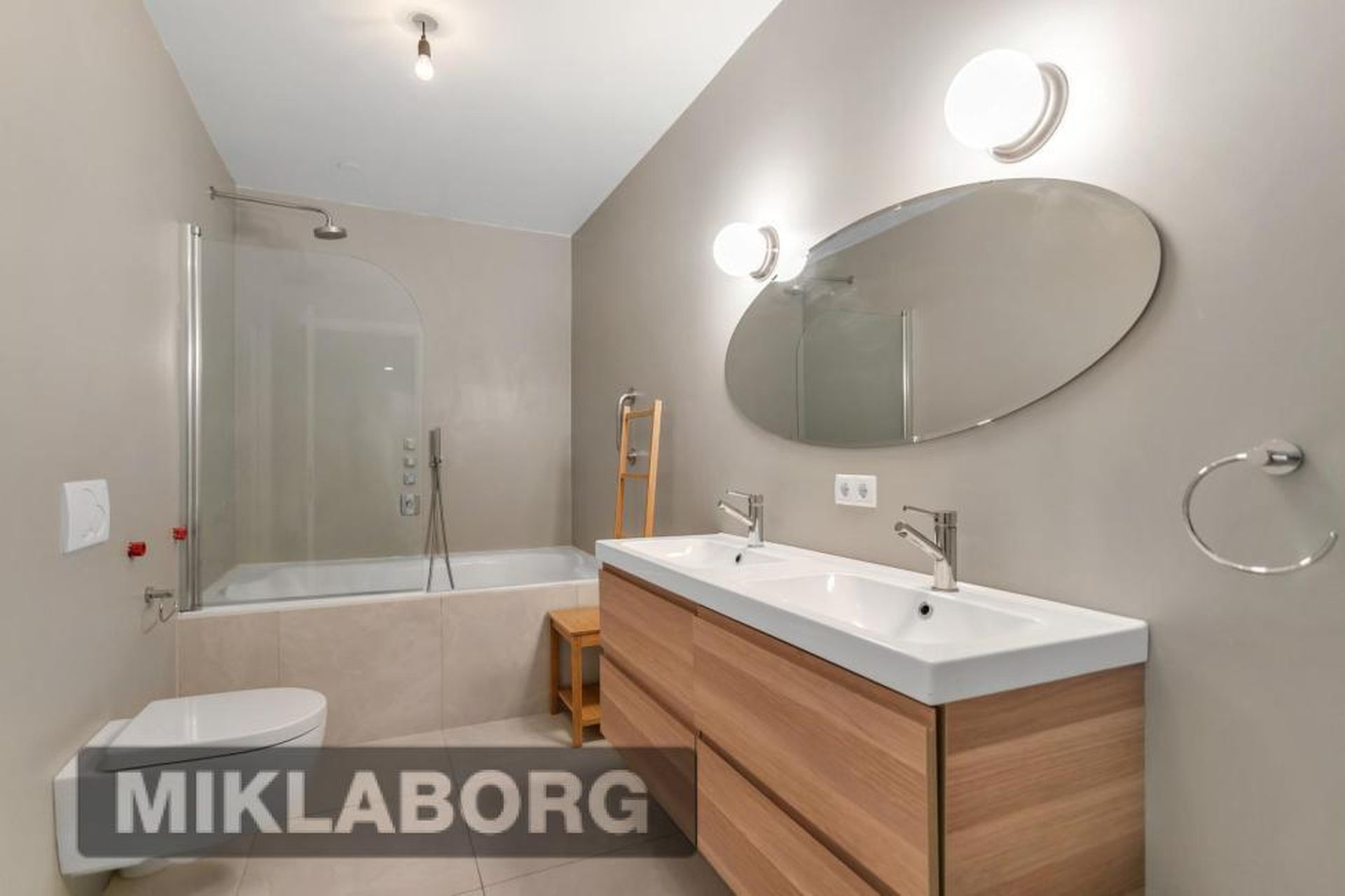 Baðherbergi: II: Stórt baðkar, fallegar nýlegar hvítar og viðarlitðarar innréttingar, tvær handlaugar, handklæðaofn, upphengt wc og flísar á gólfi.