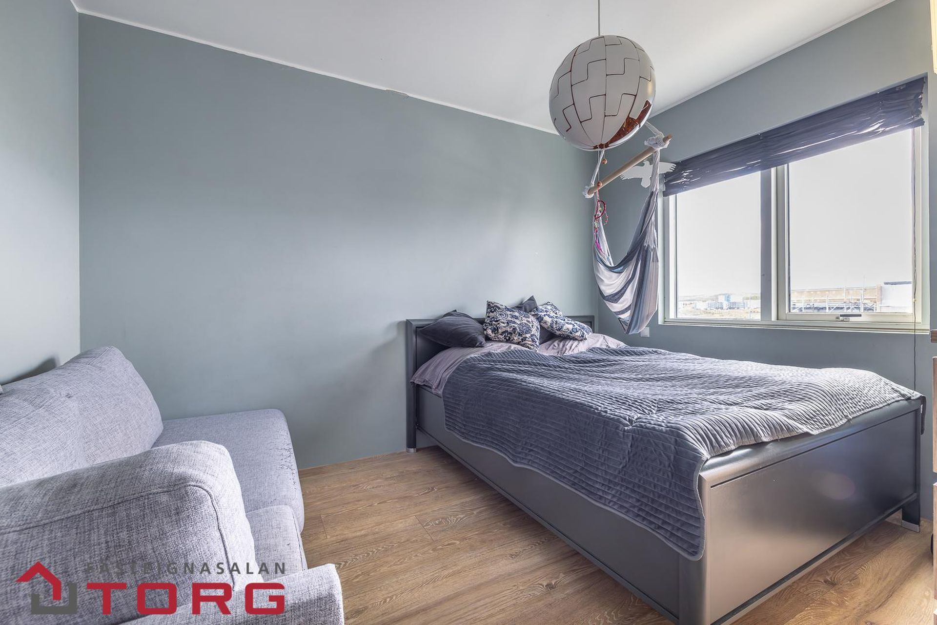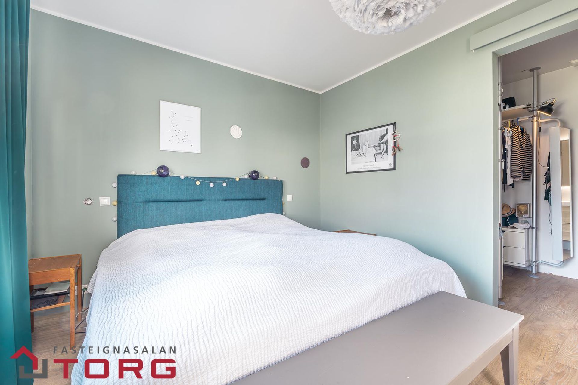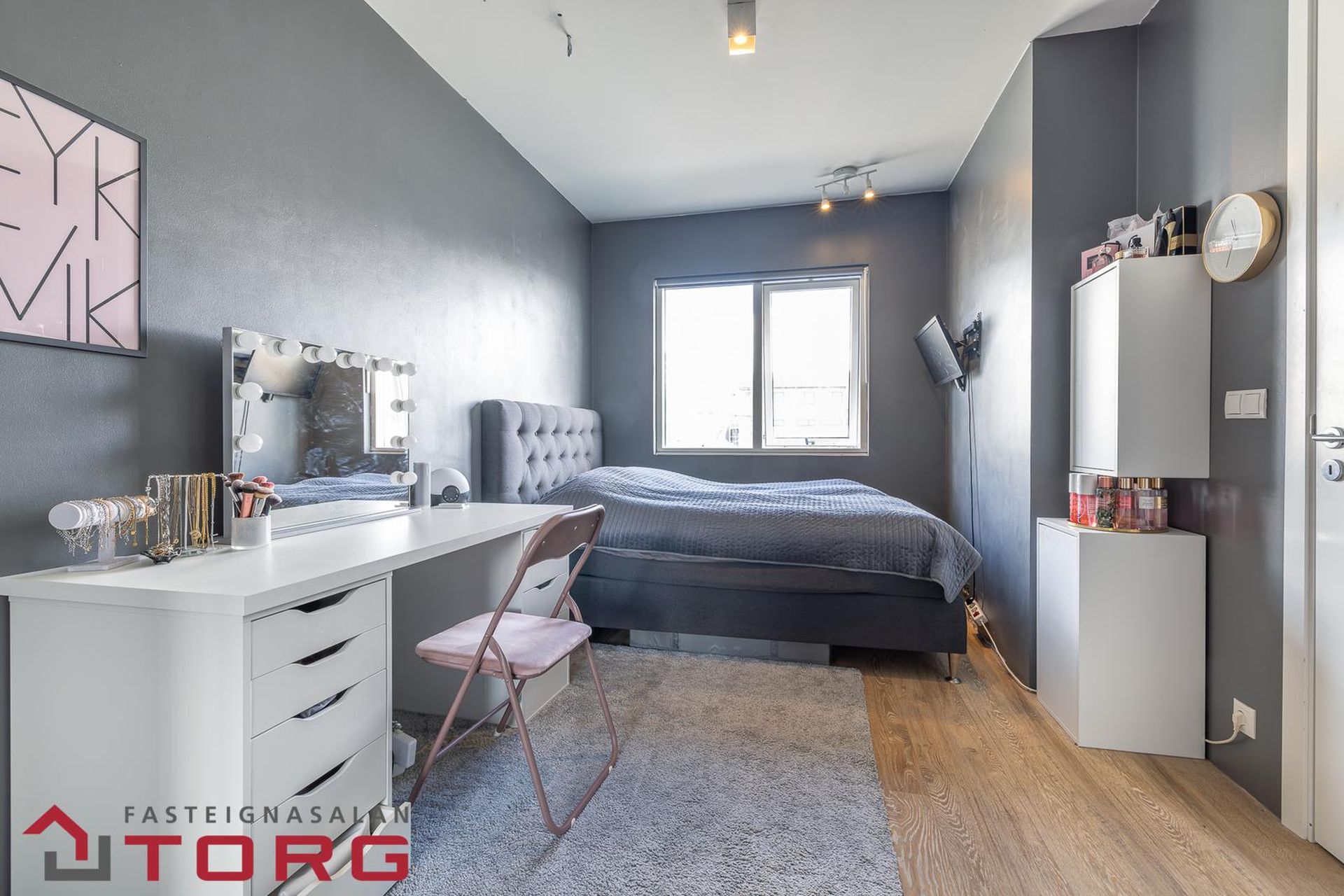 Svefnherbergi I: Rúmgott með fataskáp. Ljóst harðparket á gólfi.