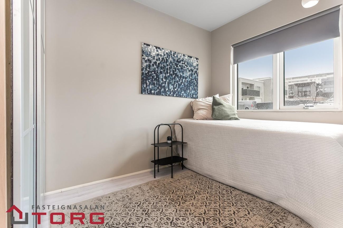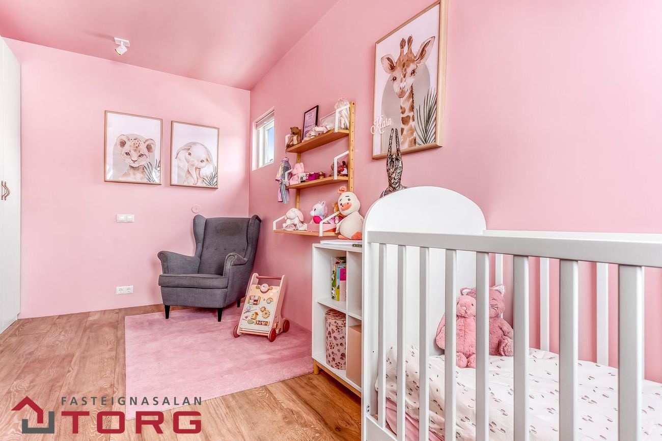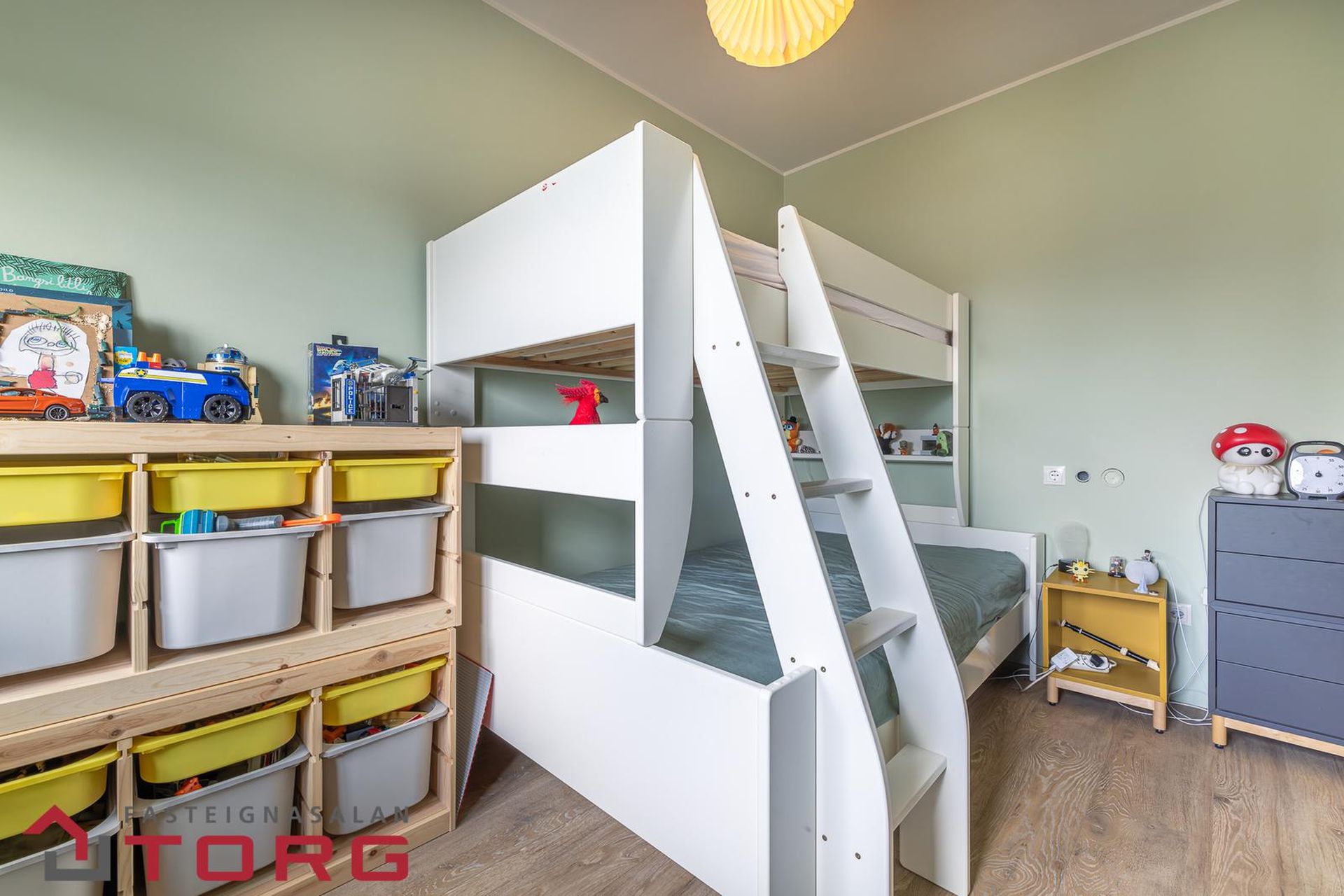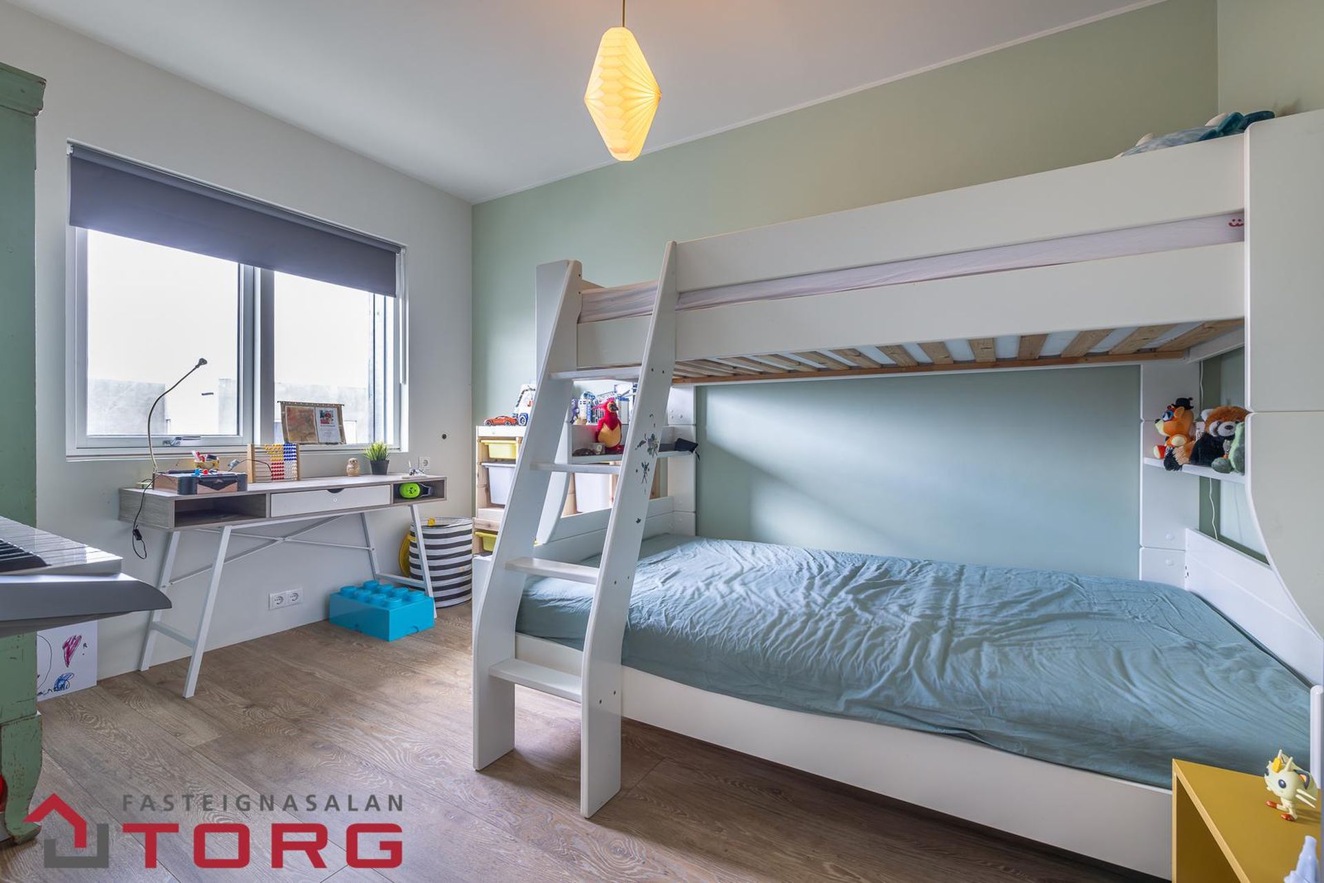 Svefnherbergi III: Rúmgott barnaherbergi með fataskáp. Viðarlitað harðparket á gólfi. Athuga ber að herberginu hefur verið breytt frá upprunalegri teikningu en það var stækkað í stað þess að hafa þriðja baðherbbergið. Það býður því upp á þann möguleika að að bæta við baðherbergi og minnka barnaherbergið.