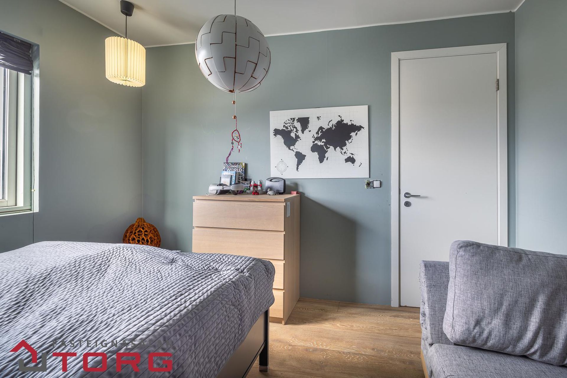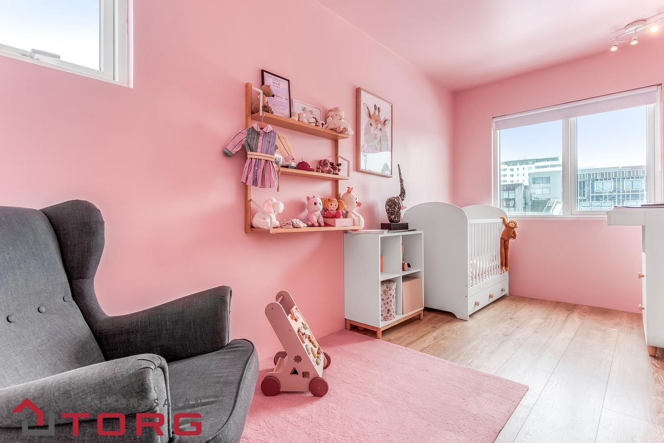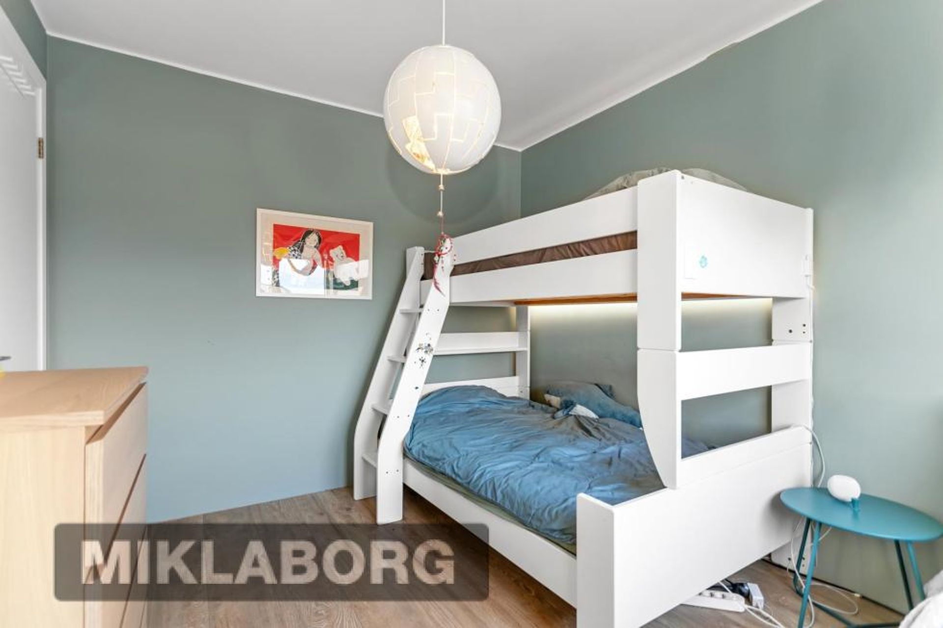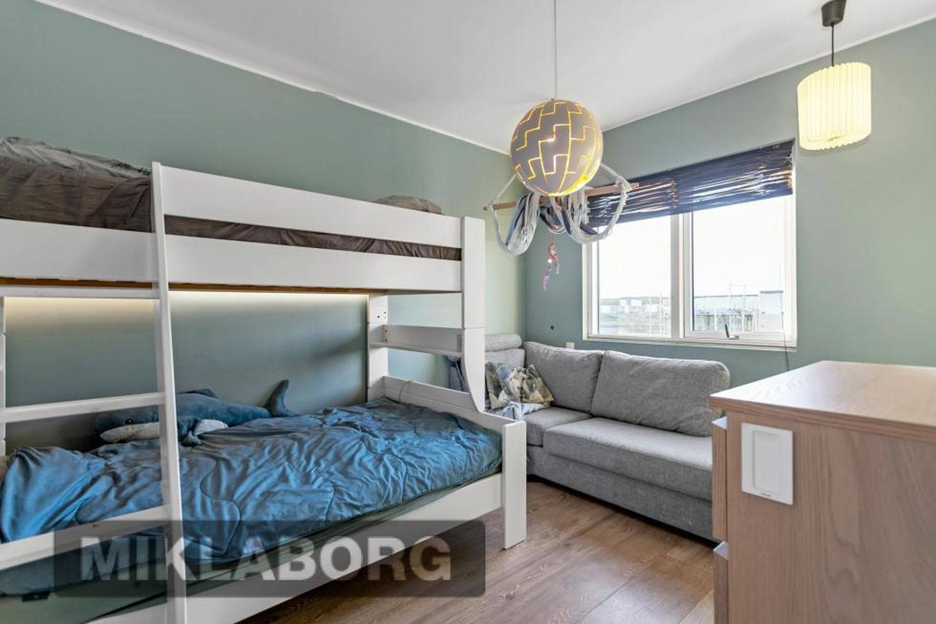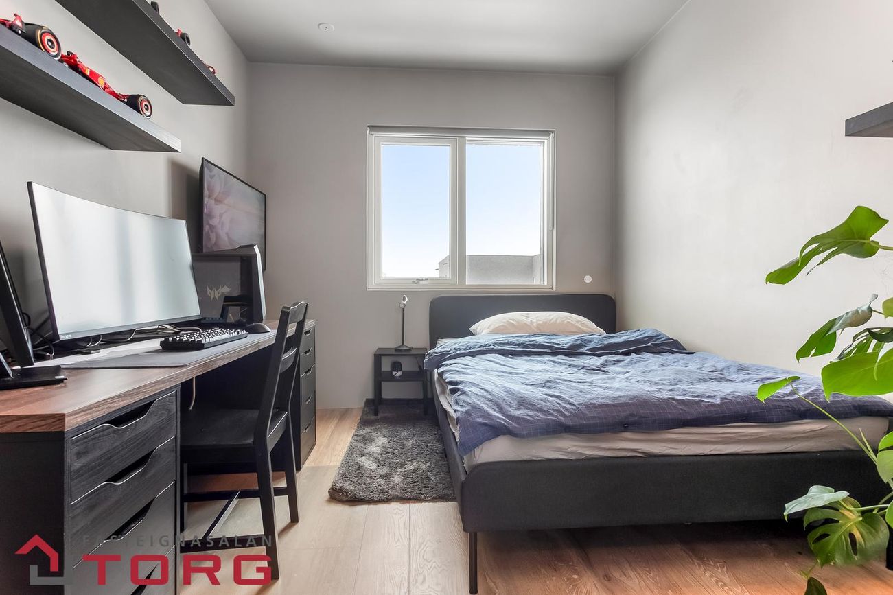 Svefnherbergi III: Rúmgott barnaherbergi með fataskáp. Viðarlitað harðparket á gólfi. Athuga ber að herberginu hefur verið breytt frá upprunalegri teikningu en það var stækkað í stað þess að hafa þriðja baðherbbergið. Það býður því upp á þann möguleika að að bæta við baðherbergi og minnka barnaherbergið.