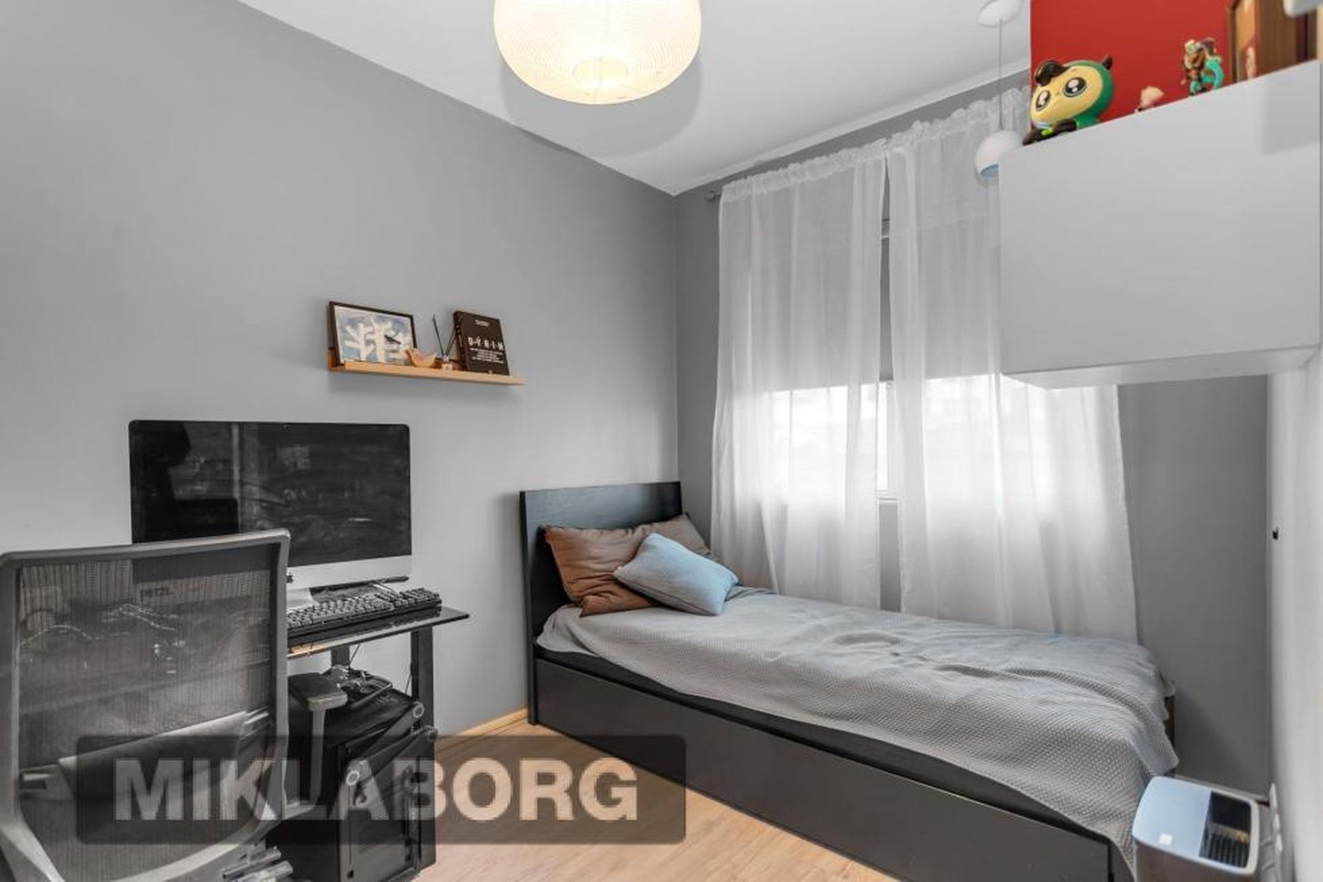 Svefnherbergi V: Rúmgott barnaherbergi með fataskáp. Viðarlitað harðparket á gólfi.