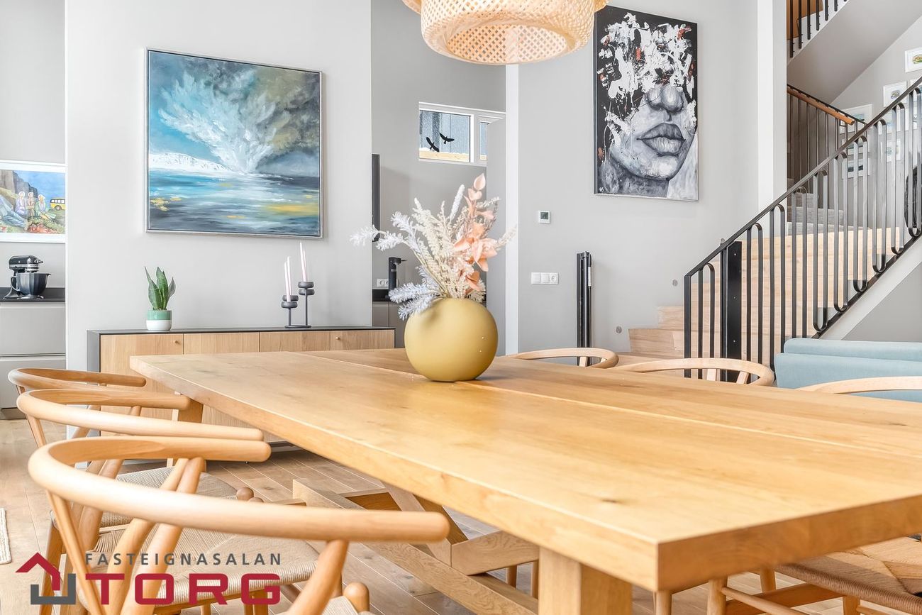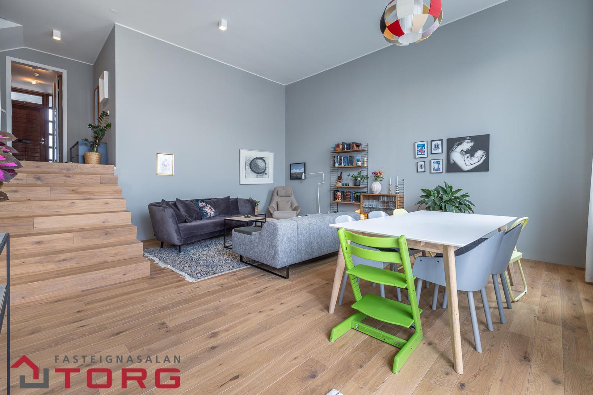 Stofa/borðstofa: Mjög björt með mikilli lofthæð. Gólfsíðir gluggar og útgengt á pall til suður-suðvesturs með hitaveitupotti. Vínkælir undir stiga fylgir. Geymslurými bakvið vínkælir undir stiga.