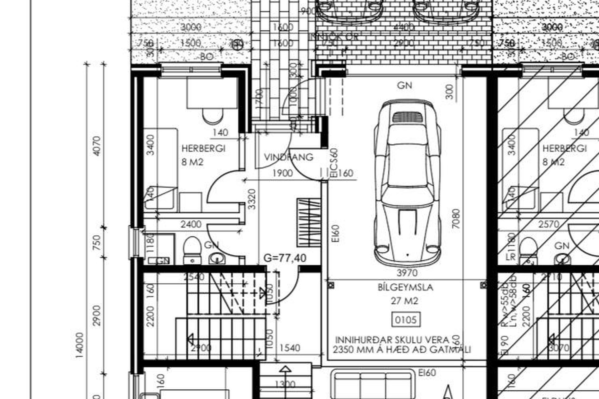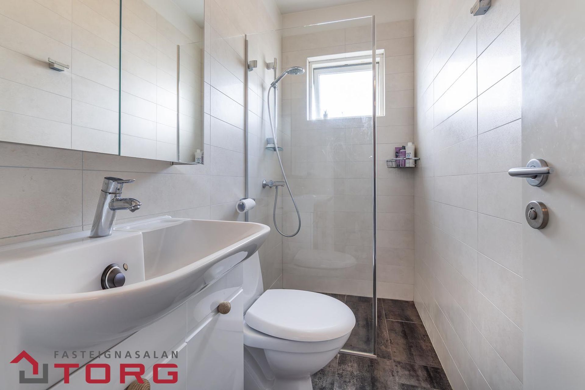 Bílskúr: Innangengt úr anddyri og útgengt úr bílskúr. Er með vinnnuvaski, lökkuðu gólfi og rafdrifinni bílskúrshurð.