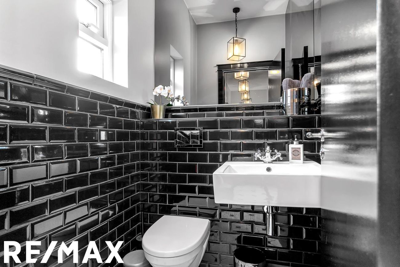 Gestasalerni í kjallara með dökkum flísum og hvítri handlaug.