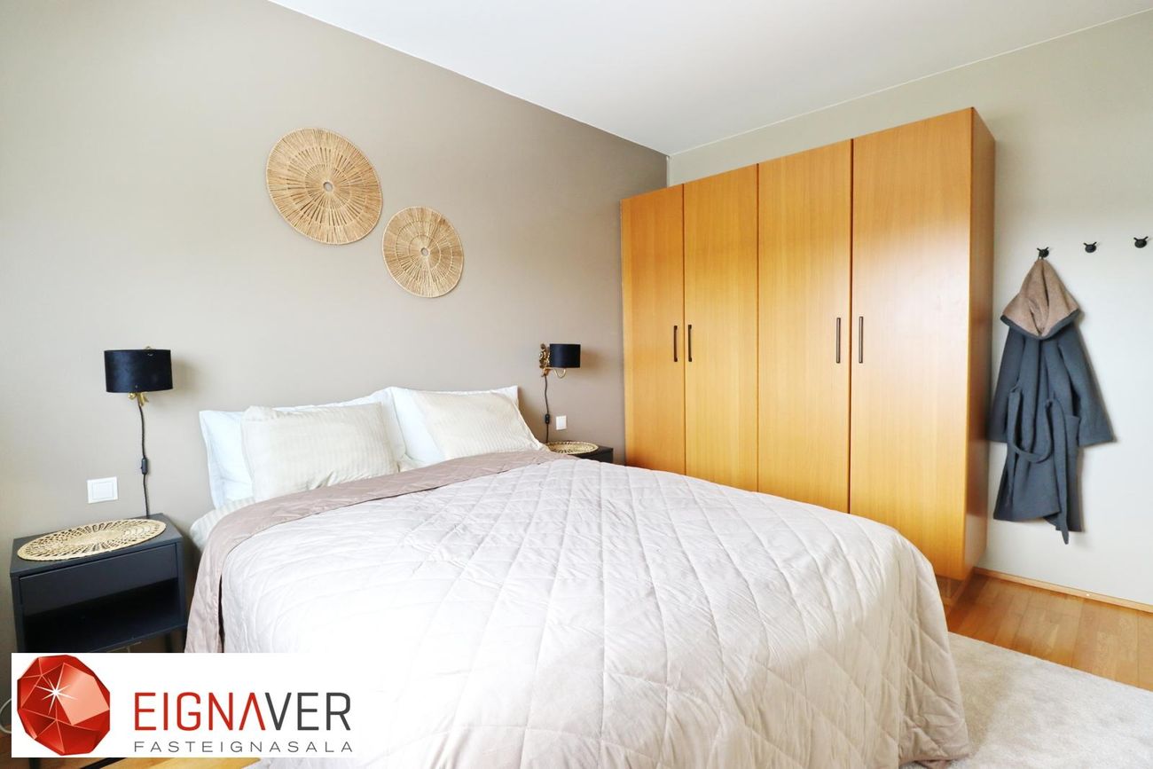 Svefnherbergin eru þrjú, parket á gólfum herbergja og fataskápur í þeim öllum.