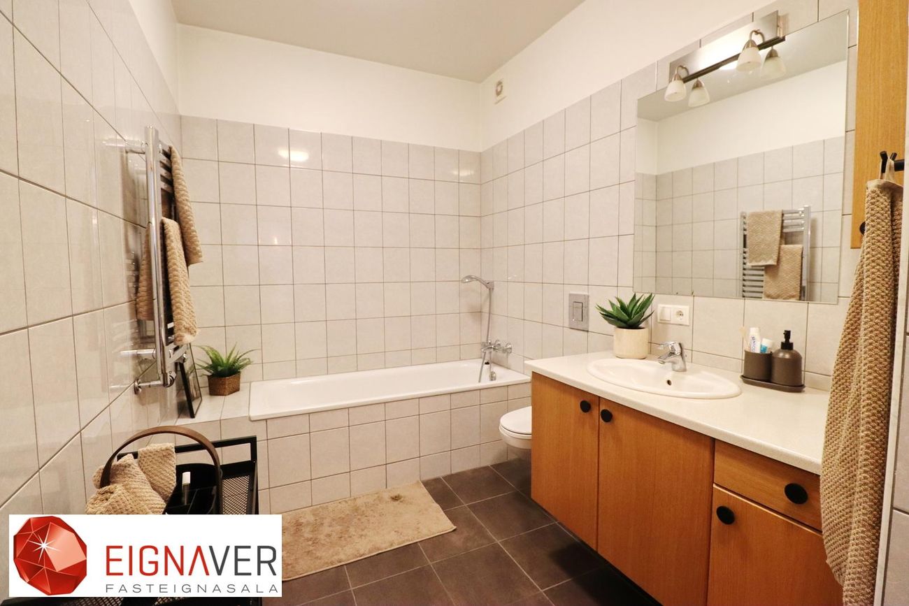 Baðherbergið er rúmgott og fallegt, flísar á gólfi og veggjum. Baðkar og sturta sér. Góð innrétting, handklæðaofn og upphengt WC.