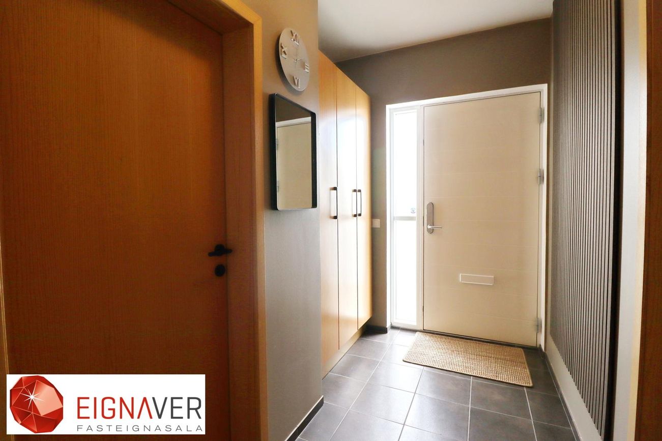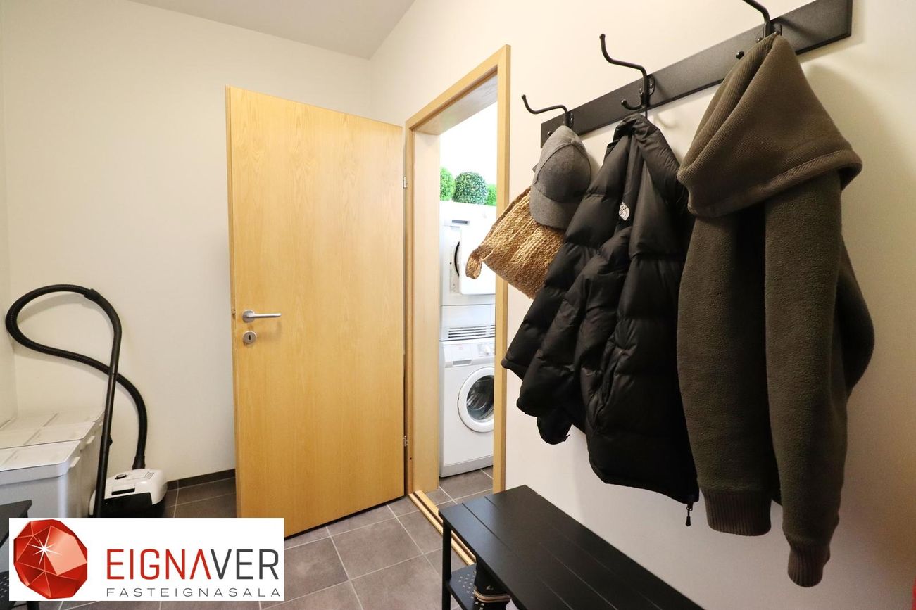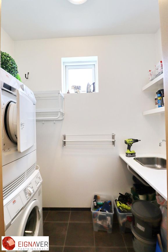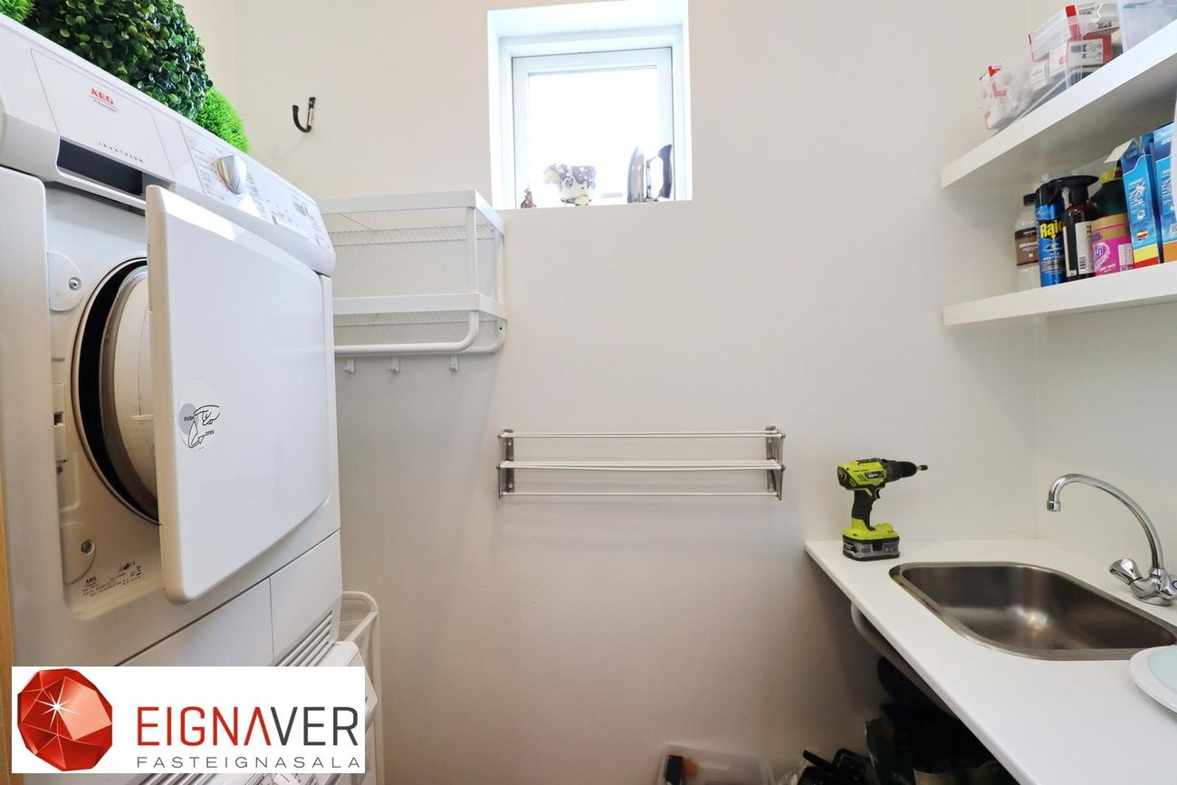 Þvottahús er innaf geymslu, innrétting og gluggi með opnanlegu fagi. Skolvaskur.