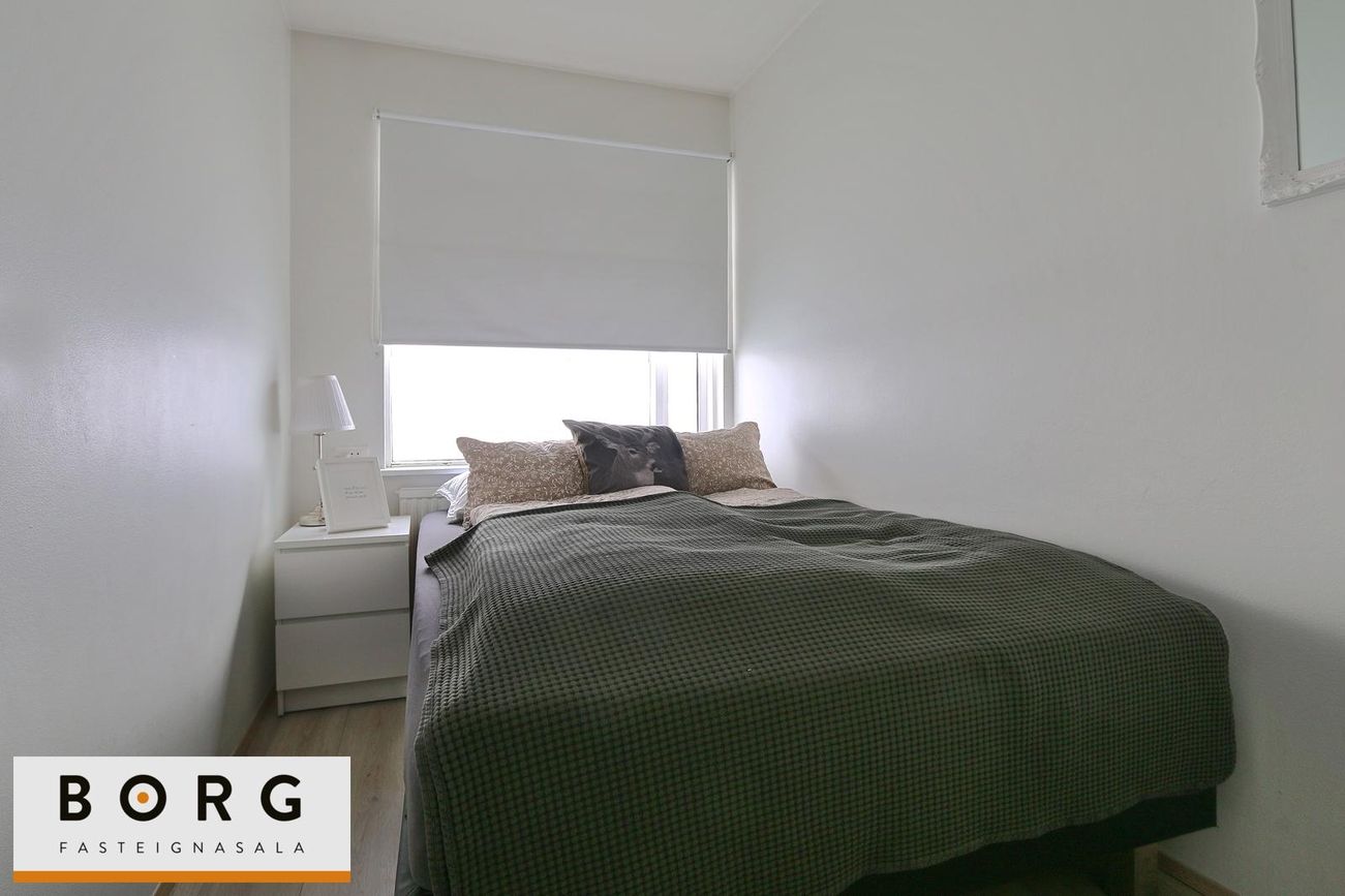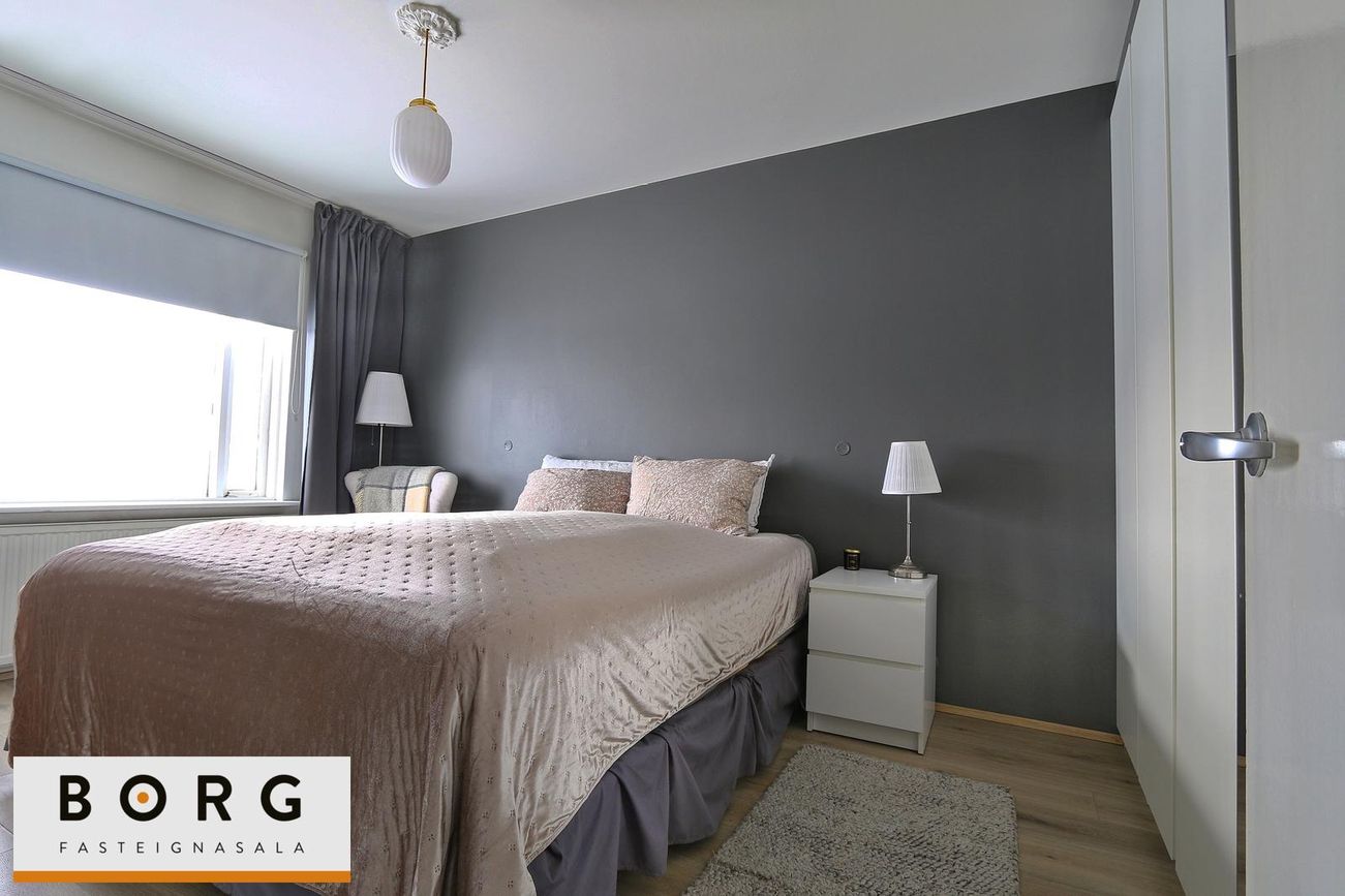 Svefnherbergin eru tvö, bæði með parket á gólfi og hjónaherbergi með fataskáp.