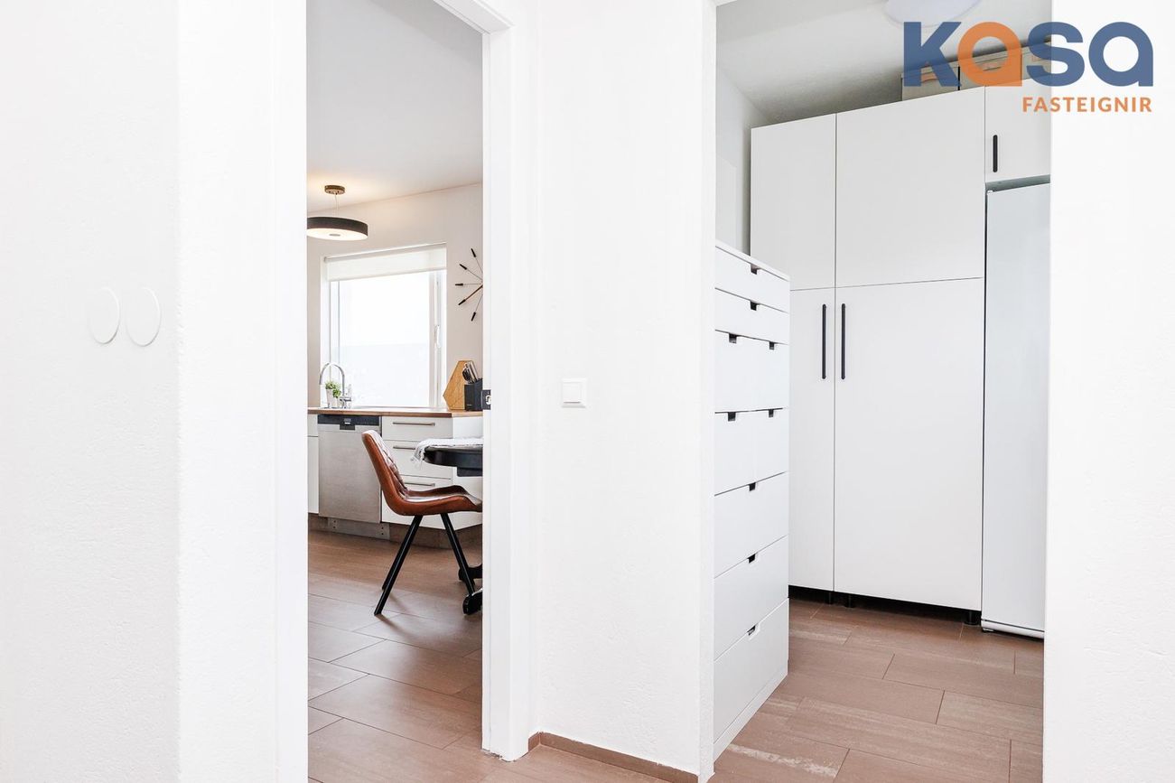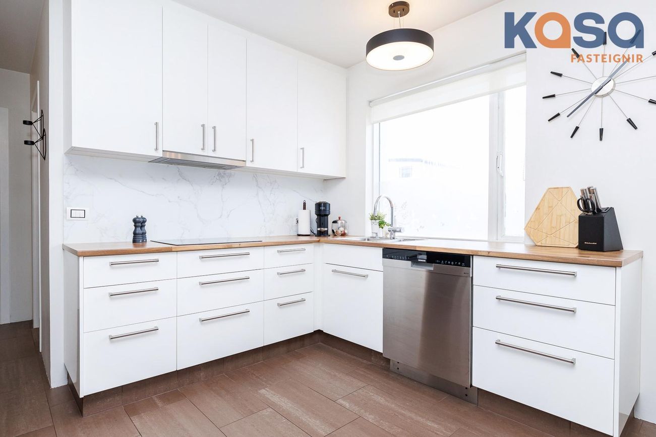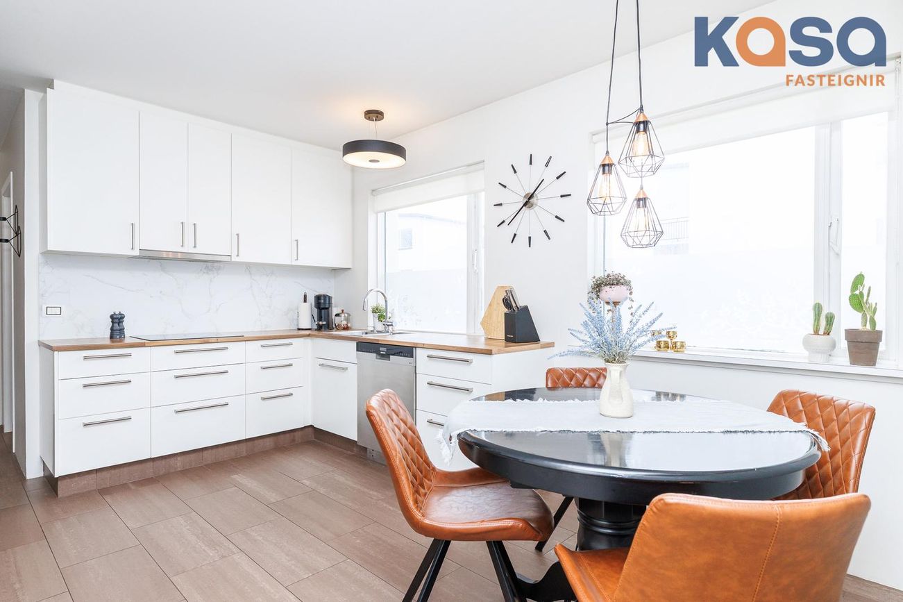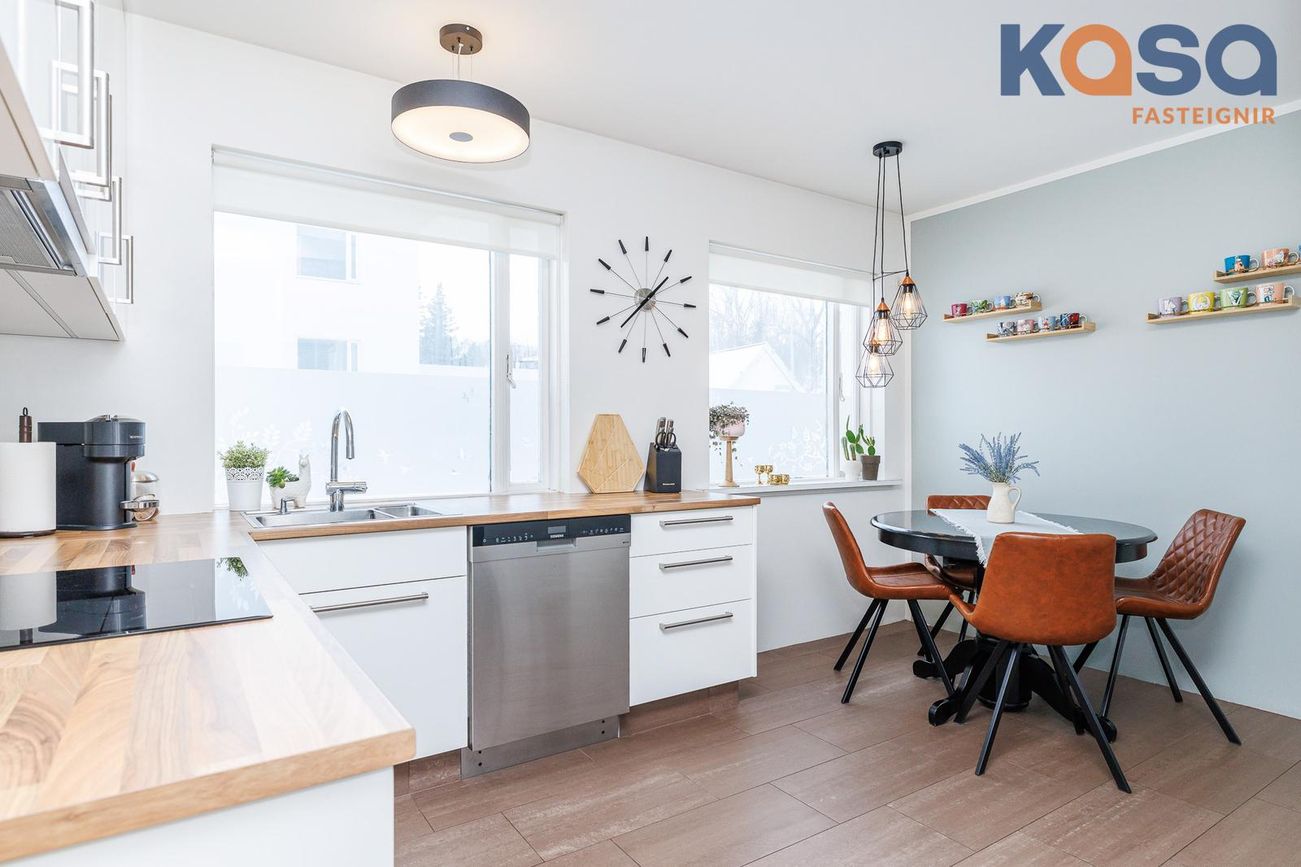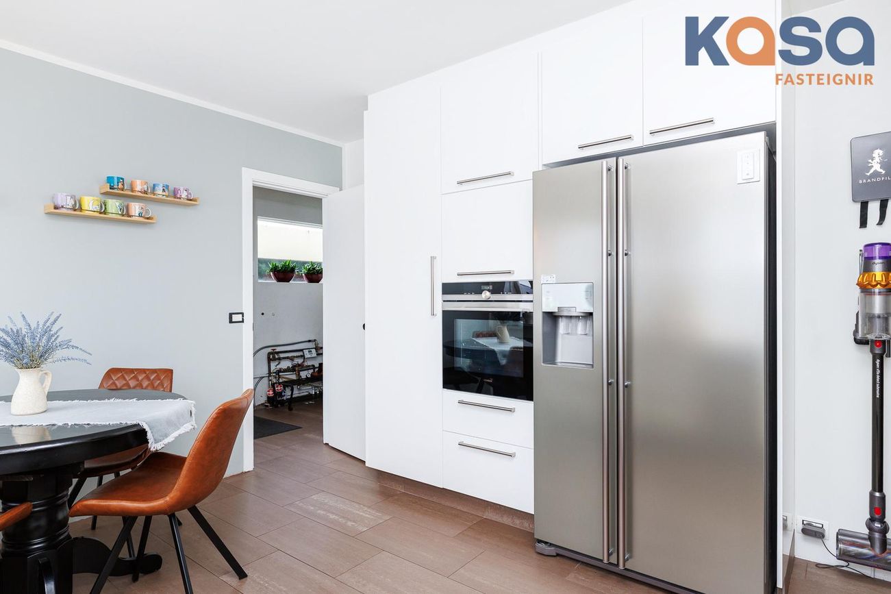 Eldhús: Var gert upp 2018. Sérsmíðaðar innréttingar með góðu skápa og skúffuplássi. Pláss er fyrir tvöfaldan ísskáp í innréttingu sem fylgir með við sölu. Bakaraofn er í vinnuhæð. Flísar eru á gólfum og gólfhiti.