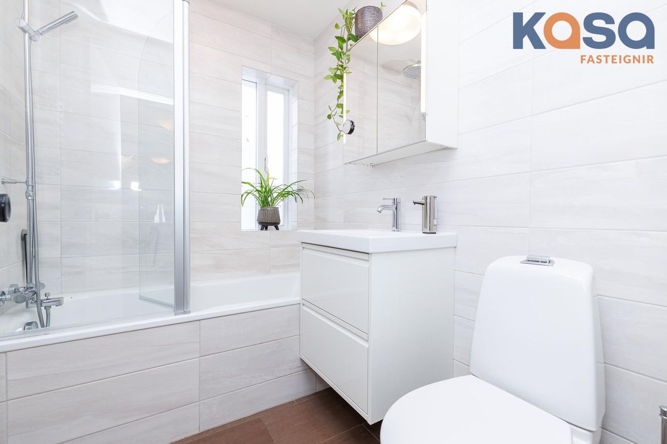 Baðherbergi: Var einnig gert upp 2018, það er flísalagt í hólf og gólf. Lítil skúffu innrétting með vaski og efriskáp. Baðkar með sturtutækjum. Salerni og handklæða ofn. Hiti er í gólfum.