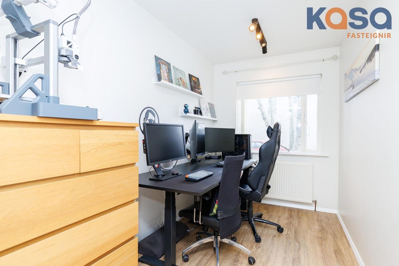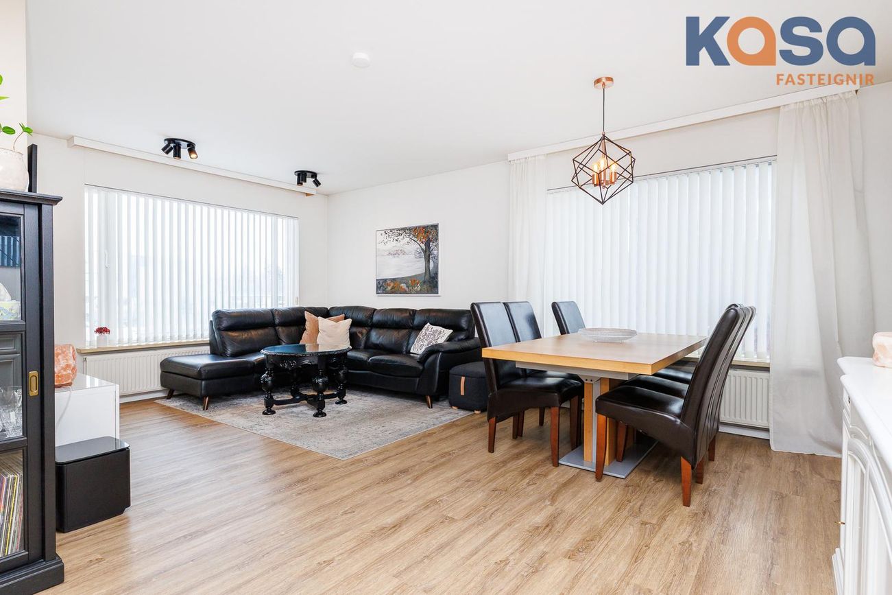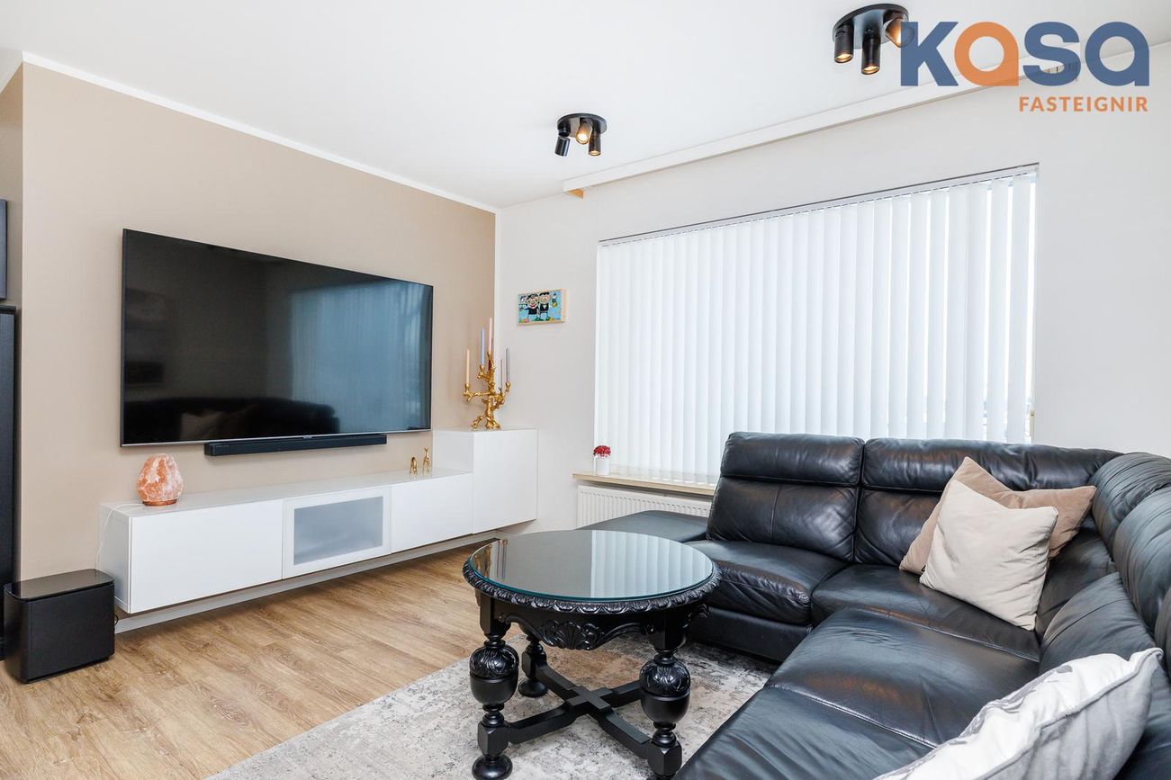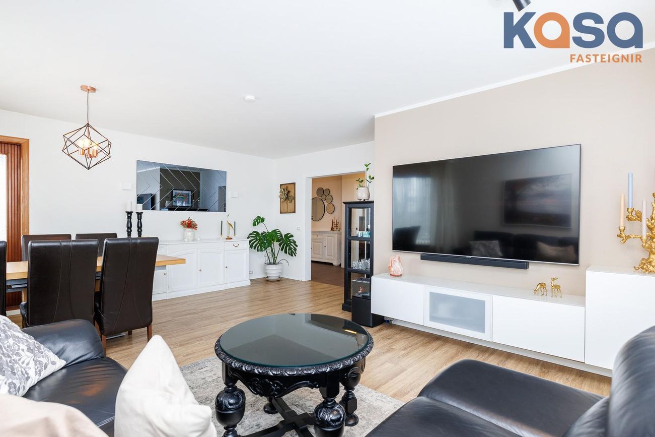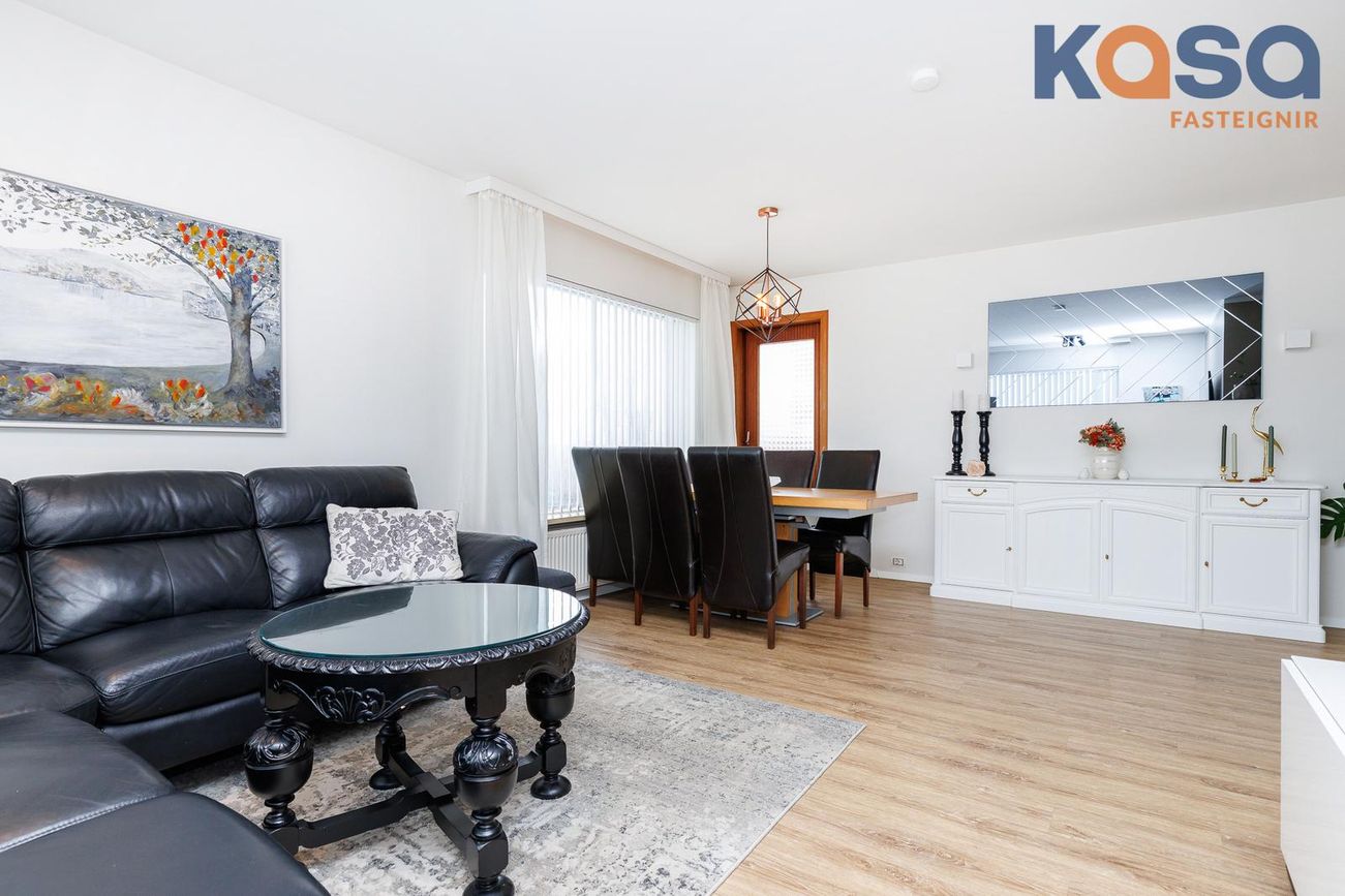 Stofa: Er mjög rúmgóð og rýmar borðstofu og sjónvarpsstofu. Bjart rými með stórum gluggum til tveggja átta. Gengið er út á litla verönd úr stofu.