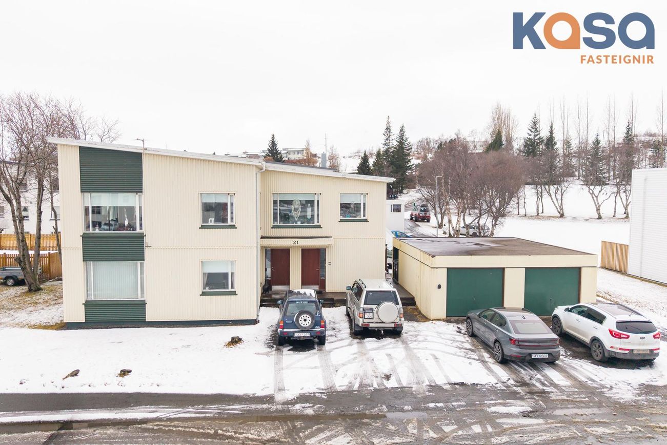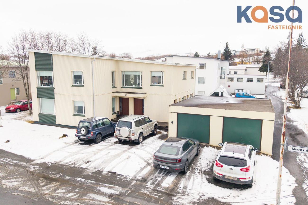 Kasa fasteignir 461-2010.Skarðshlíð 21 íbúð 101. Björt og mikið uppgerð 4 herbergja neðrihæð í tvíbýli með bílskúr á góðum stað í þorpinu. Íbúðin sjálf er skráð 120fm og bílskúr 28fm.
