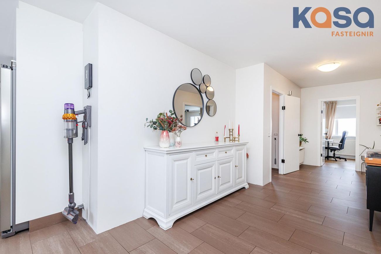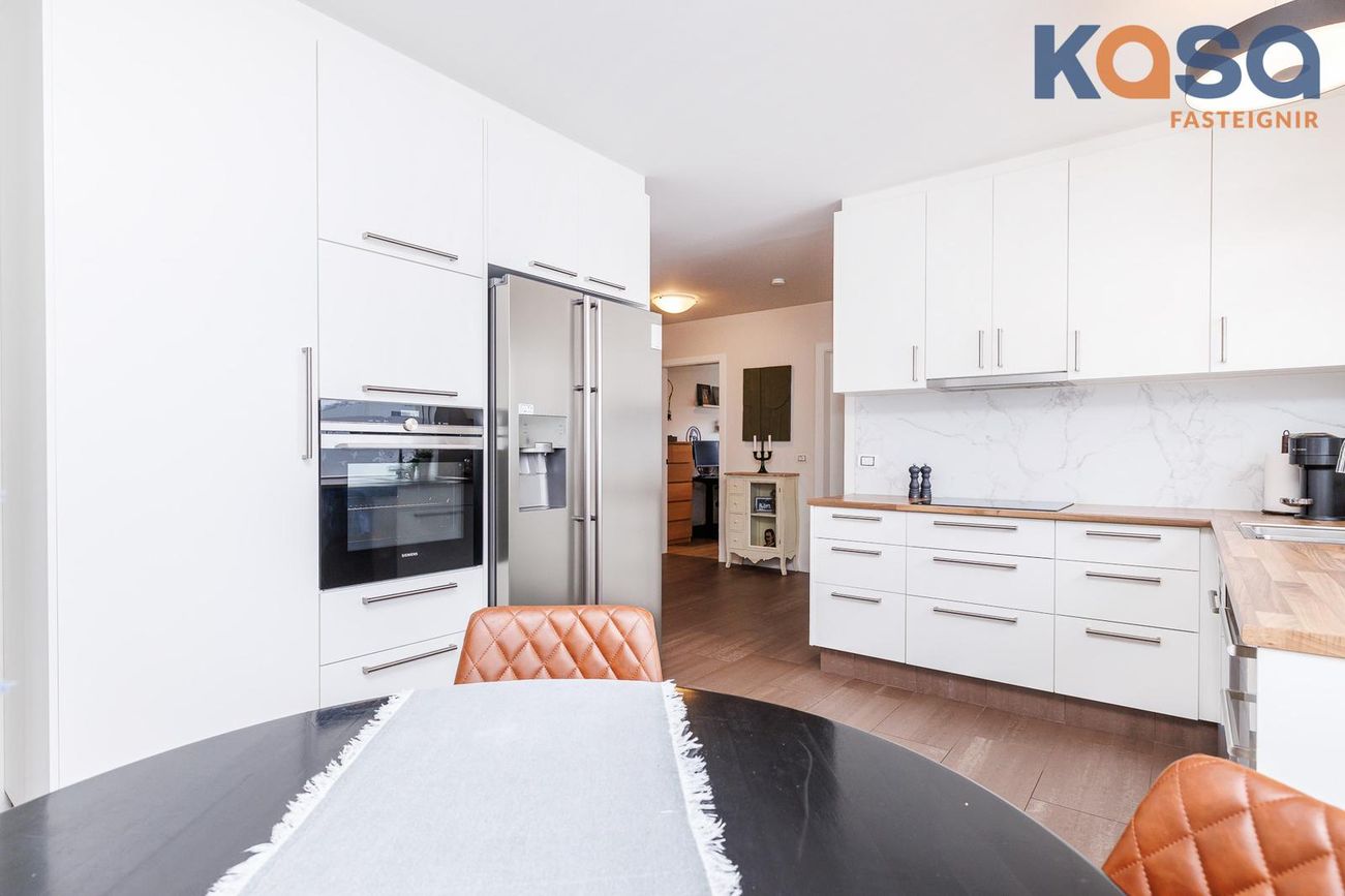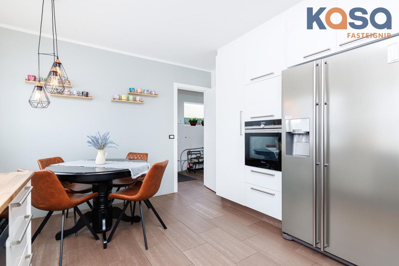 Eldhús: Var gert upp 2018. Sérsmíðaðar innréttingar með góðu skápa og skúffuplássi. Pláss er fyrir tvöfaldan ísskáp í innréttingu sem fylgir með við sölu. Bakaraofn er í vinnuhæð. Flísar eru á gólfum og gólfhiti.