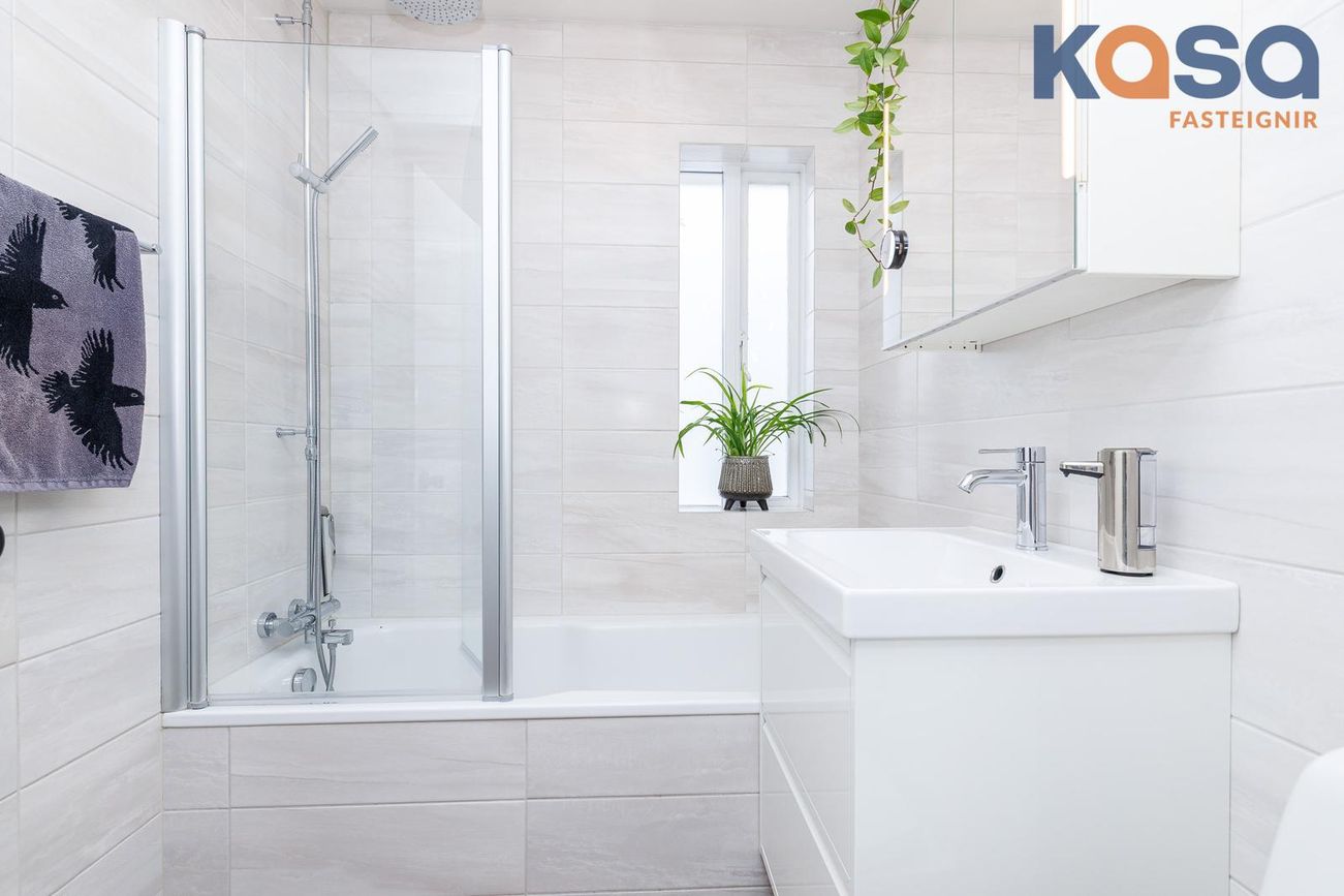 Baðherbergi: Var einnig gert upp 2018, það er flísalagt í hólf og gólf. Lítil skúffu innrétting með vaski og efriskáp. Baðkar með sturtutækjum. Salerni og handklæða ofn. Hiti er í gólfum.