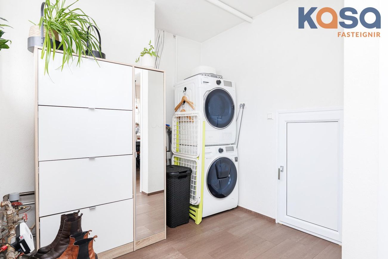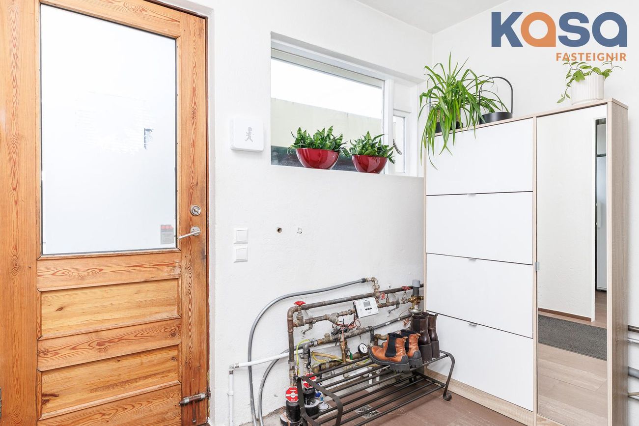 Þvottahús: Er með flísum á gólfi, þar er einnig bakinngangur. Lítil geymsla er inn af þvottahúsi ásamt geymslu í kjallara sem er flísalögð með hillurekkum.