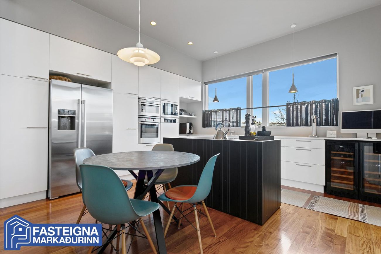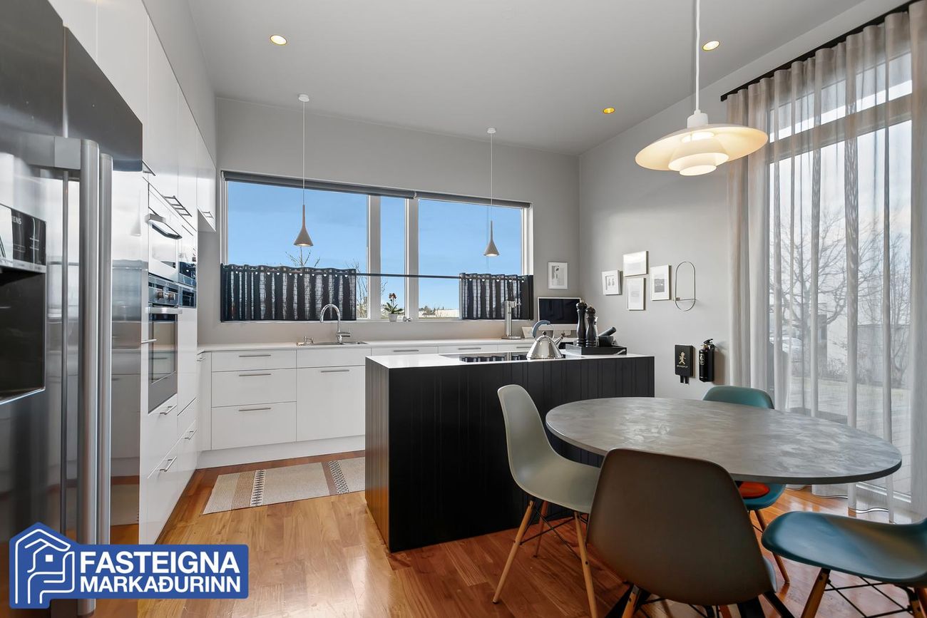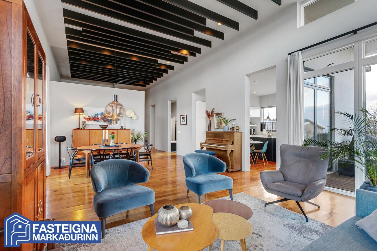 Samliggjandi stofur, parketlagðar, rúmgóðar og bjartar með gólfsíðum gluggum, arinn, rennihurð er út á verönd með heitum potti. Verulega aukin lofthæð er í stofum.