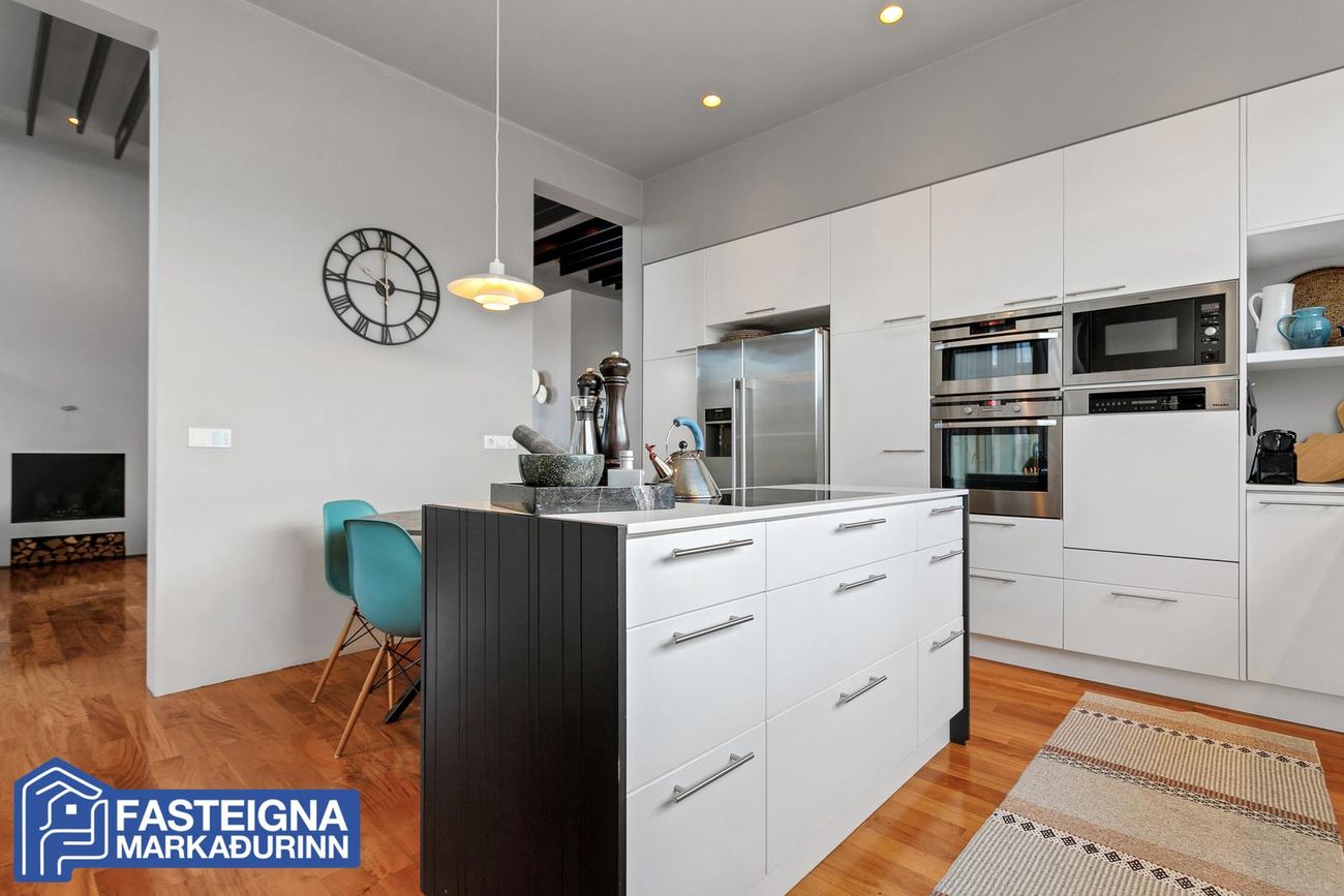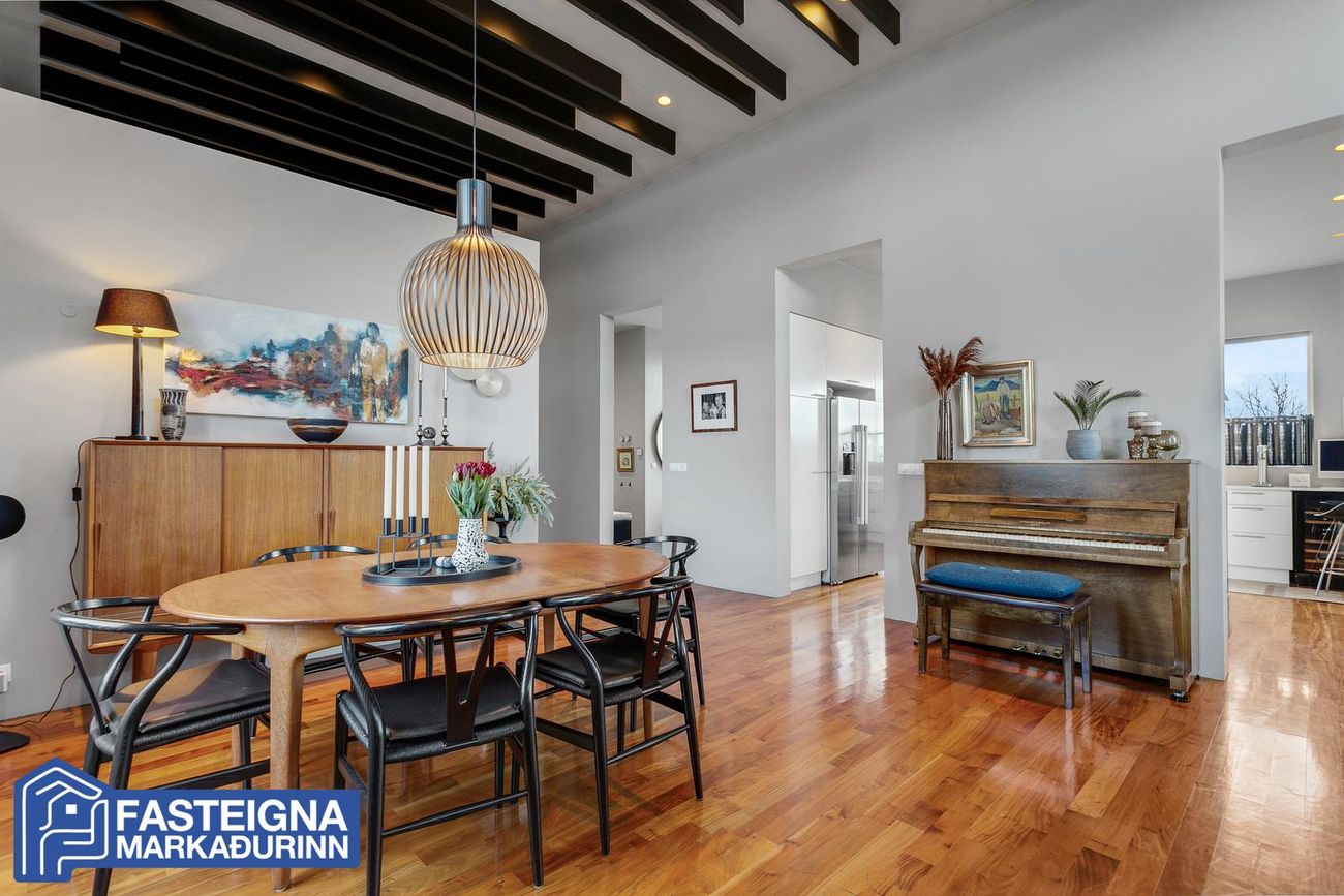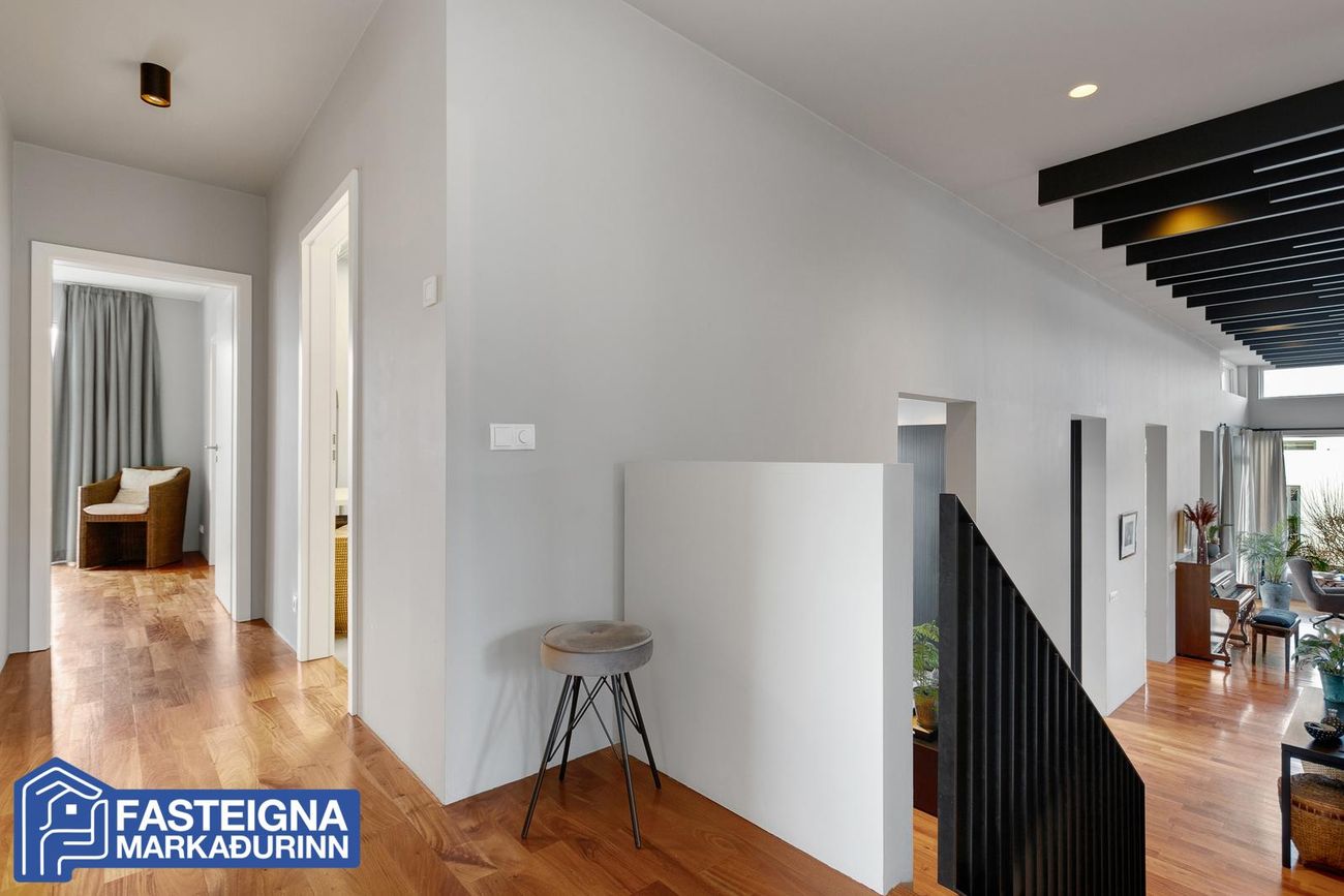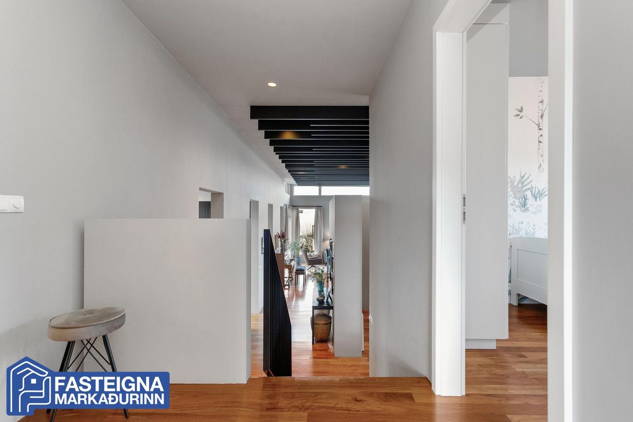 Mikil lofthæð er í húsinu sem er með gegnheilu parketi á öllu nema anddyri og votrýmum. Verulega aukin lofthæð er í stofu sem er með fallegum loftbitum, arni og gólfsíðum gluggum. Endurbætur á innanhússhönnun voru gerðar af Rut Kára árið 2018.
