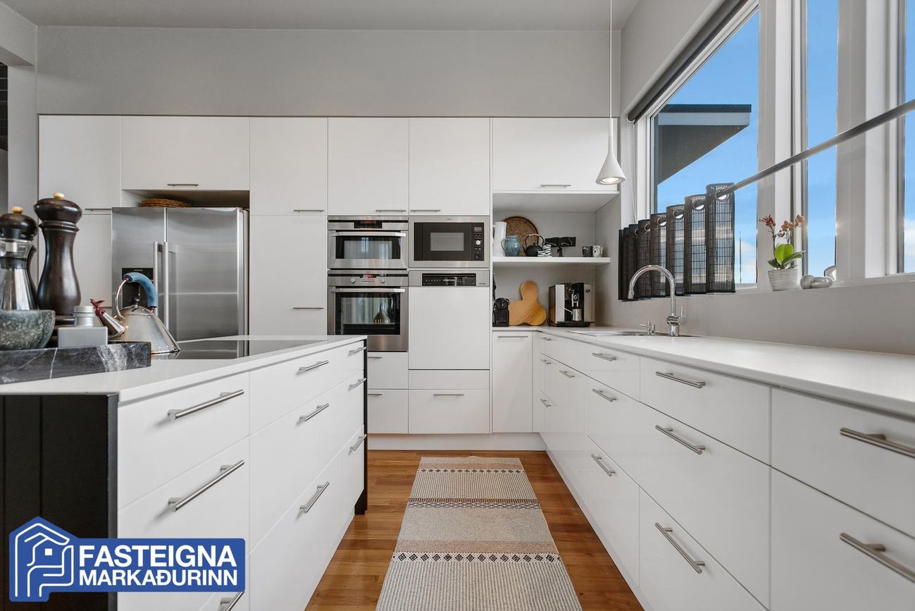 Eldhús, opið við stofur og hol, flísalagt, bjart og rúmgott með mjög fallegum hvítum sérsmíðuðum innréttingum með kvartssteini á borðum, tvöföldum ísskáp með klakavél, tveimur ofnum í vinnuhæð, og örbylgju, búrskáp, eyja með spanhelluborði, innbyggð uppþvottavél og góðri borðaðstöðu. Útgengi er á á verönd frá eldhúsi.