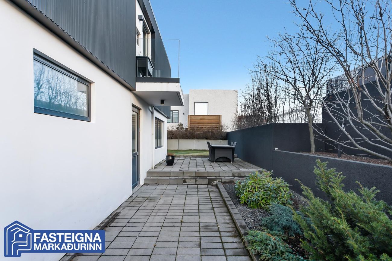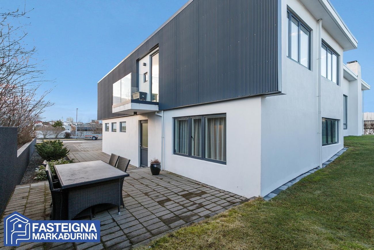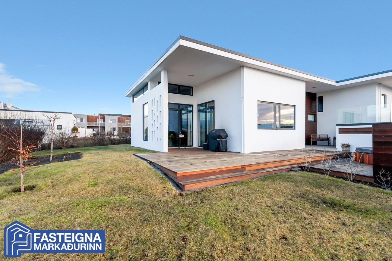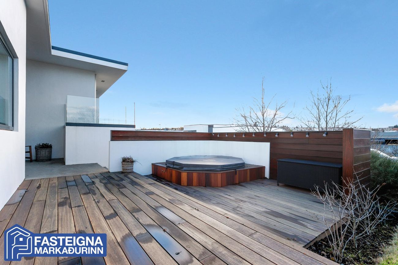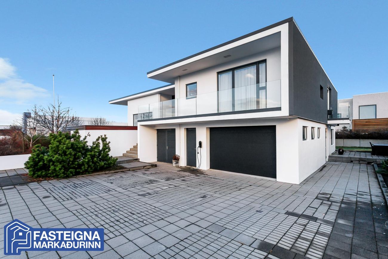 Fasteignamarkaðurinn ehf. s: 570-4500 kynnir til sölu virkilega glæsilegt, vandað og vel skipulagt 268,2 fermetra einbýlishús á tveimur hæðum með tvöföldum bílskúr á eftirsóttum stað við Skeiðakur í Garðabæ. Húsið sem teiknað er af Kára Eiríkssyni stendur á fallegri afgirtri eignarlóð með viðarveröndum, skjólveggjum og heitum potti. Stúdíó er á jarðhæð með sérinngangi.