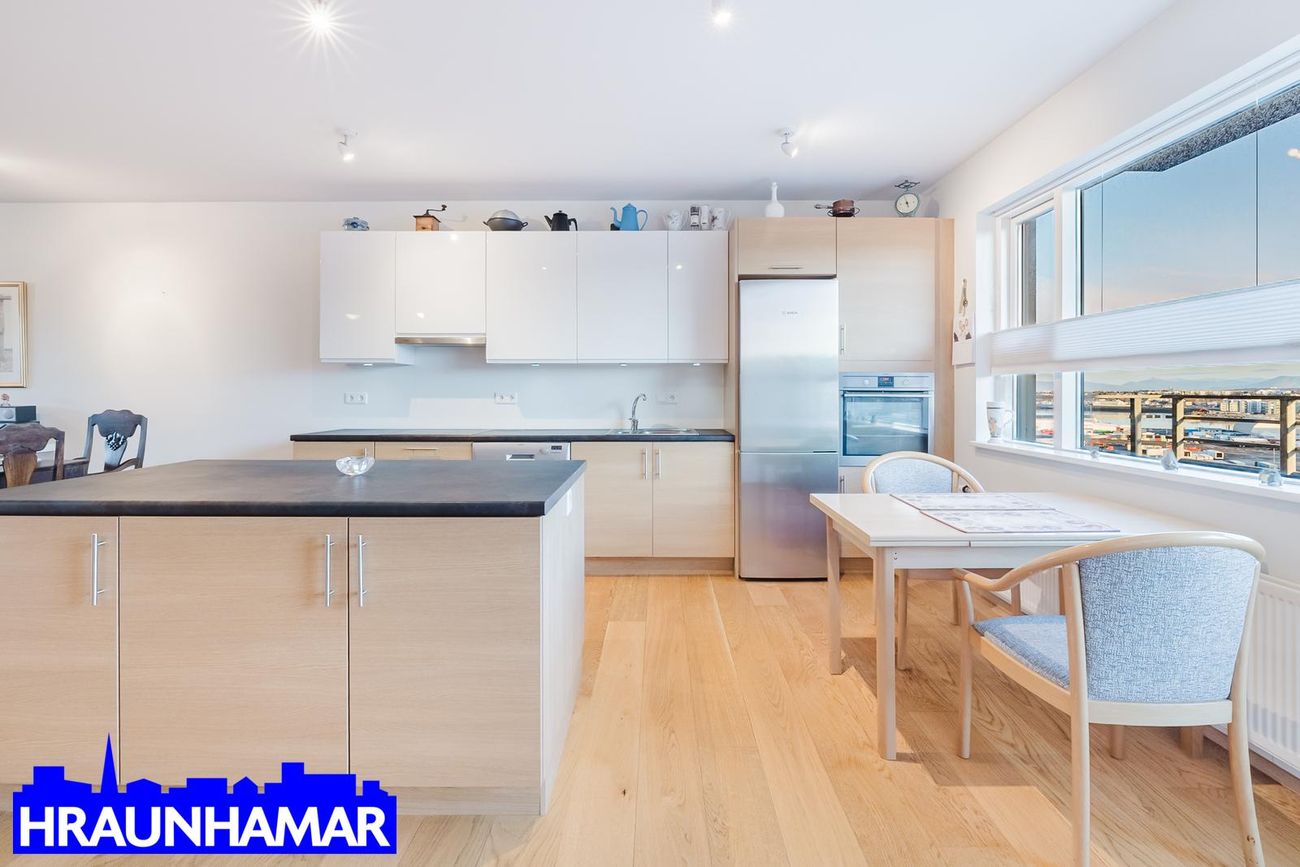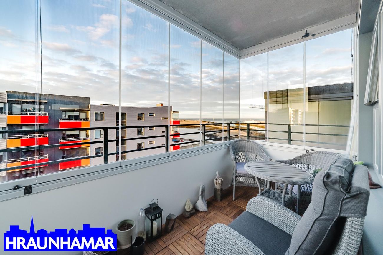 Hraunhamar fasteignasala og Helgi Jón Harðarson sölustj. s. 893-2233 helgi@hraunhamar.is kynna: Afar fallega og bjarta, rúmgóða 4-5 herbergja 131,5 fm á 6 hæð (efstu) í vönduðu fjölbýli fyrir 50 ára og eldri. Frábært útsýni og staðsetning. Sér stæði á besta stað í bílageymslu fylgir. Rúmgóð sér geymsla í sameign (er í fermetratölu eignar.) Tvennar svalir m.a. yfirbyggðar svalir í vestur. Ath: íbúðin nær í gegnum húsið og því mjög skemmtileg og björt. Laus fljótlega.Lýsing eignar: Forstofa með skápum,