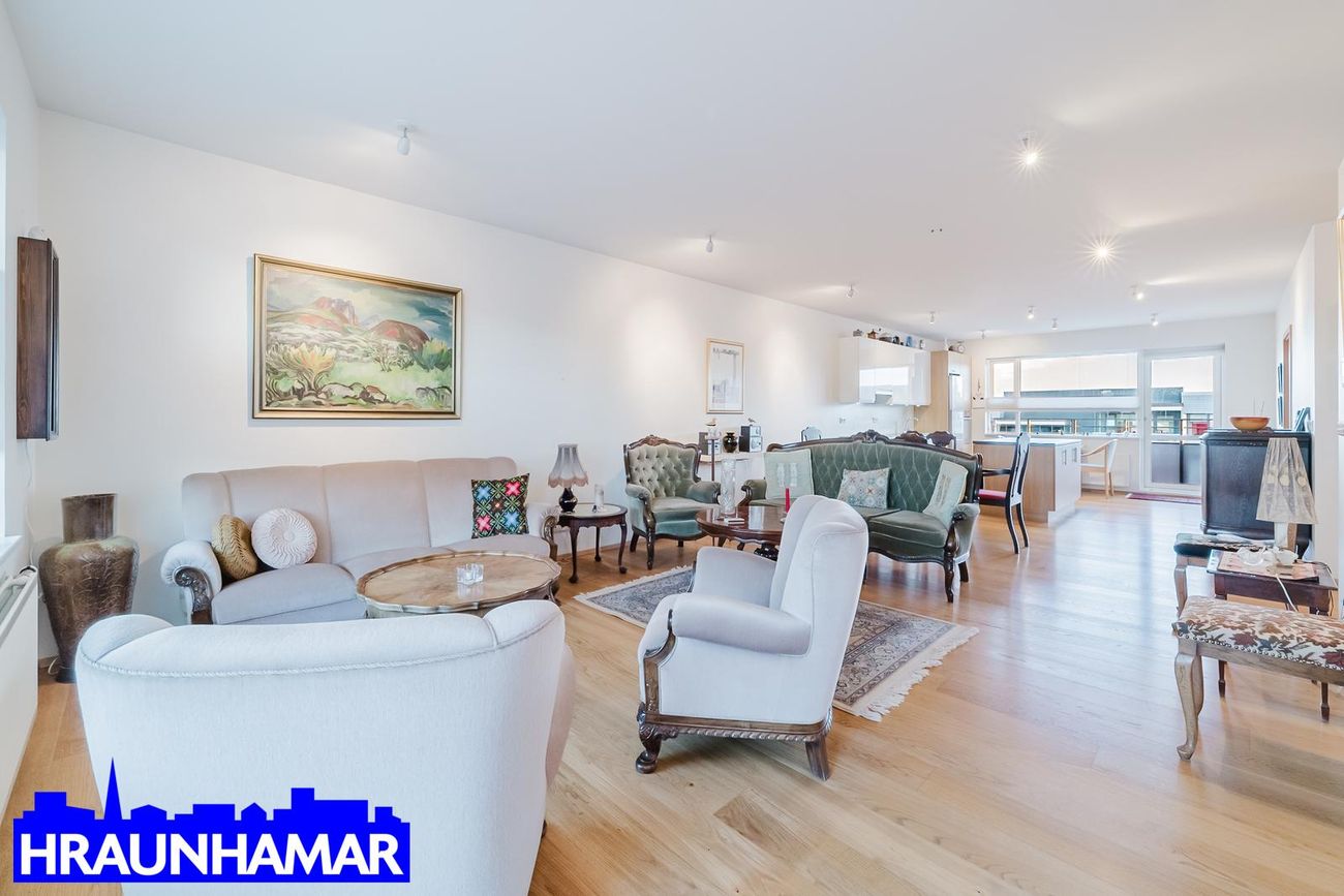 Hraunhamar fasteignasala og Helgi Jón Harðarson sölustj. s. 893-2233 helgi@hraunhamar.is kynna: Afar fallega og bjarta, rúmgóða 4-5 herbergja 131,5 fm á 6 hæð (efstu) í vönduðu fjölbýli fyrir 50 ára og eldri. Frábært útsýni og staðsetning. Sér stæði á besta stað í bílageymslu fylgir. Rúmgóð sér geymsla í sameign (er í fermetratölu eignar.) Tvennar svalir m.a. yfirbyggðar svalir í vestur. Ath: íbúðin nær í gegnum húsið og því mjög skemmtileg og björt. Laus fljótlega.Lýsing eignar: Forstofa með skápum,