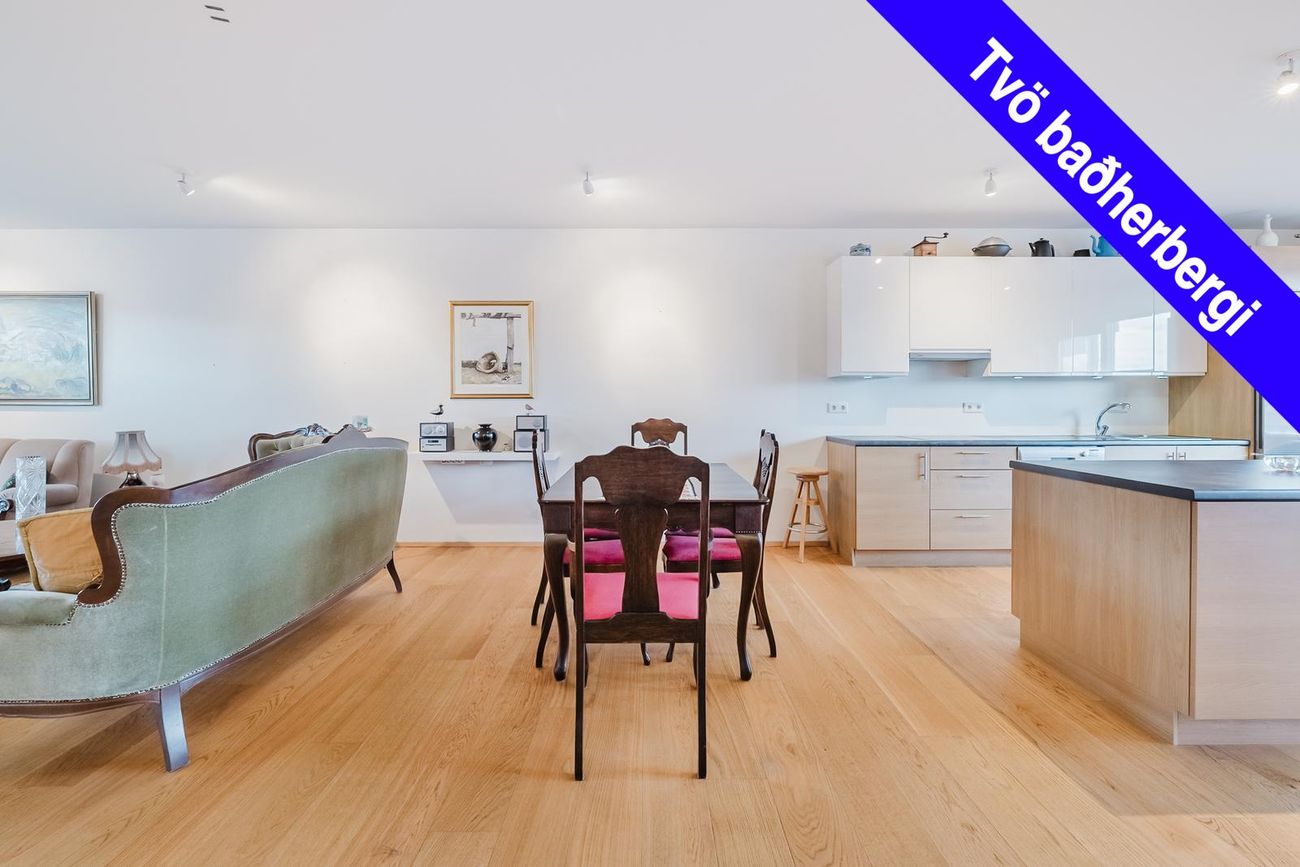 Björt rúmgóð stofa/borðstofa og eldhús í sama alrýminu, útgengt á