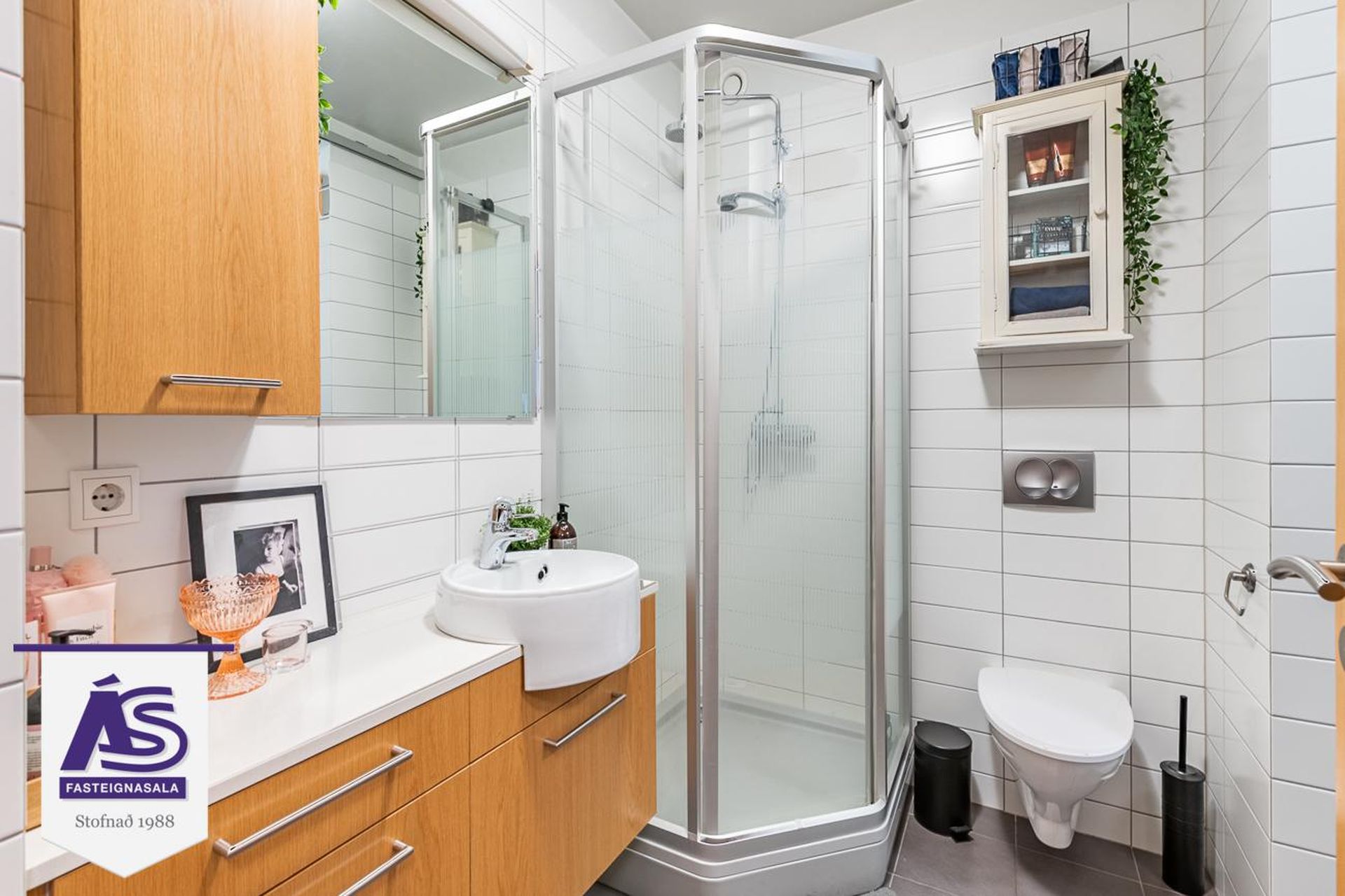Baðherbergi : innaf hjónaherbergi með baðkari og innréttingu, flísar á gólfi og veggjum.