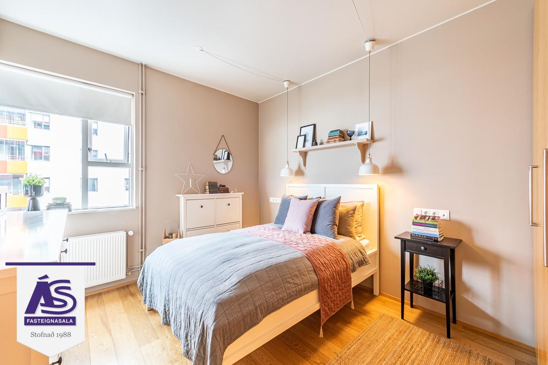 Hjónaherbergi : með innbyggðum skápum, parketi á gólfi.