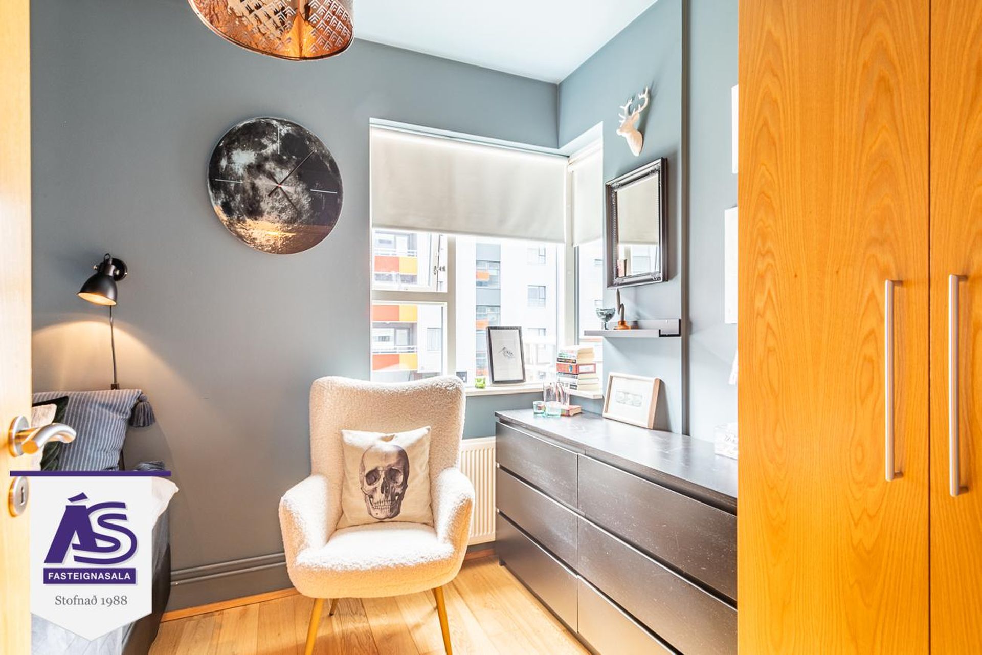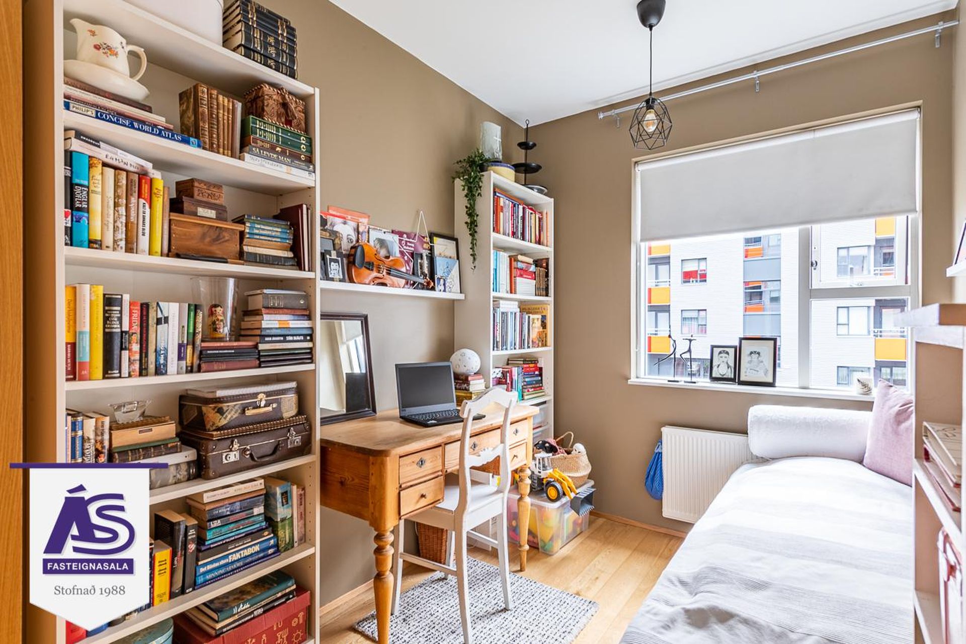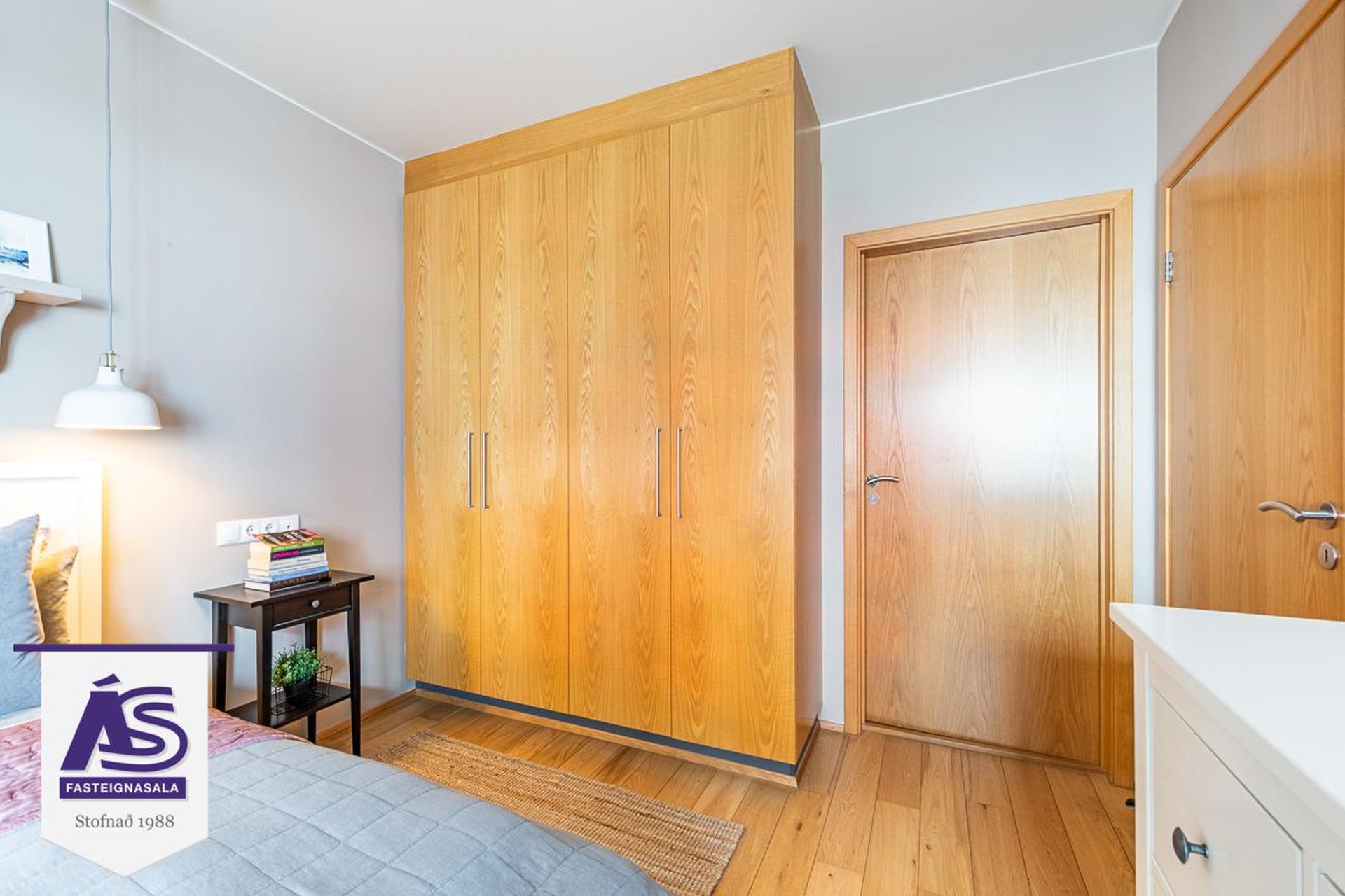 Svefnherbergi : tvö rúmgóð með skápum, parketi á gólfi.