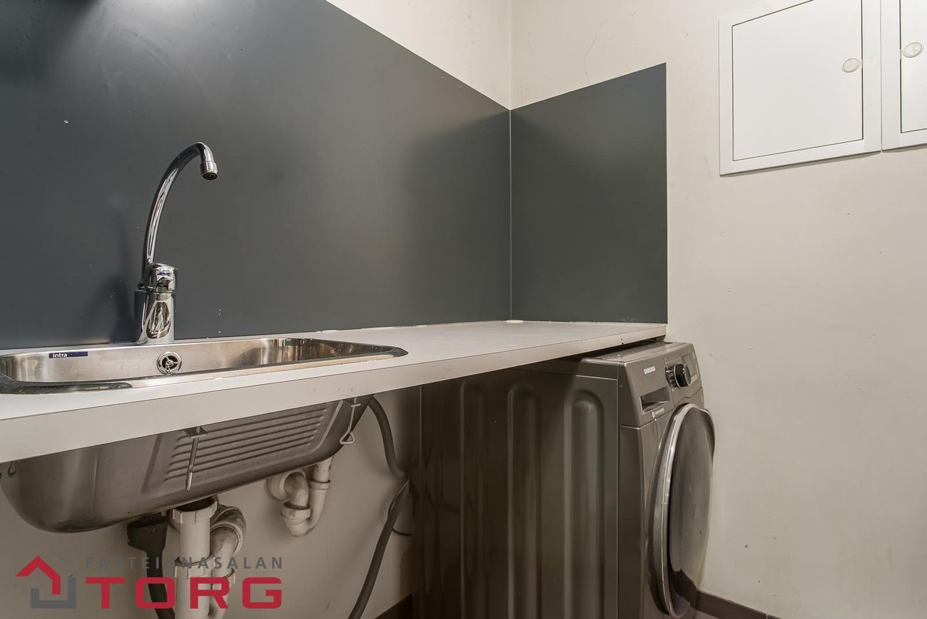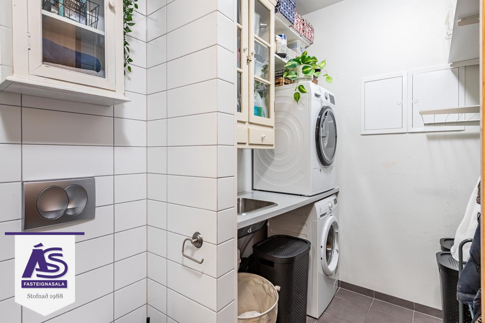 Þvottahús : innaf baðherbergi með vinnuborði, flísar á gólfi.