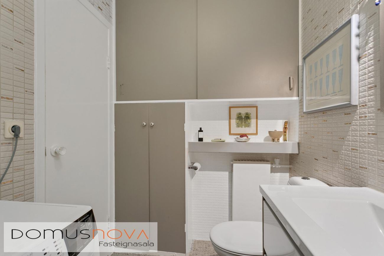 Baðherbergi er flísalagt í hólf og gólf. Baðkar með sturtuaðstöðu, snyrtileg innrétting og tengi fyrir þvottavél. Baðinnrétting, blöndunartæki og vaskur endurnýjað 2019.