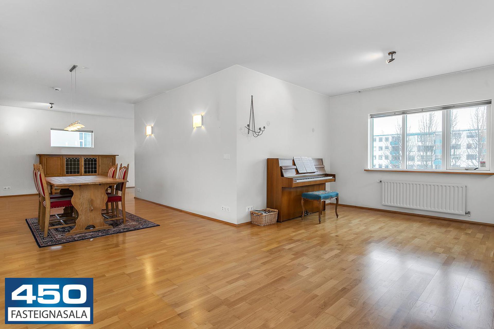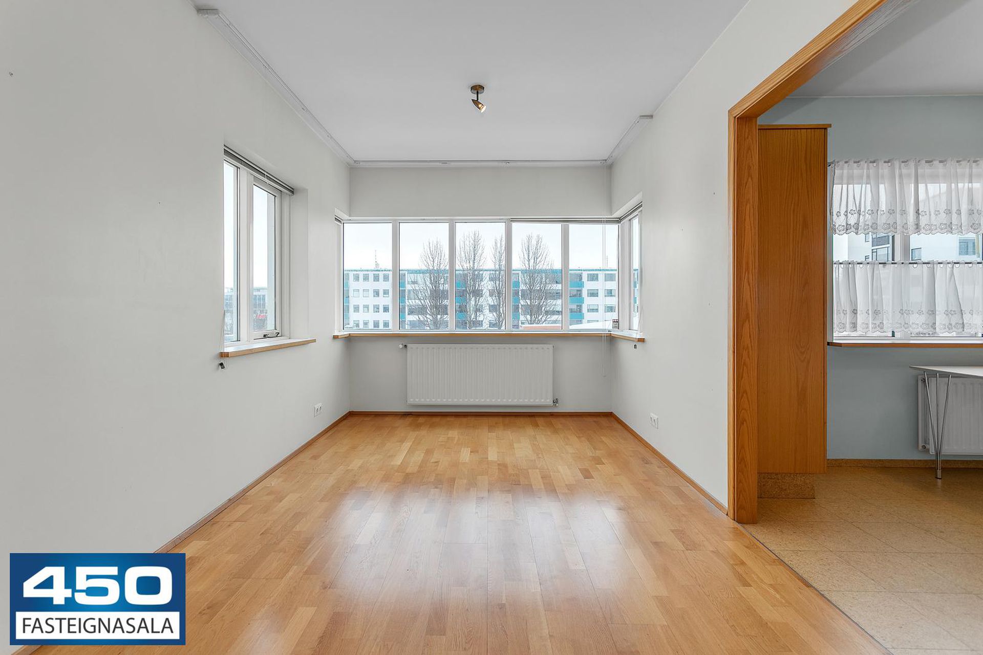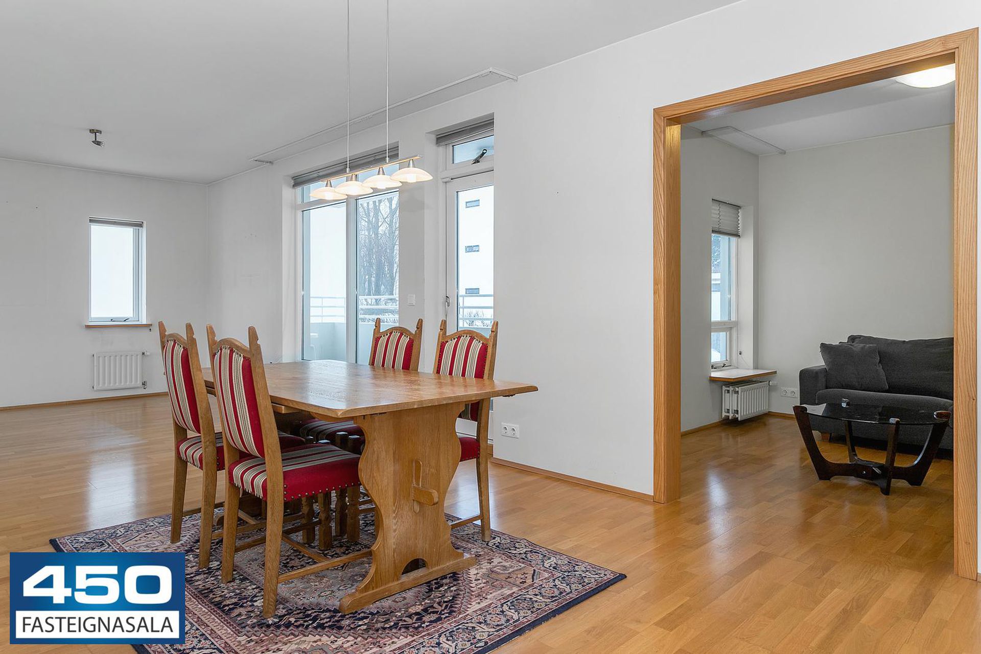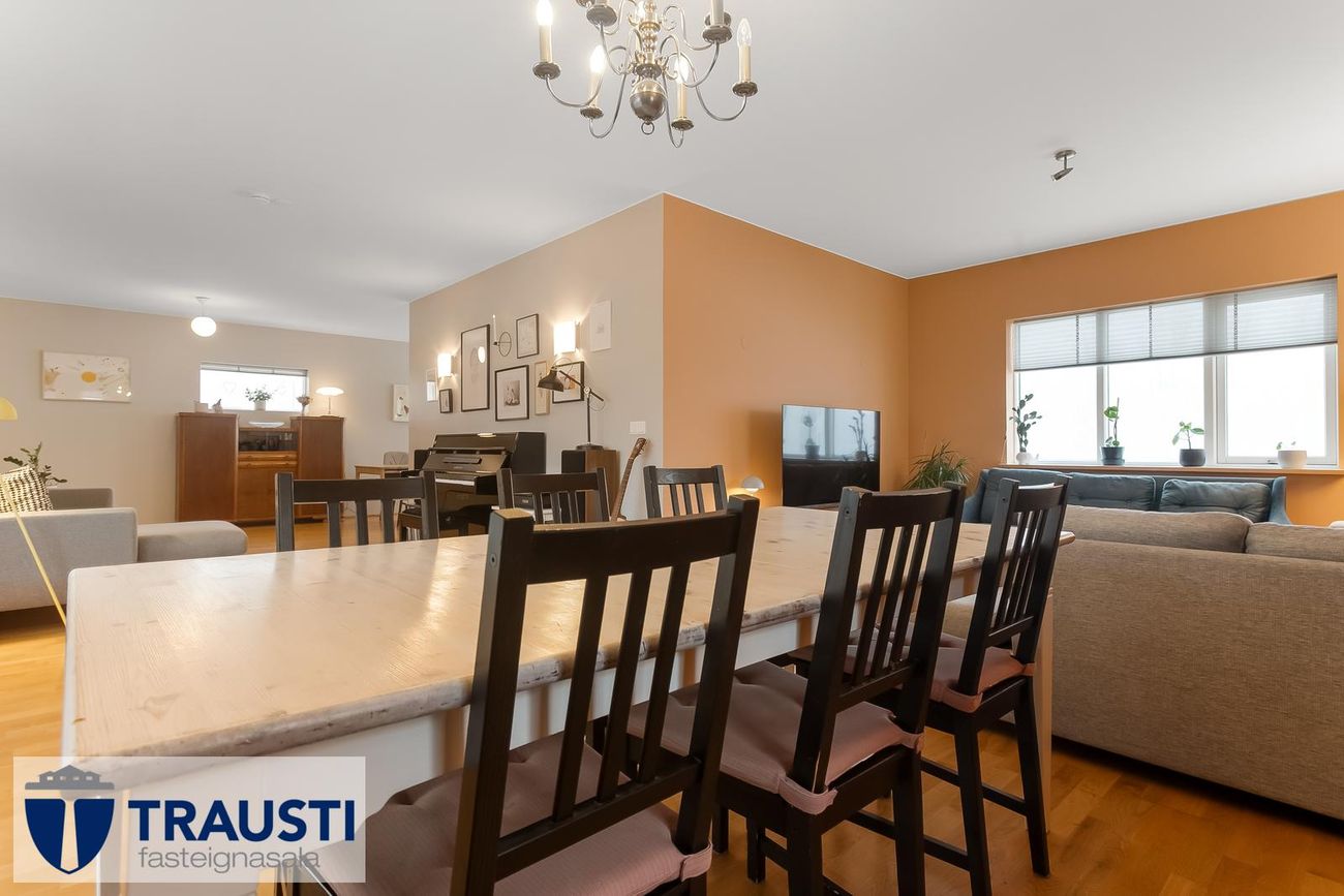 Þrískipt stofa/borðstofa í U-laga um eldhús með parketgólfi. Rúmgóð með möguleikum.