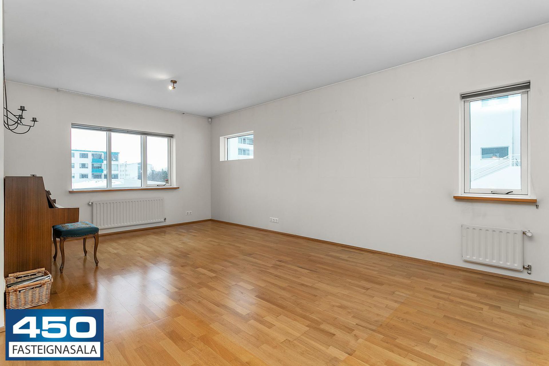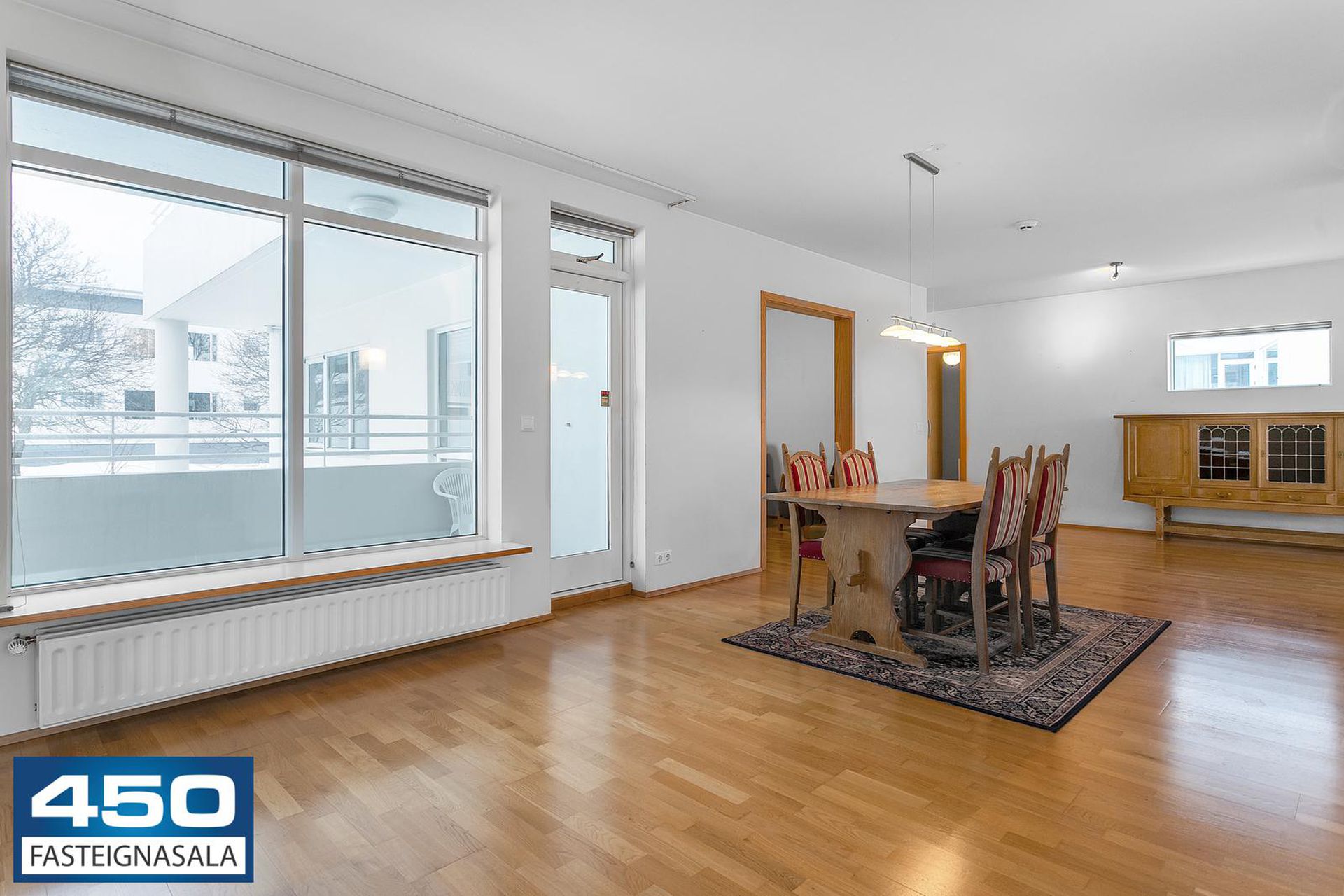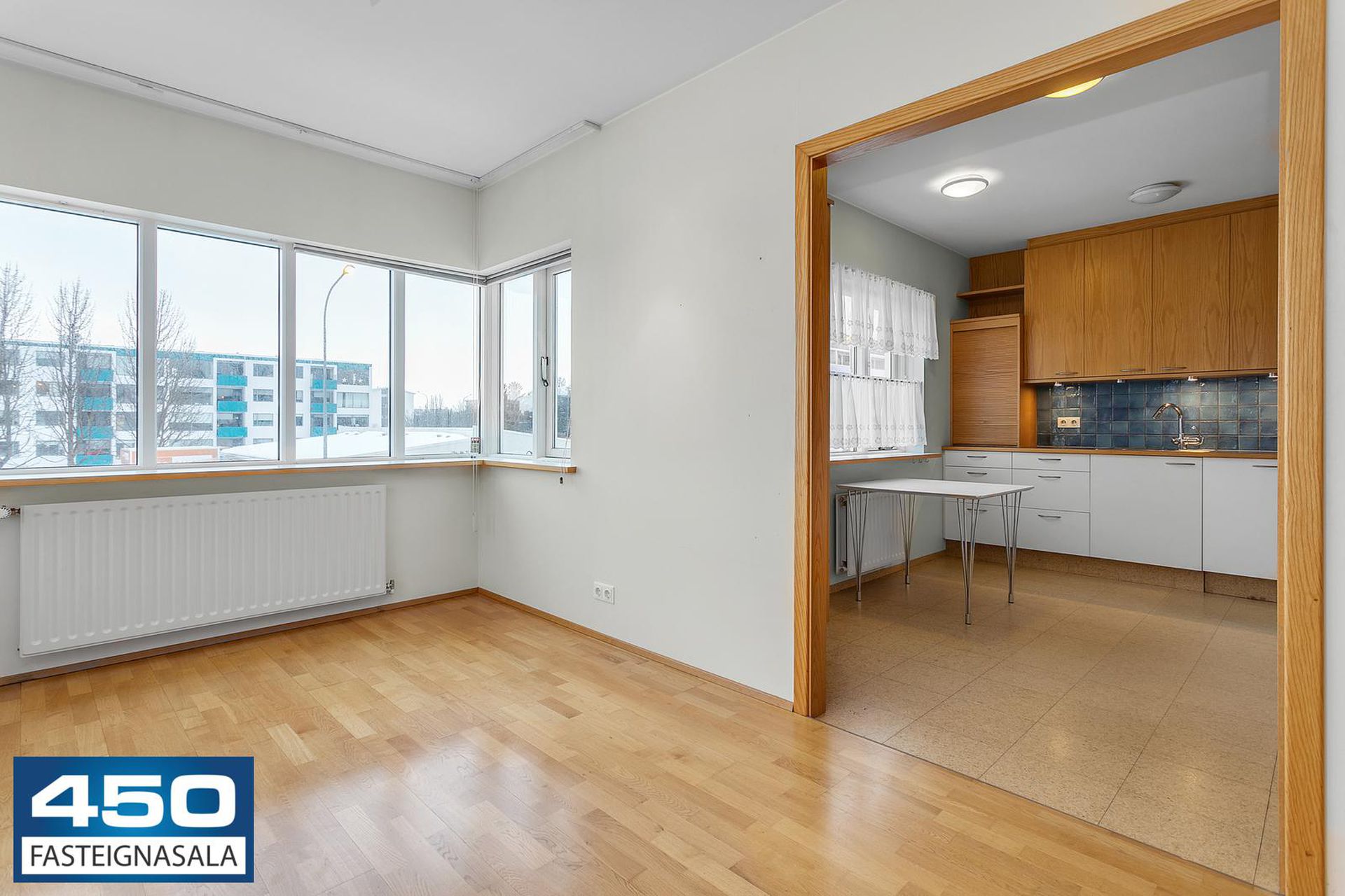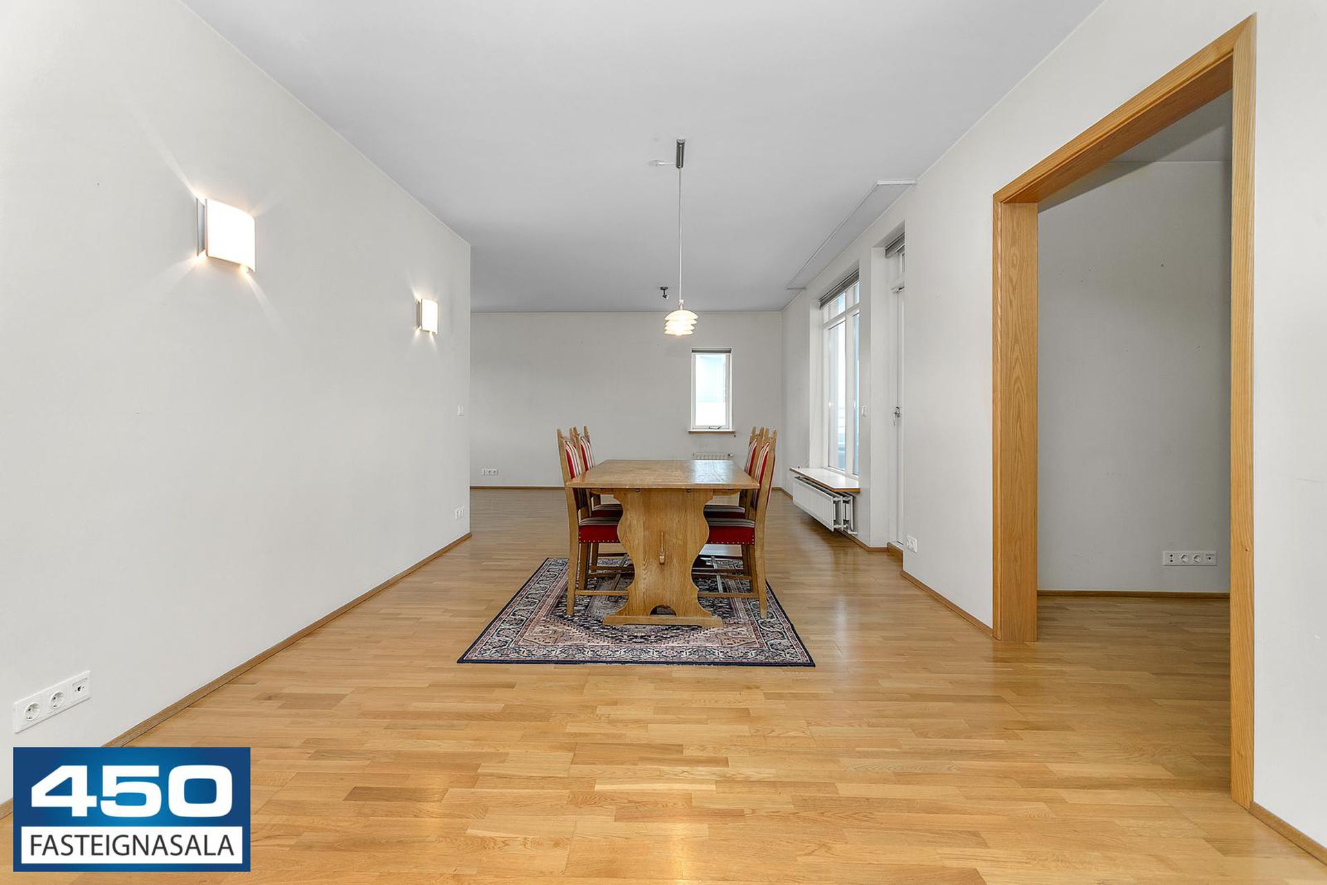 Þrískipt stofa/borðstofa í U-laga um eldhús með parketgólfi. Rúmgóð með möguleikum.